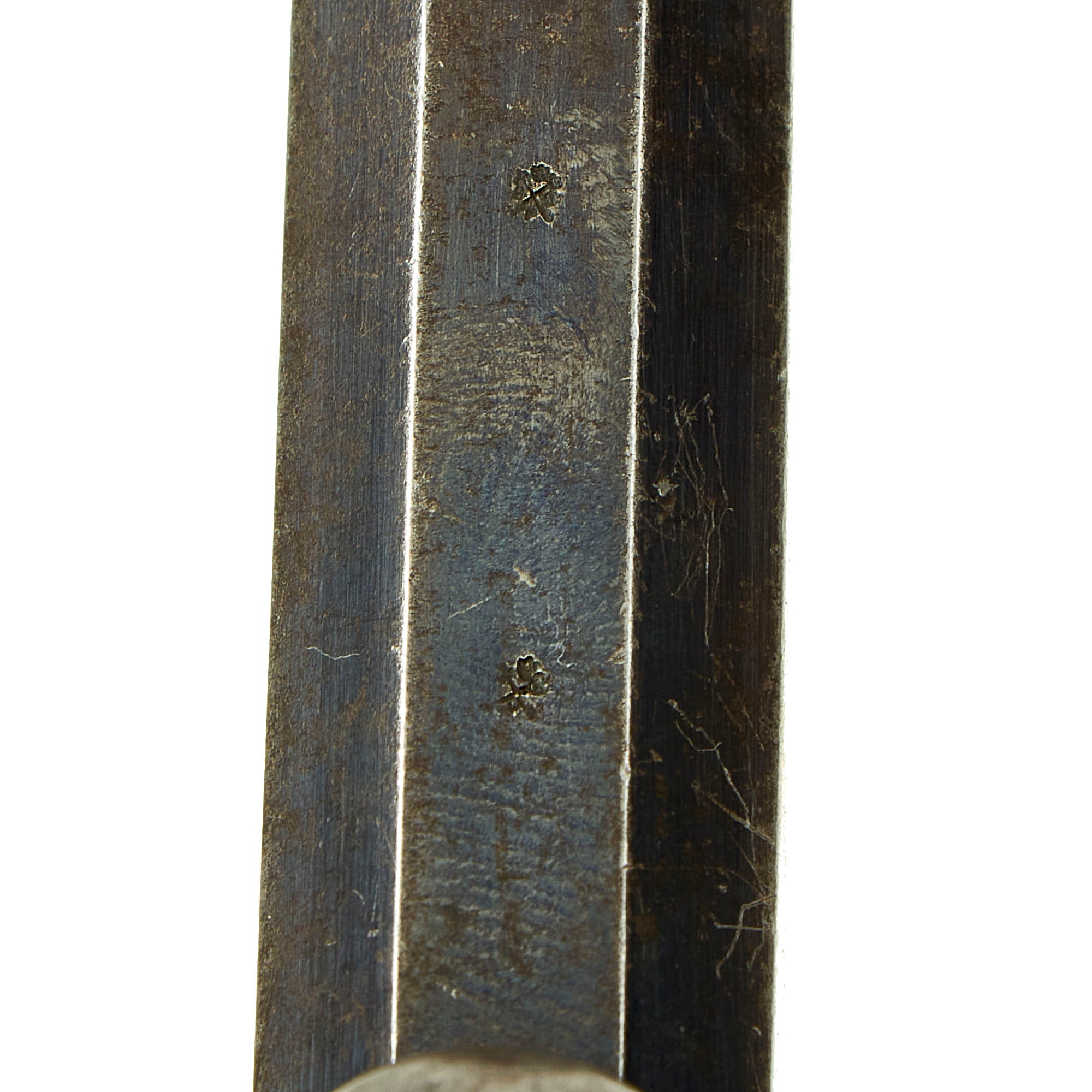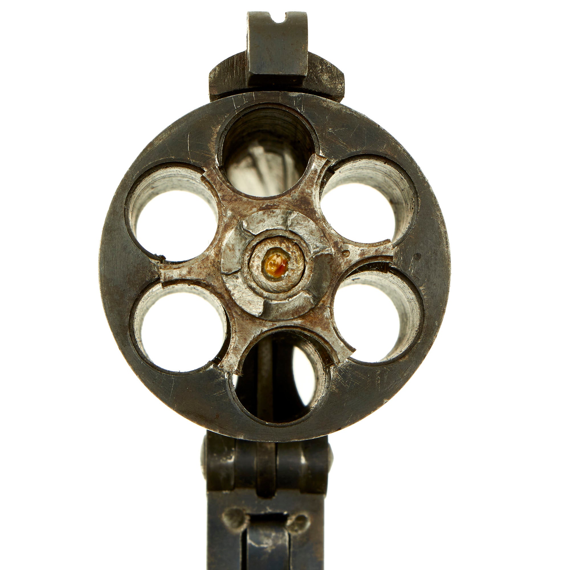 There is no caliber marking that we could find on the revolver, but the bore measures about .440" land to land at both the muzzle and the breech end, with the cylinder chambers measuring about .460" at the muzzle and .486" at the breech ends. The cylinder is only 1.315 inches long, which is too short for both .476 Enfield or .455 Webley, so we assume this is for .45 Adams / Boxer.