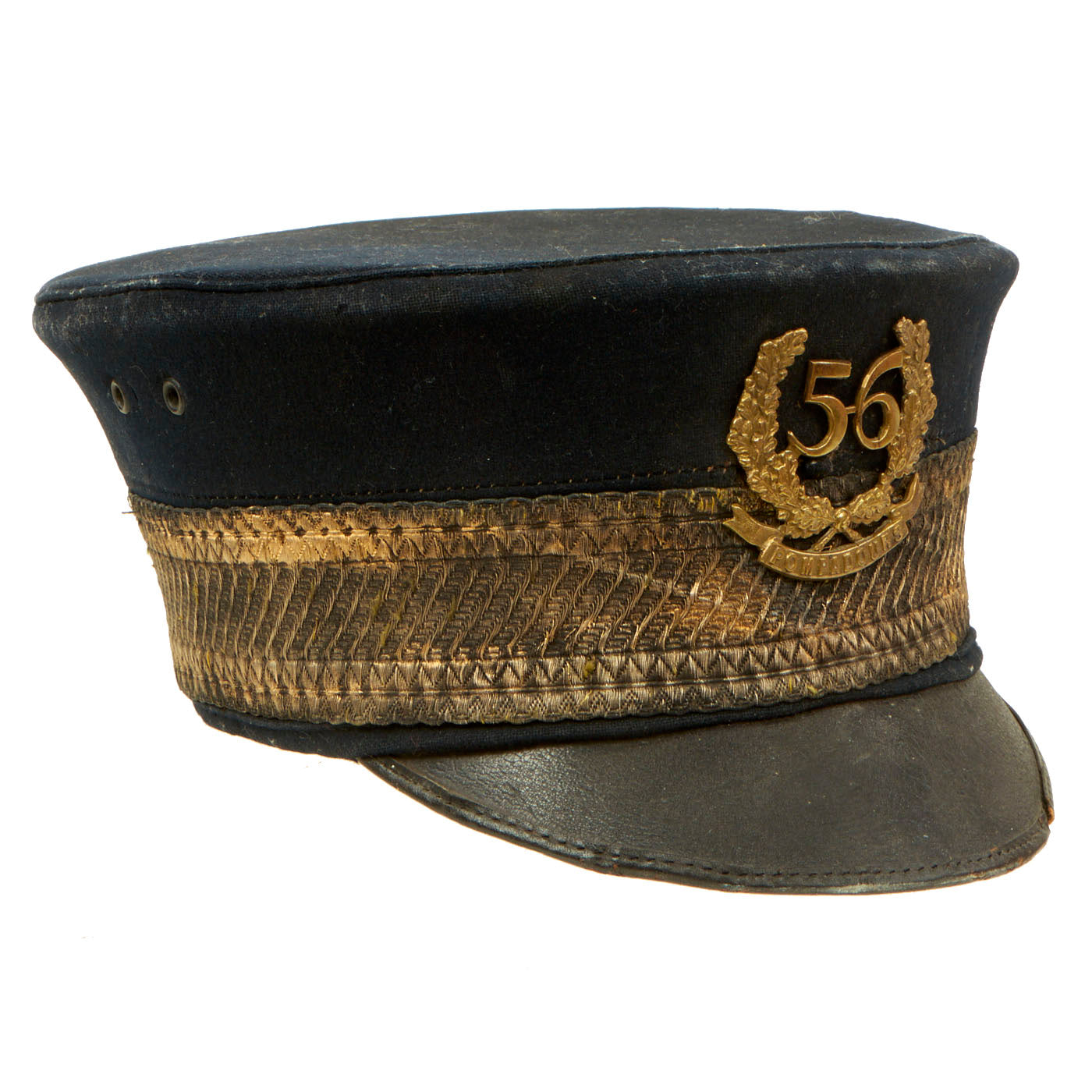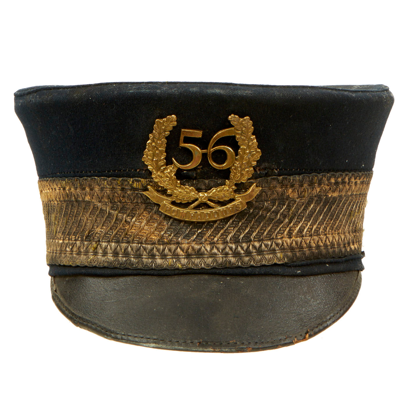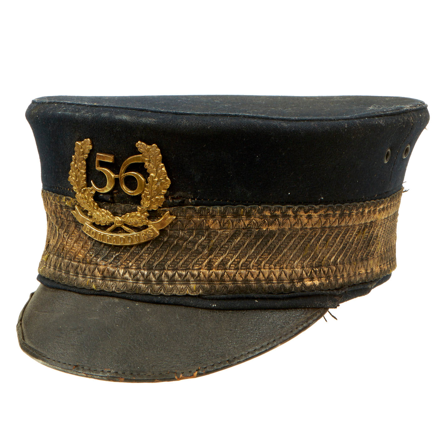 Original Item: One of a Kind. Here we have a very nice Victorian short brim forage cap, dating from the Crimean War era. The front of the cap bears a large wreathed 56 over POMPADOURS, the nickname of the 56th (the West Essex) Regiment of Foot. It is contained in a very nice steel cap tin, named to G. W. TRIGGS on a large bronze name plate attached to the top.