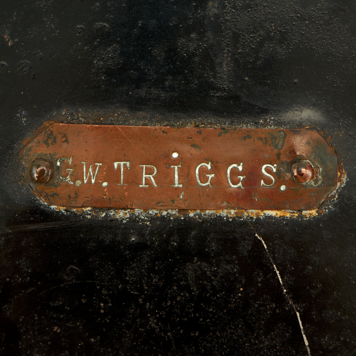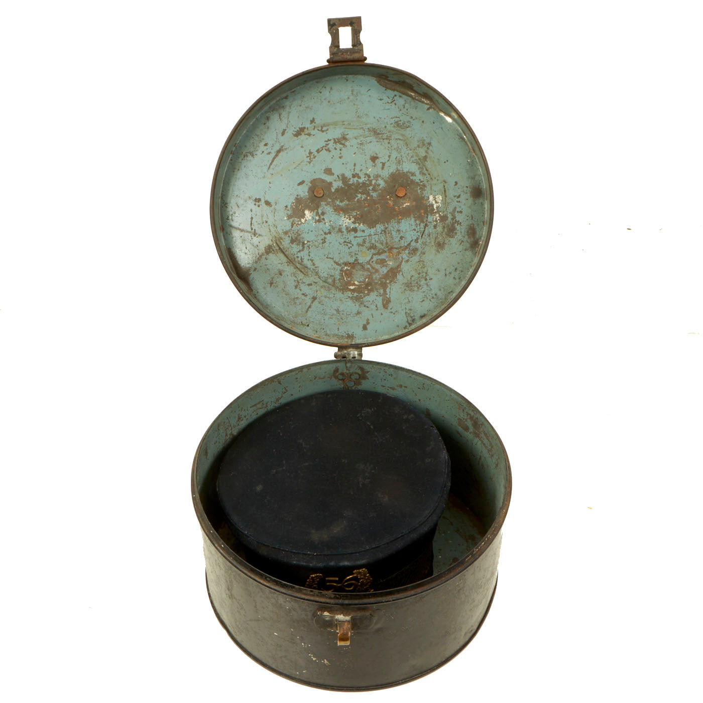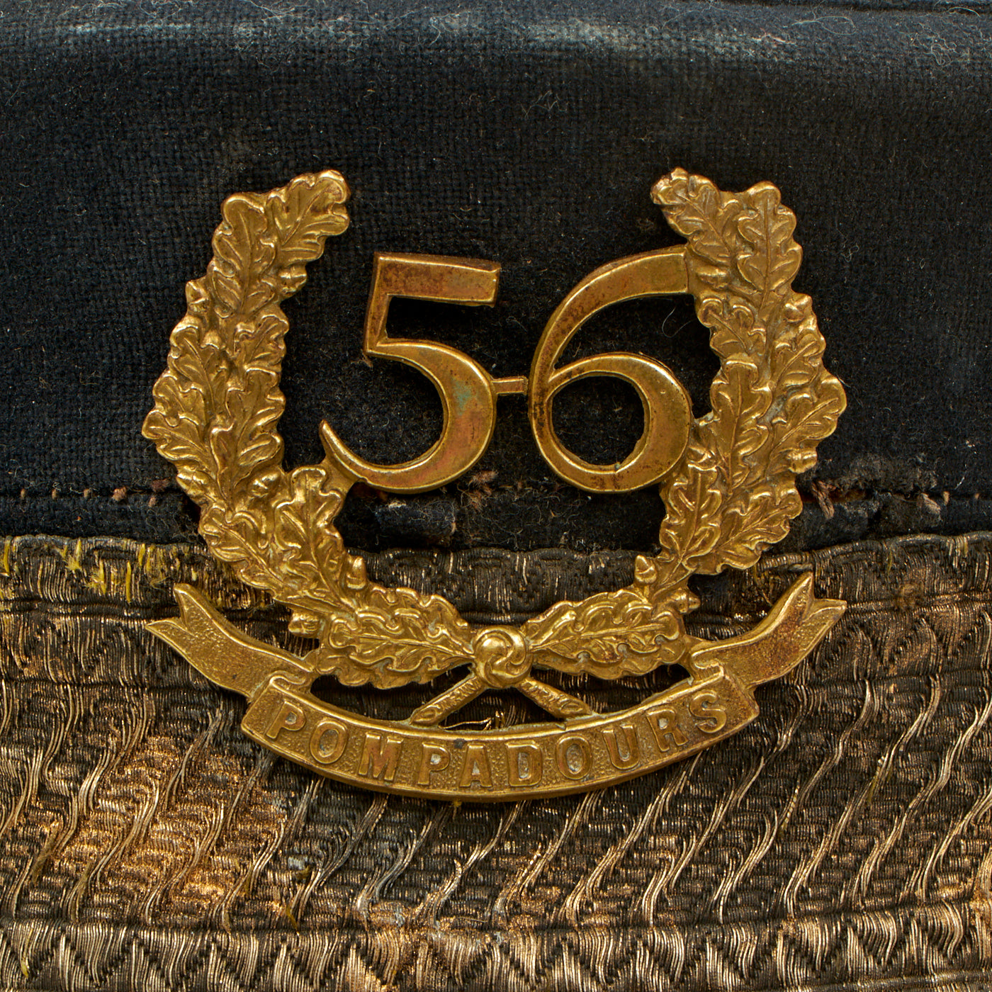 Original Item: One of a Kind. Here we have a very nice Victorian short brim forage cap, dating from the Crimean War era. The front of the cap bears a large wreathed 56 over POMPADOURS, the nickname of the 56th (the West Essex) Regiment of Foot. It is contained in a very nice steel cap tin, named to G. W. TRIGGS on a large bronze name plate attached to the top.