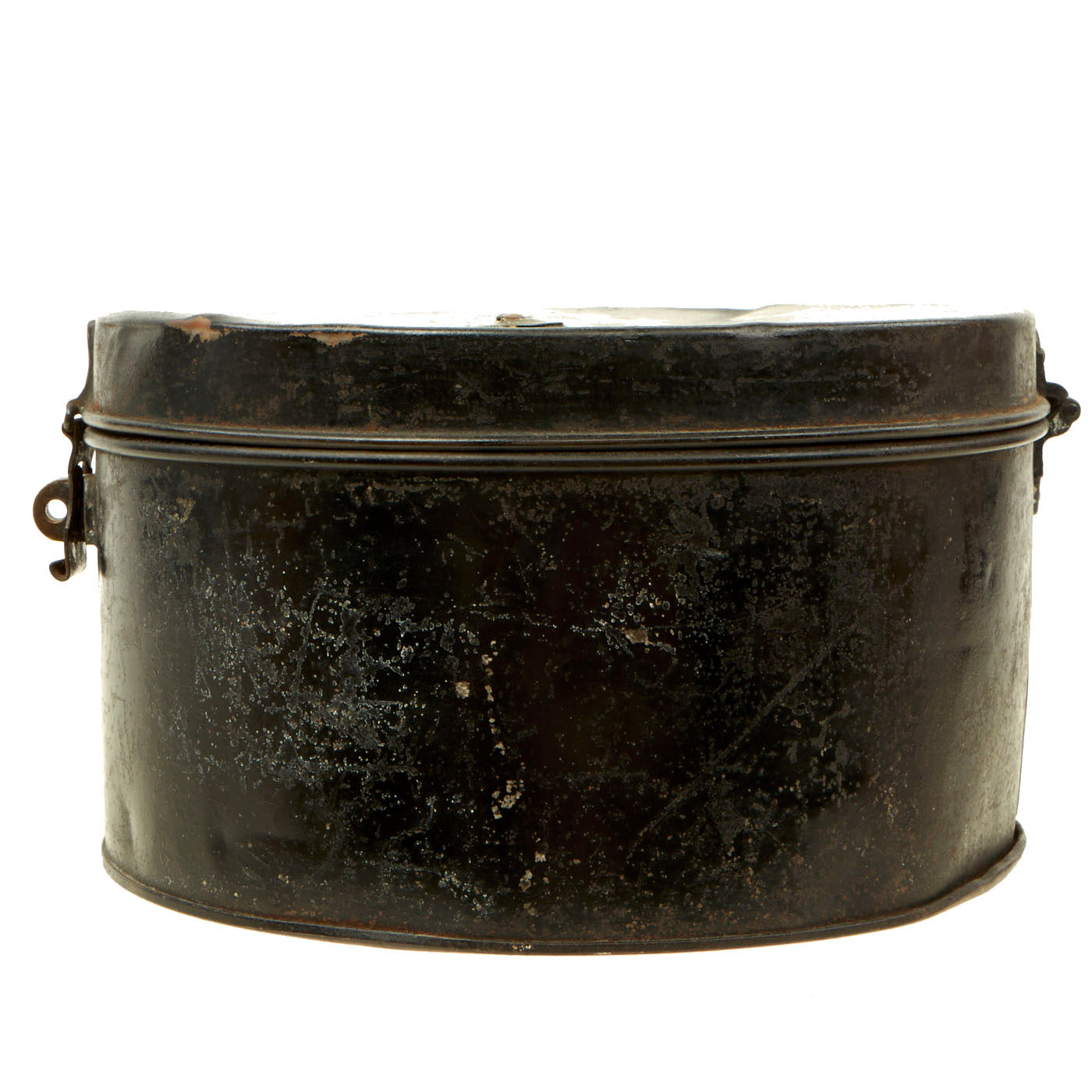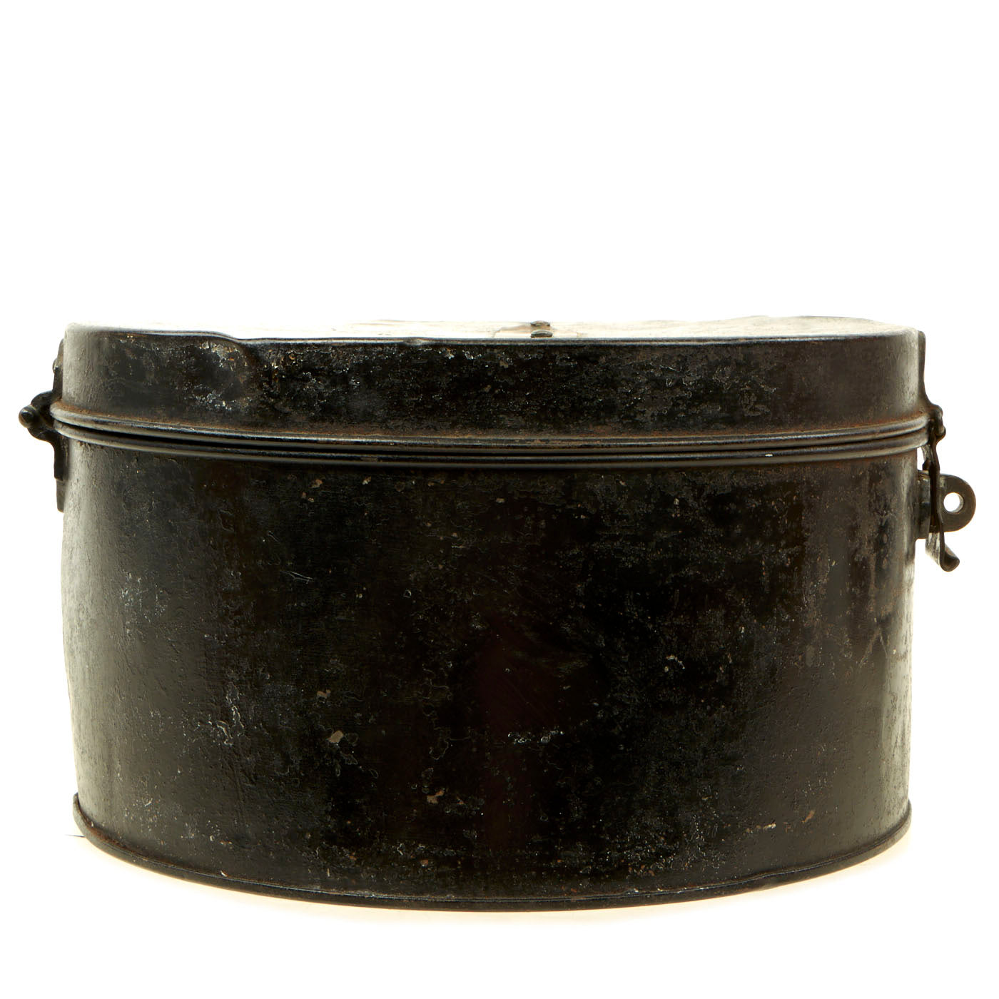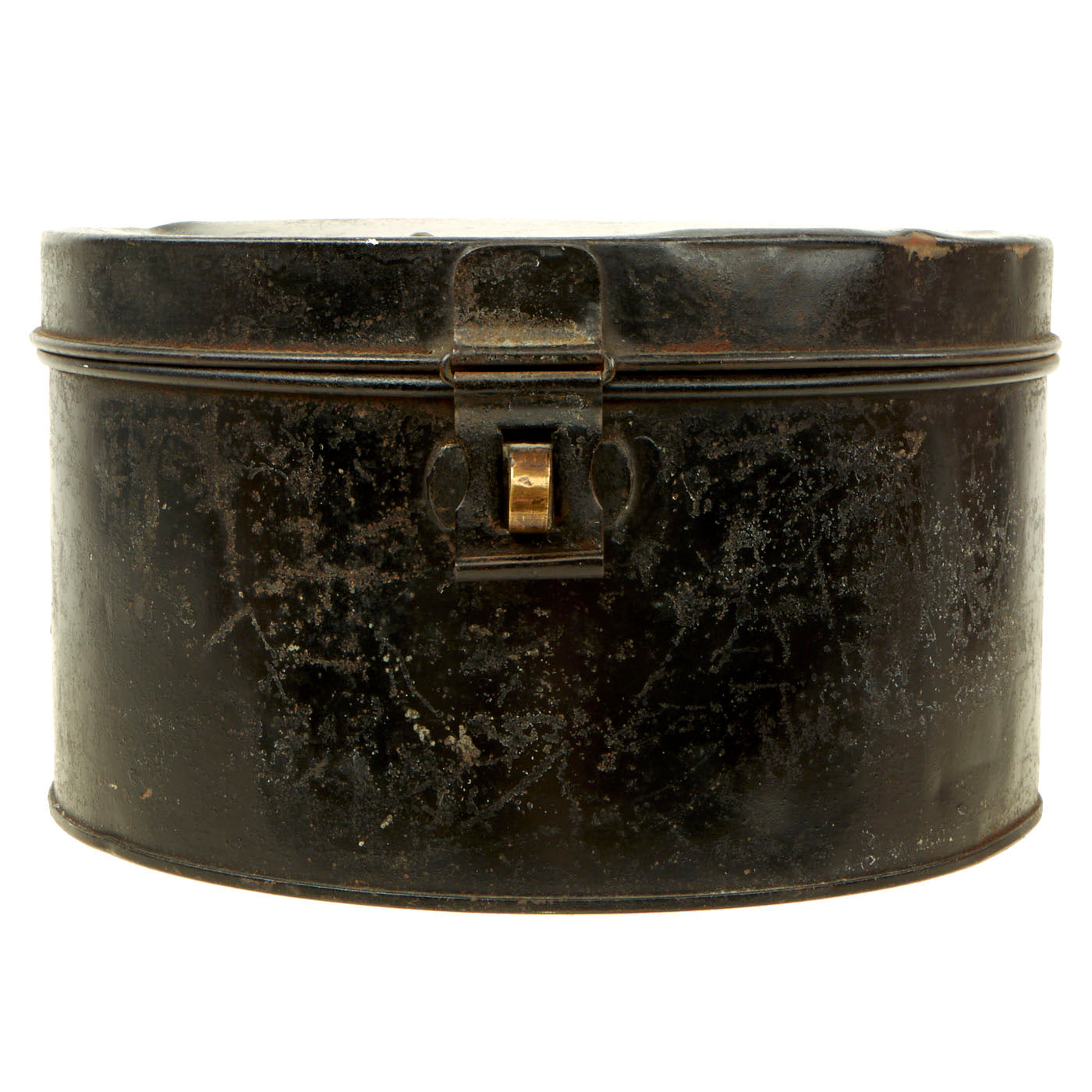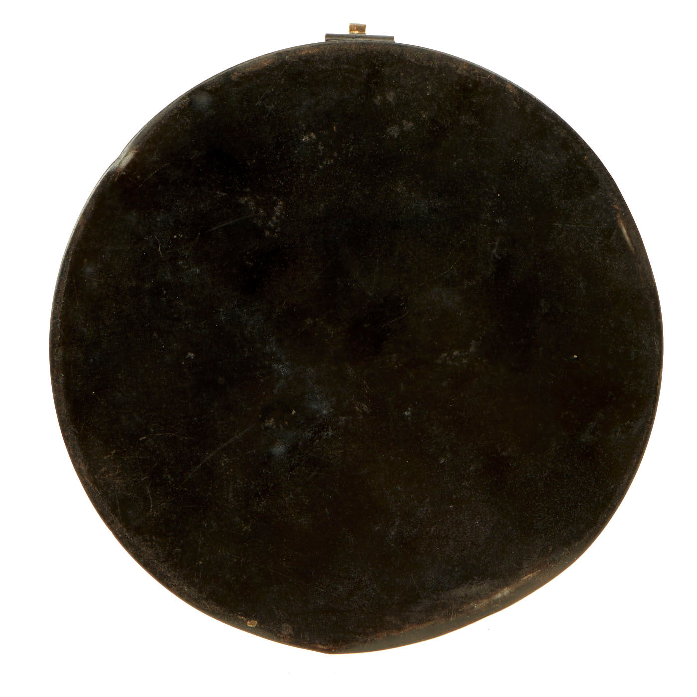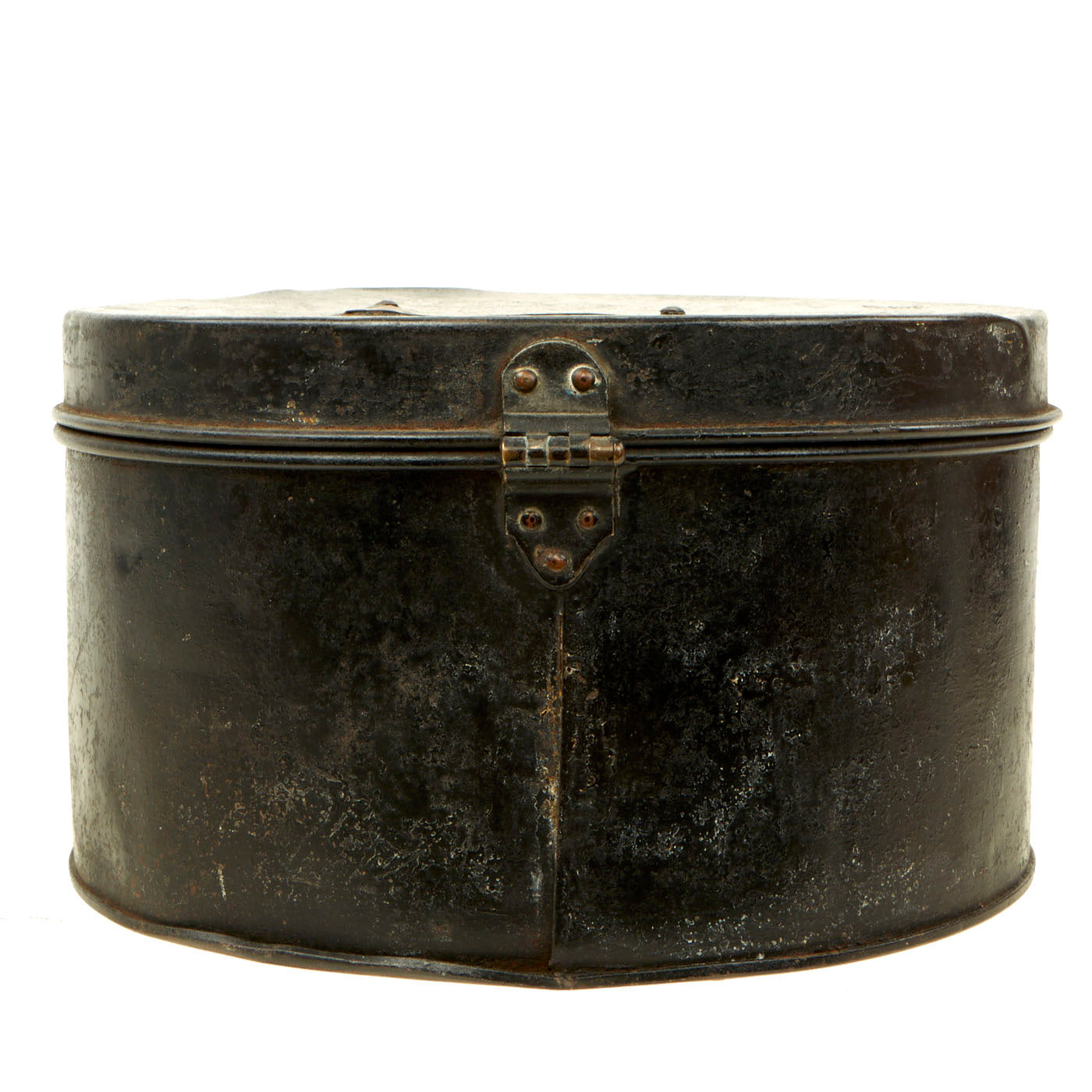 The cap tin is in very good shape and well, with a black painted exterior, and copper and lacquer lined interior. The tin measures approximately 10 1/2 inches in diameter, with a height of 6 inches. The tin opens and closes correctly, with a latch that still holds. Overall condition is very good, with wear commensurate with age.