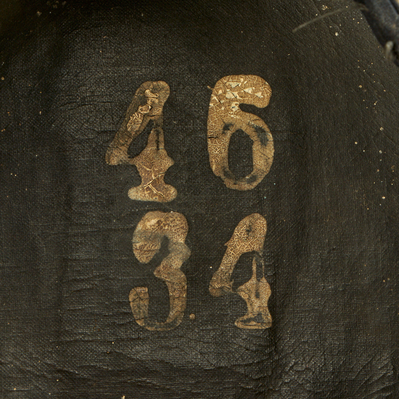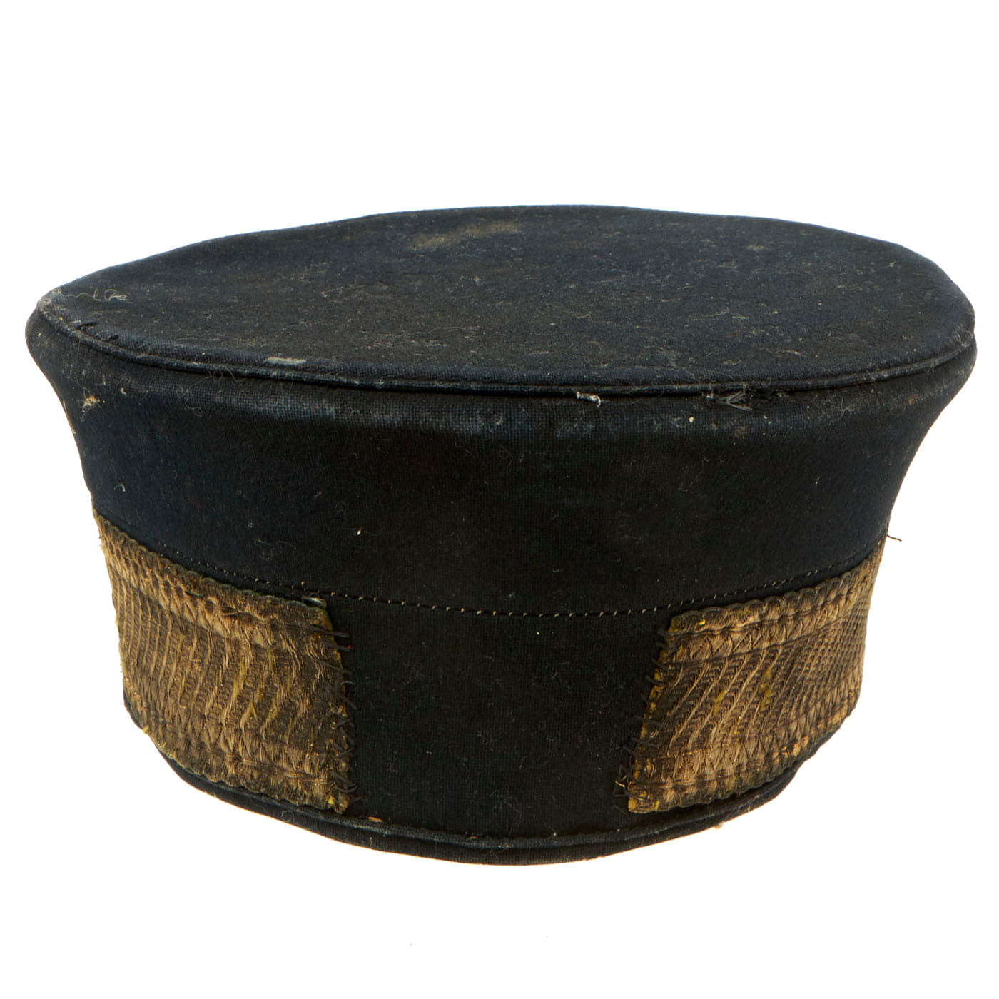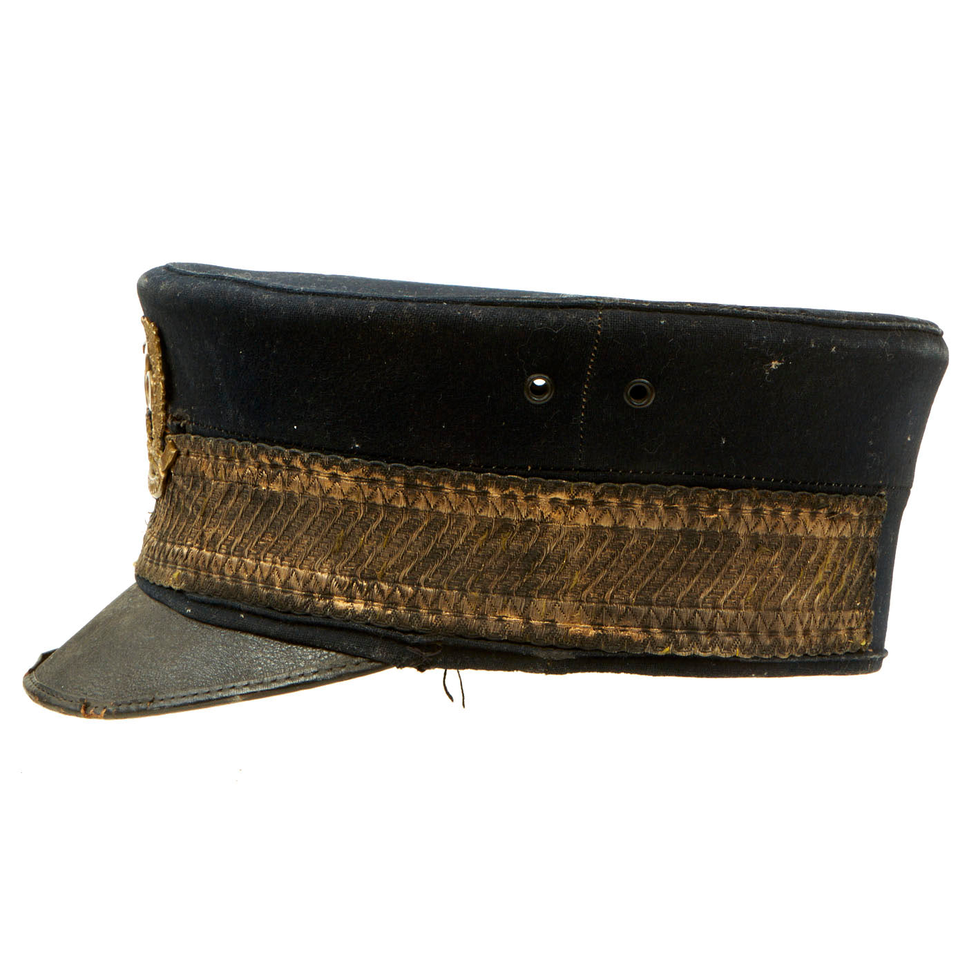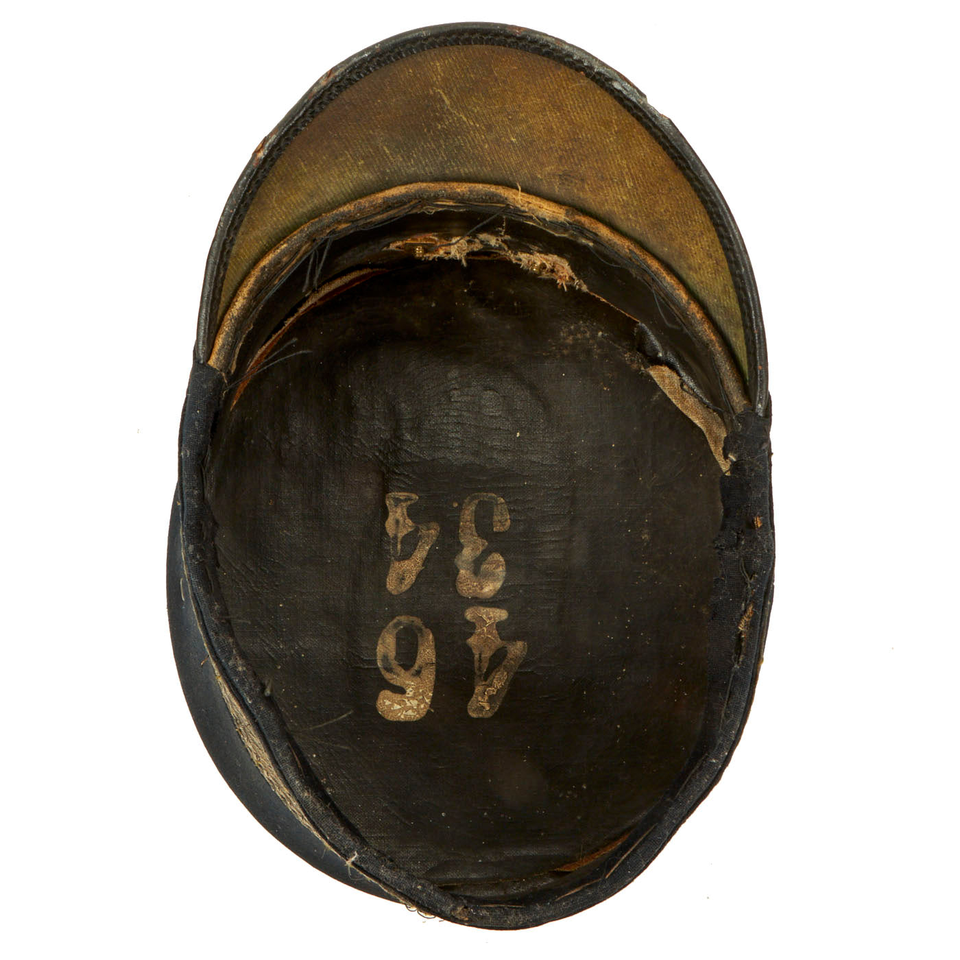 The cap itself is the typical ornate late Victorian style, and is said to be heavily "gimped", or adorned in embroidered wire thread designs. "Gimp" wire is quite thick and used mostly for jewelry, so this is much more likely a "French Wire" embroidered band around the entire circumference of the cap. The interior of the cap does not have any maker mark, but is marked 46 / 34 on the top. It looks like the original liner or sweatband has been completely lost, with just some stitching around the edge showing where it used to be attached. The cap definitely shows wear and age, along with some mothing on the crown.