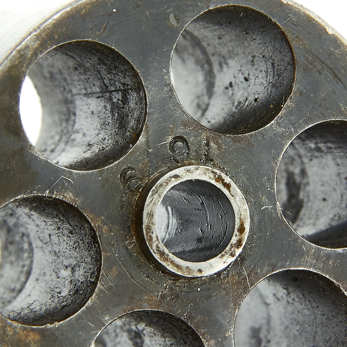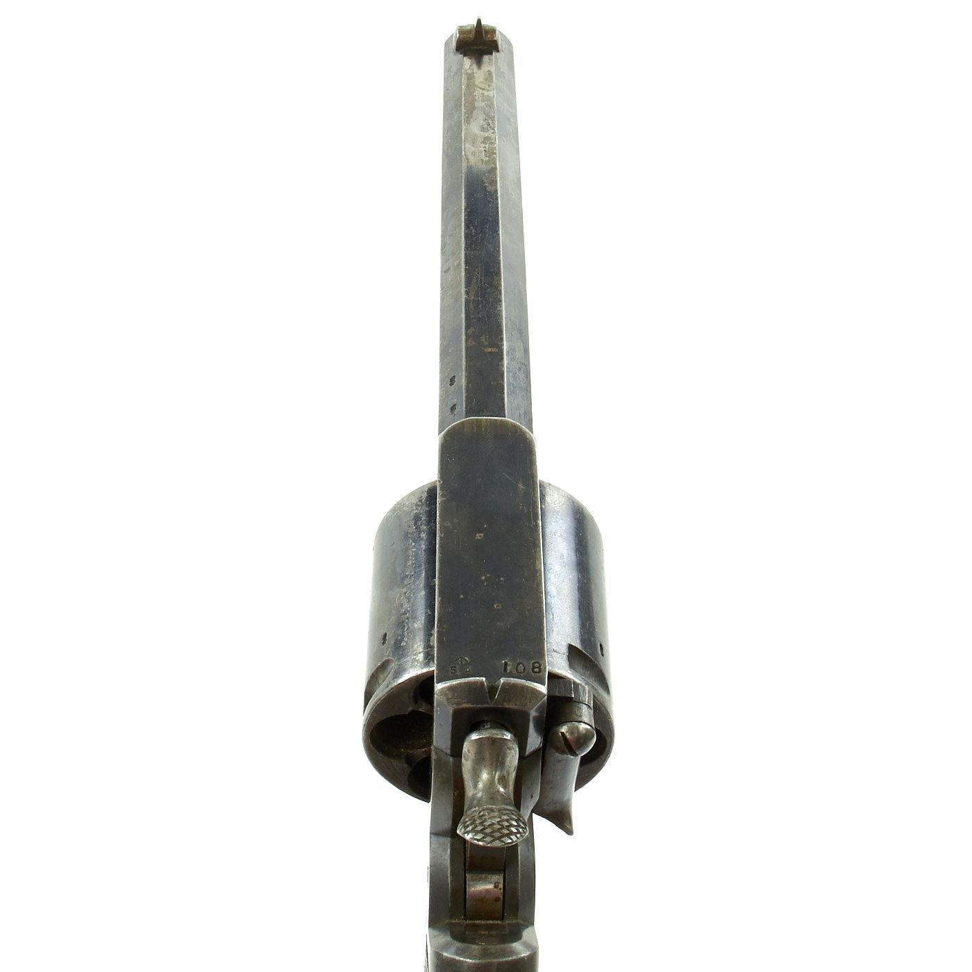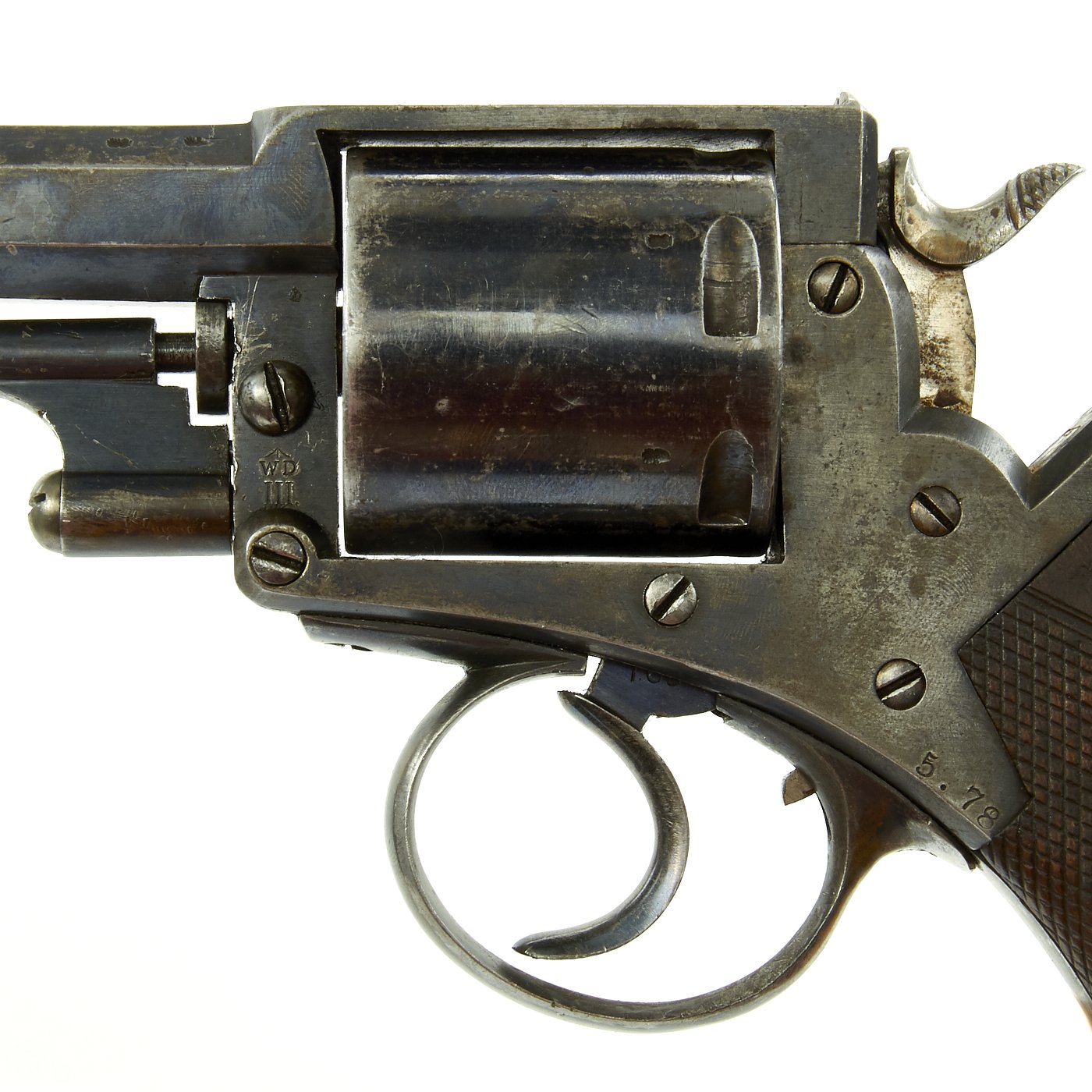 This revolver is complete, with no missing or replaced parts that we can find. The wood grips, still fully and fairly crisply checkered, are in fine condition. The revolver metalwork is still shows a lot of the original finish, and there is even still case hardening visible in areas.. The bore shows clear rifling, and has a nice mostly bright finish, so this revolver most likely did not see much use in service.