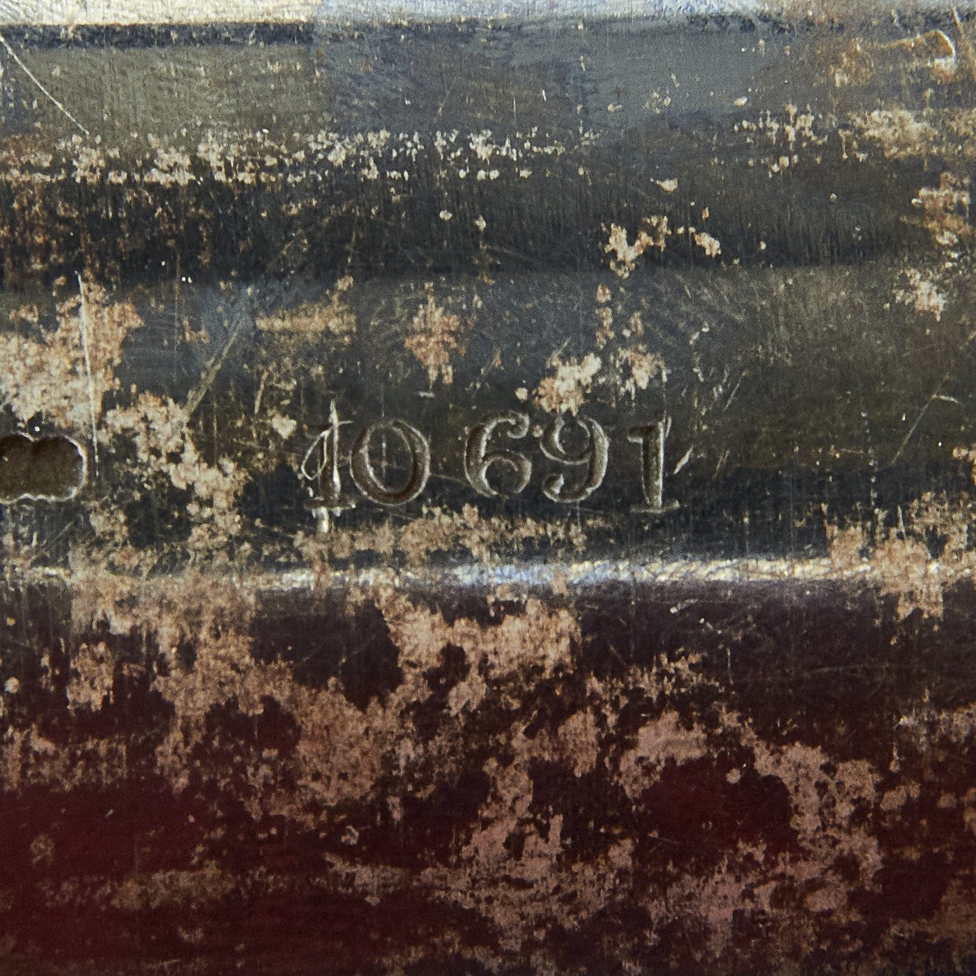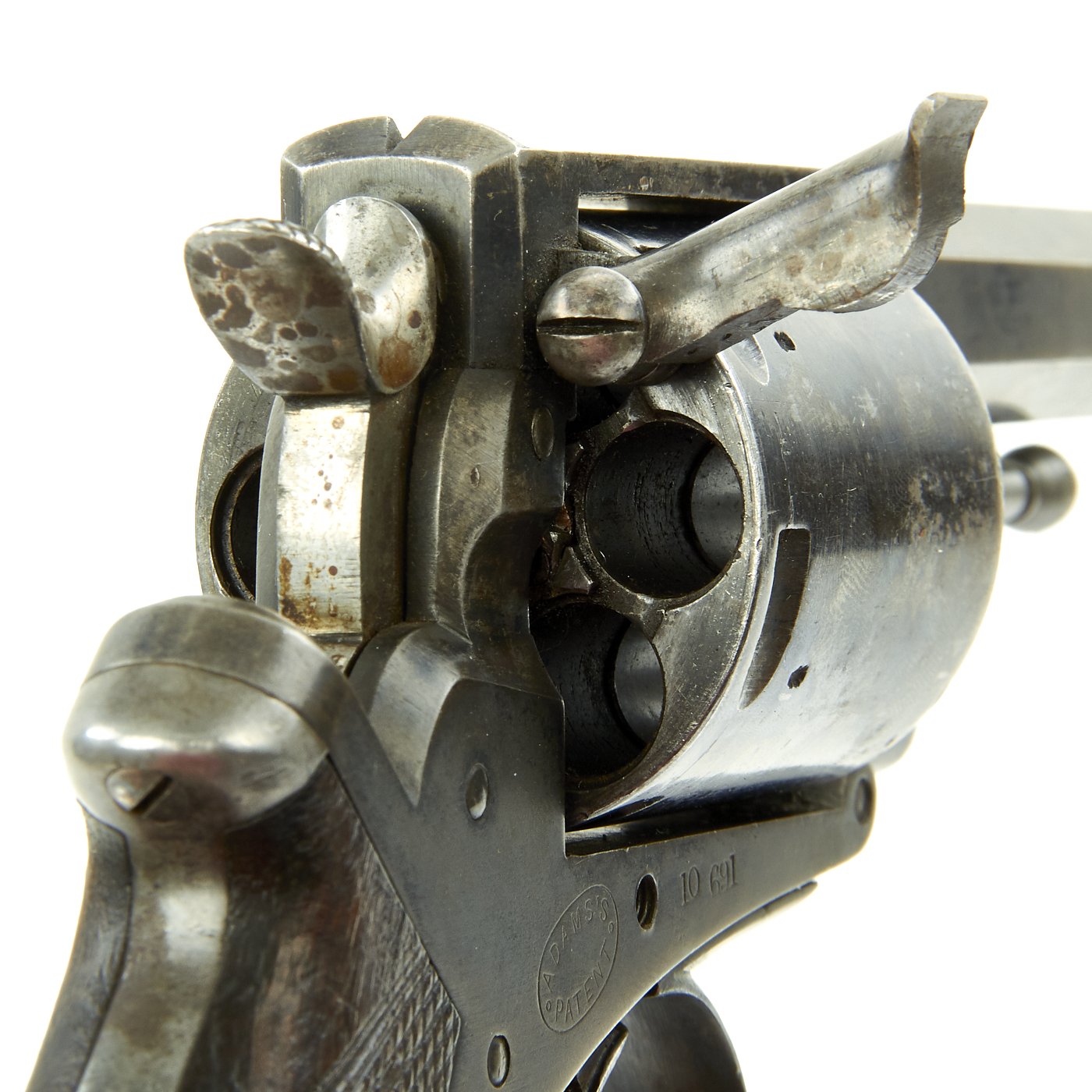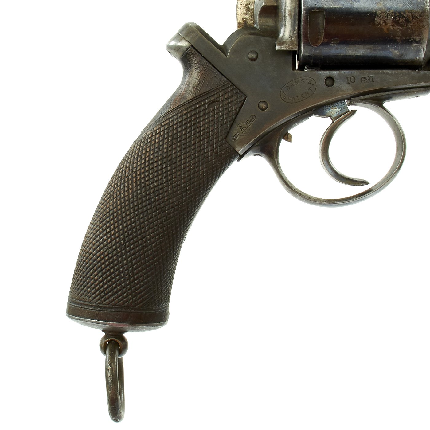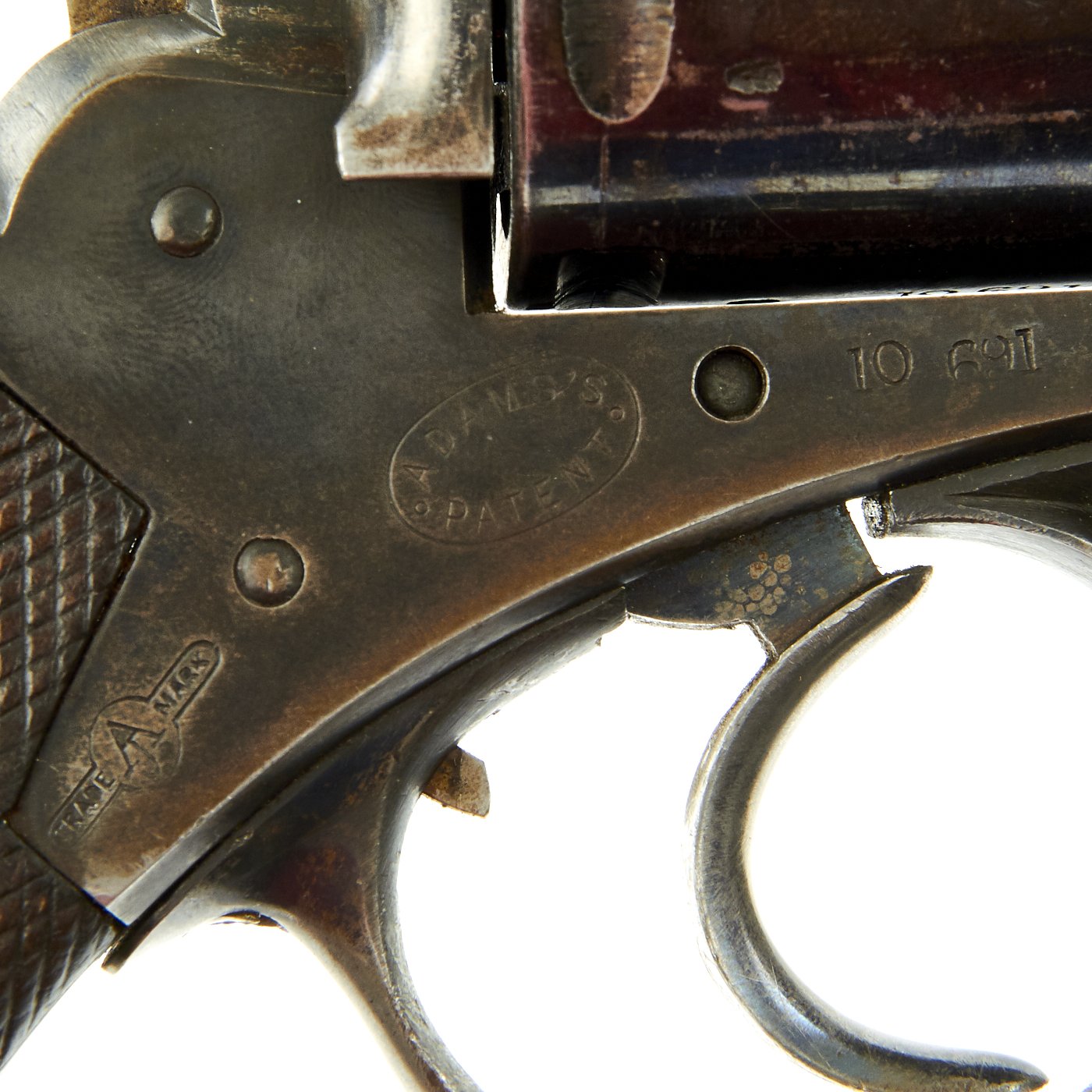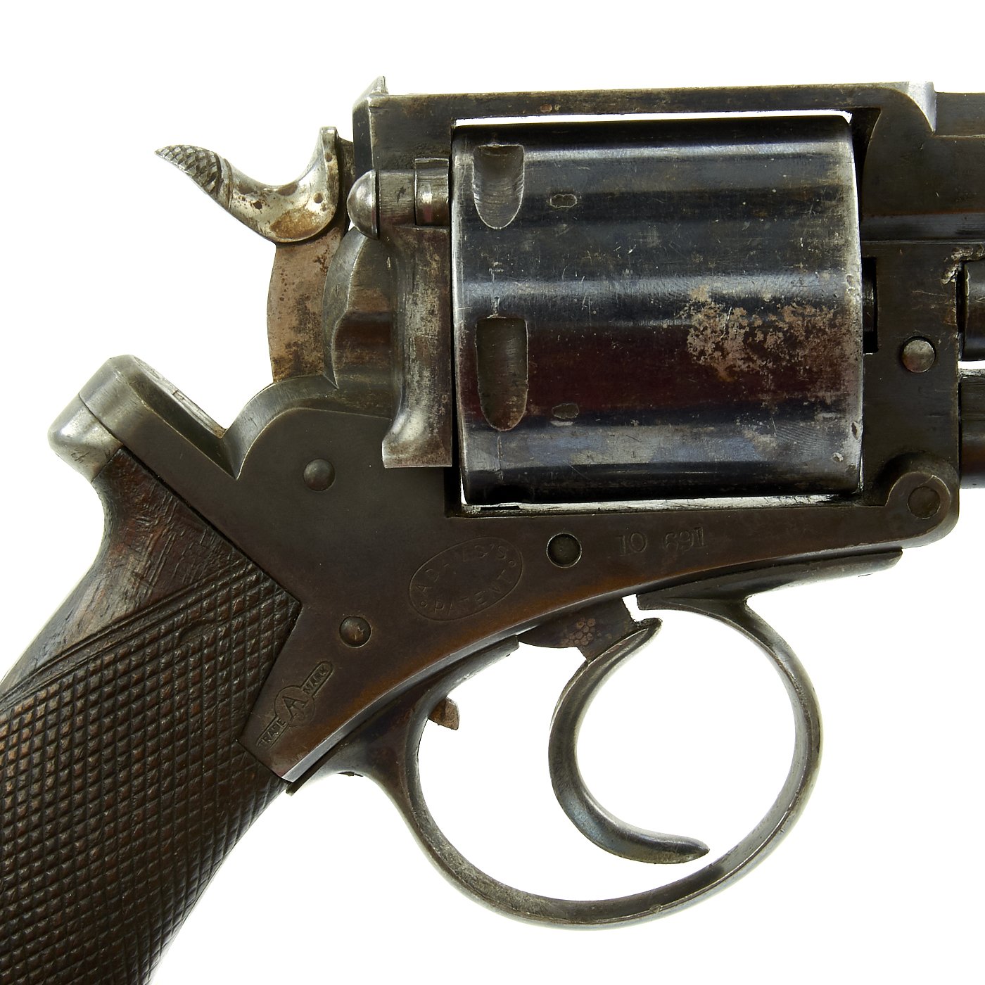 This Revolver is marked ADAMS'S PATENT on the frame along with the Adams's trademark symbol. The right side of the frame is marked with BROAD ARROW / W.D. / III, the War Department acceptance mark, and indication that it is a Mk III revolver. The frame and cylinder bear various other proof and acceptance markings. The revolver is also marked with serial number 10691 on the frame and cylinder. The trigger, barrel axis pin, and barrel frame underneath the hammer are marked with shortened number 691, so this is an ALL MATCHING example.