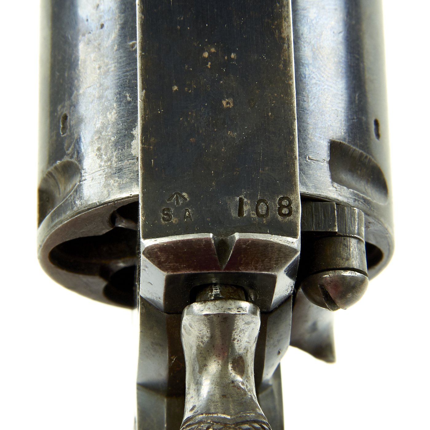 The best marking however is right over the trigger guard by the grip: 5 . 78. This date of May 1878 puts it clearly before the Zulu War period, so it is definitely a possibility that it saw service during that conflict in Africa. It is also marked Broad Arrow / S A next to 108, indicating possible South African issue after the conflict, so this revolver was almost certainly in Africa.