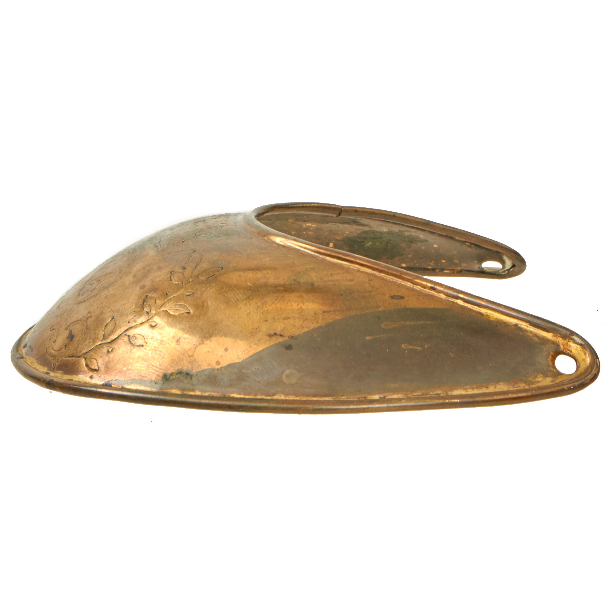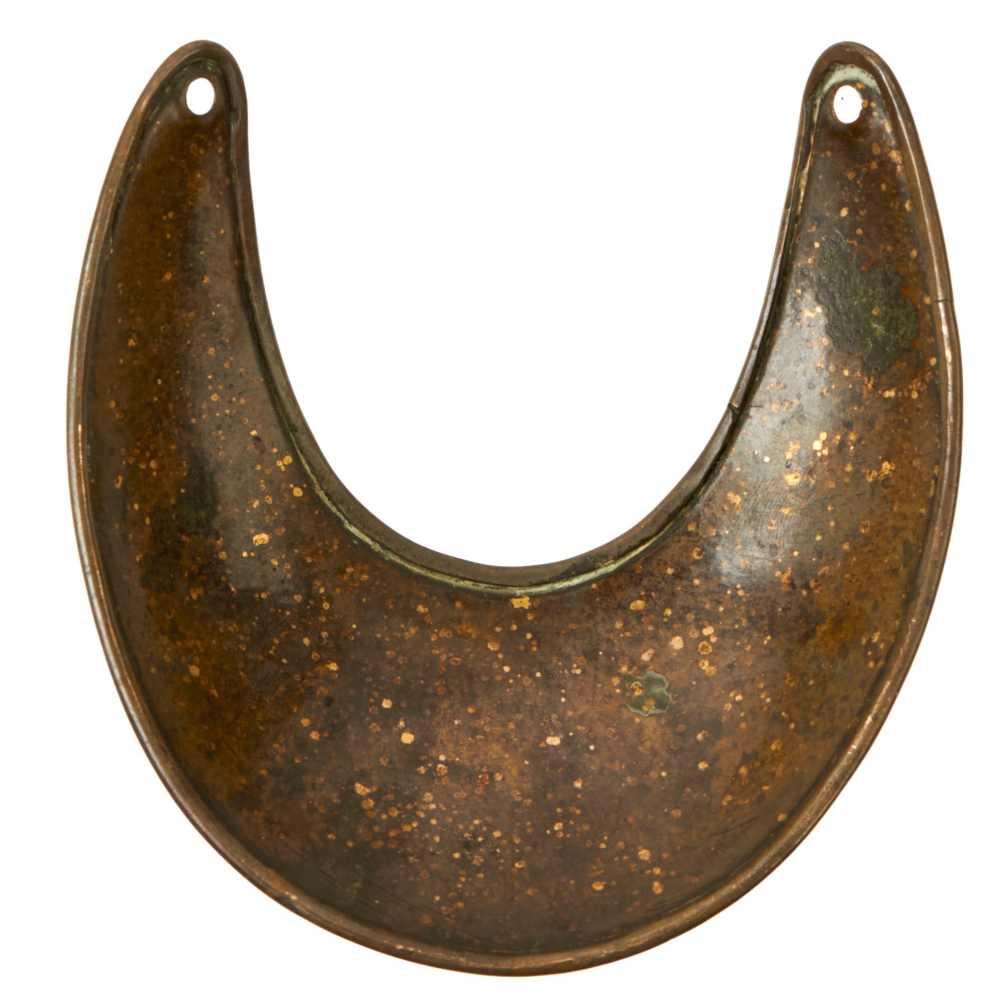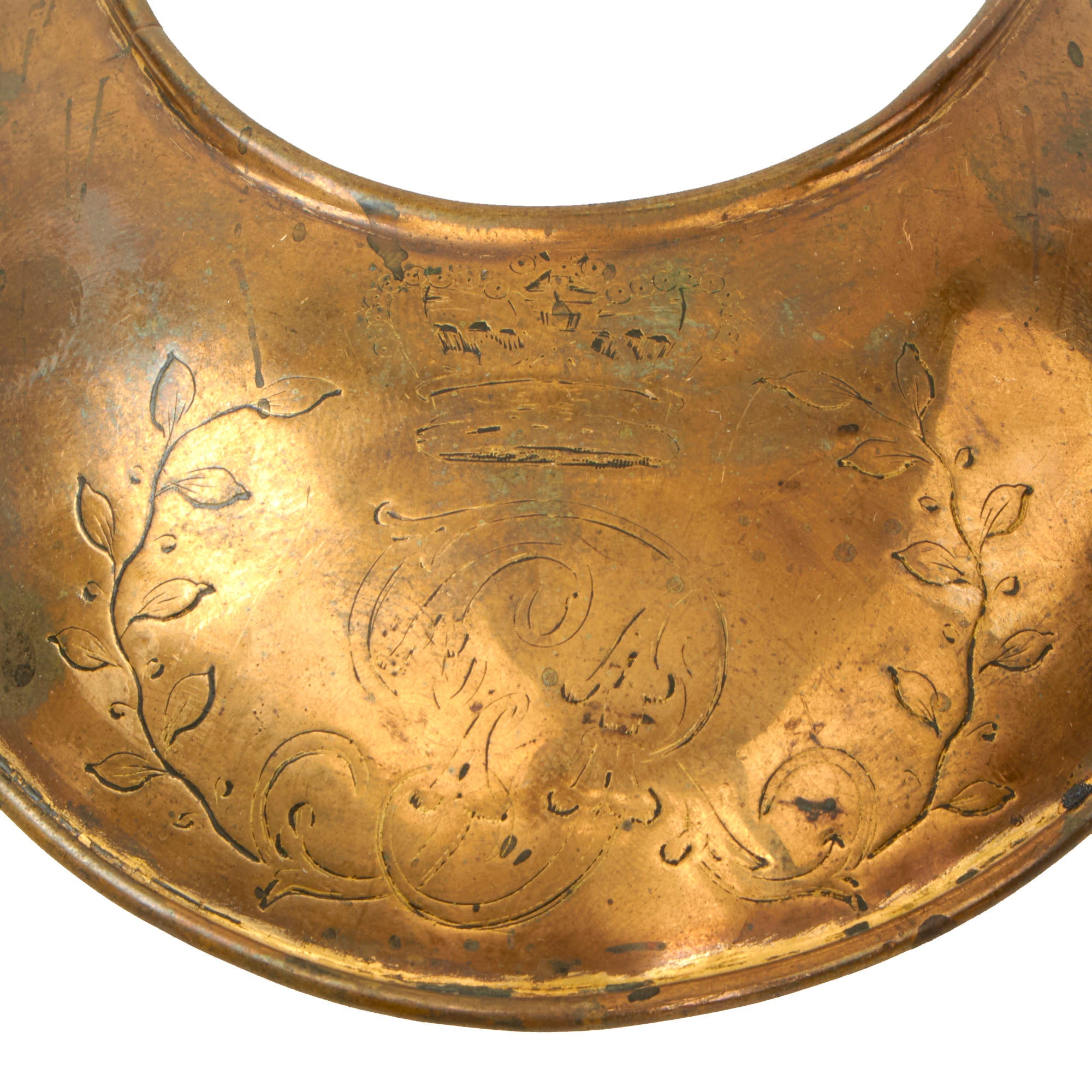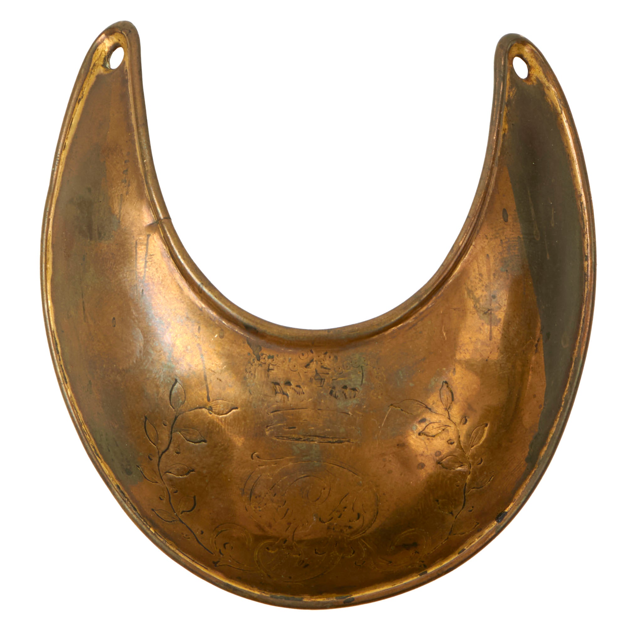 Original Item: Only one available. An officer's Gorget was perhaps the last symbolic piece of "armor" worn by British officers to denote their authority. The introduction of firearms in the 16th and 17th centuries reduced knightley suits of armor as a viable defense. By the time the 18th century arrived, cavalry wore Cuirasses for upper body protection but the great weight needed to deflect musket balls became obsolete after the battle of Waterloo in 1815.