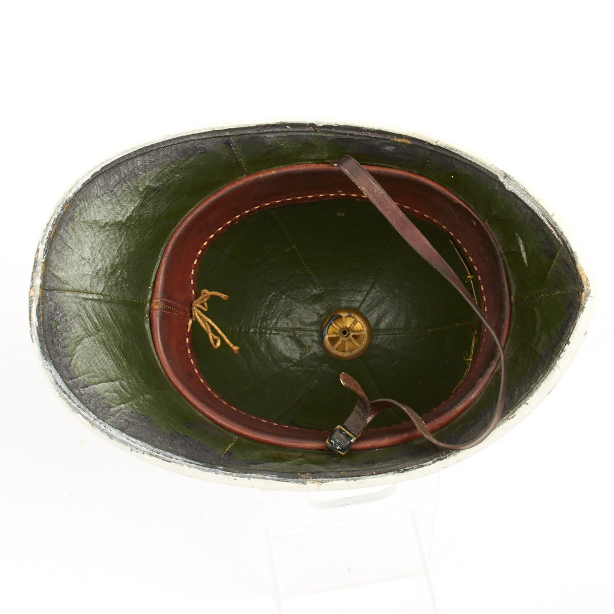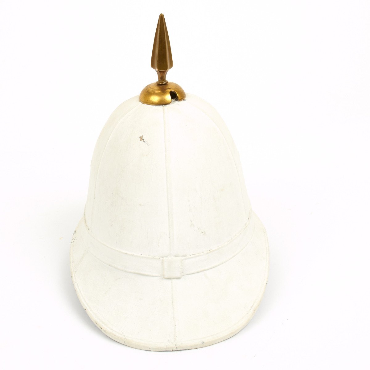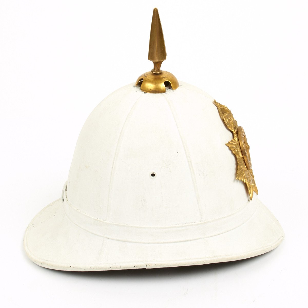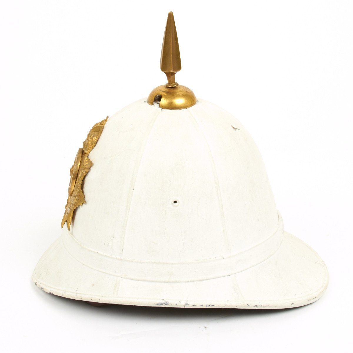 This pith helmet is the standard late Victorian Design as used in the Zulu Wars with a brass spike to top and full brass helmet plate to front bearing the regimental badge under a "King's Crown". Deep green colored interior with brass ventilation holes in top under brass spike and full brown leather headband complete with leather chin strap. Offered in very fine condition, already well over 100 years of age, totally original.