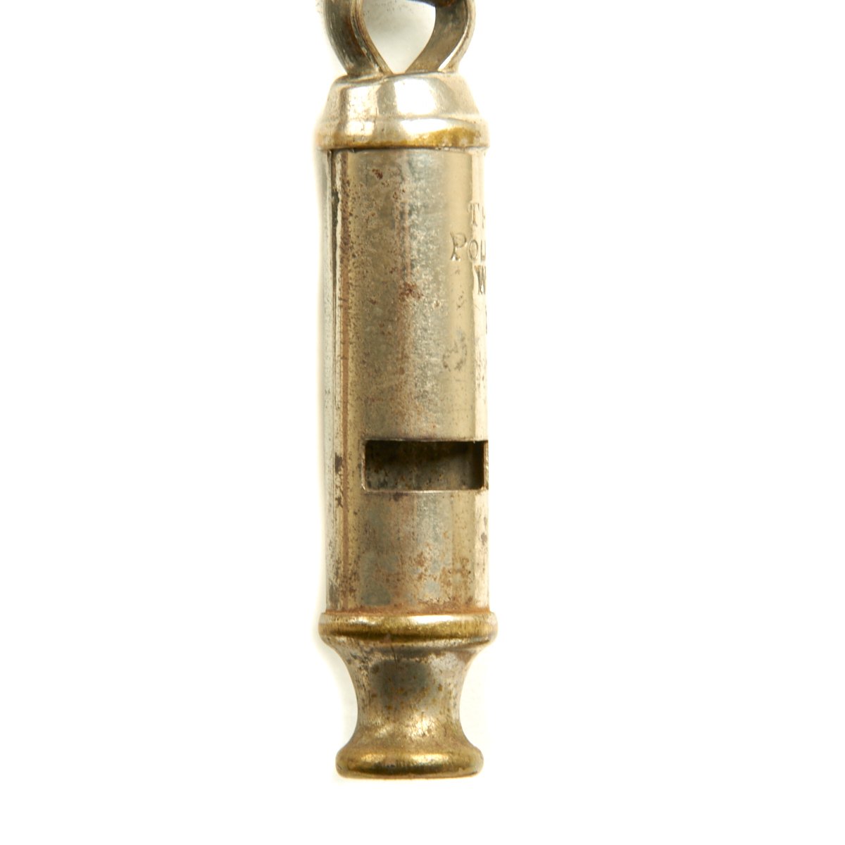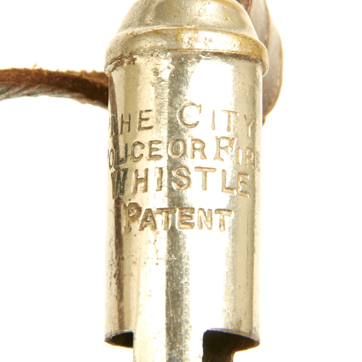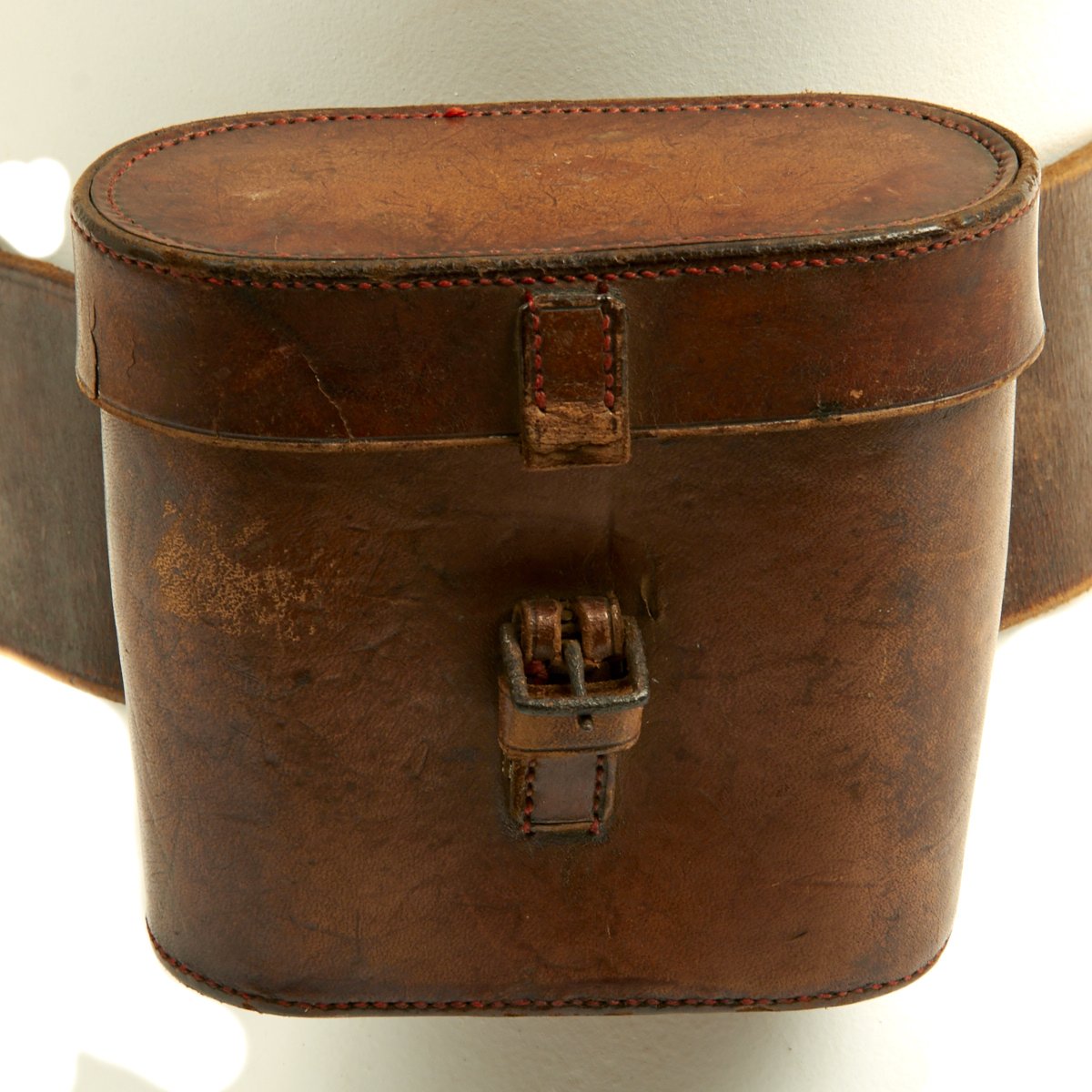 Original Items: One Set Only. This really is something that seldom comes up as complete as this is. High quality rich Brown leather Sam Browne Belt assembly complete with cross strap, with dedicated pocket for whistle. The whistle is present permanently attached to a leather strap and housed in its own tubular pocket. The whistle is marked:- THE CITY POLICE OR FIRE WHISTLE / PATENT. The Set is completed with its matching brown leather binocular case with unreadable maker's name on the under side, which contains a period pair of leather covered Field Glasses. The field glasses are in excellent condition, with clear optics and smooth focus.