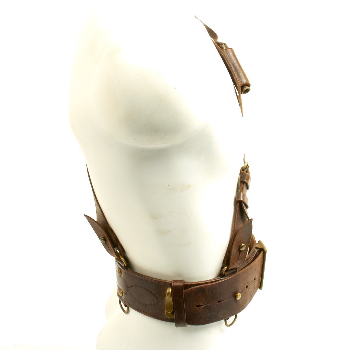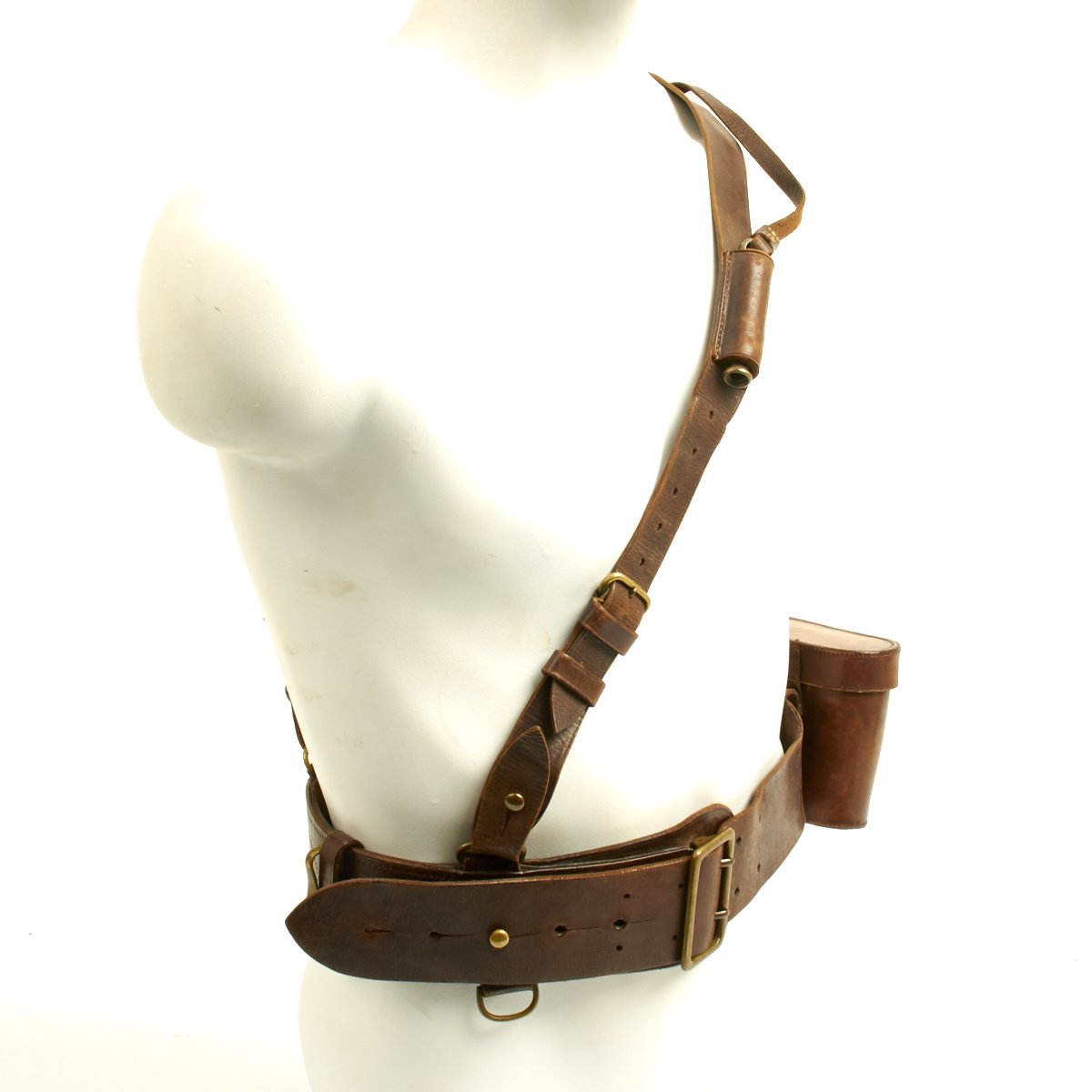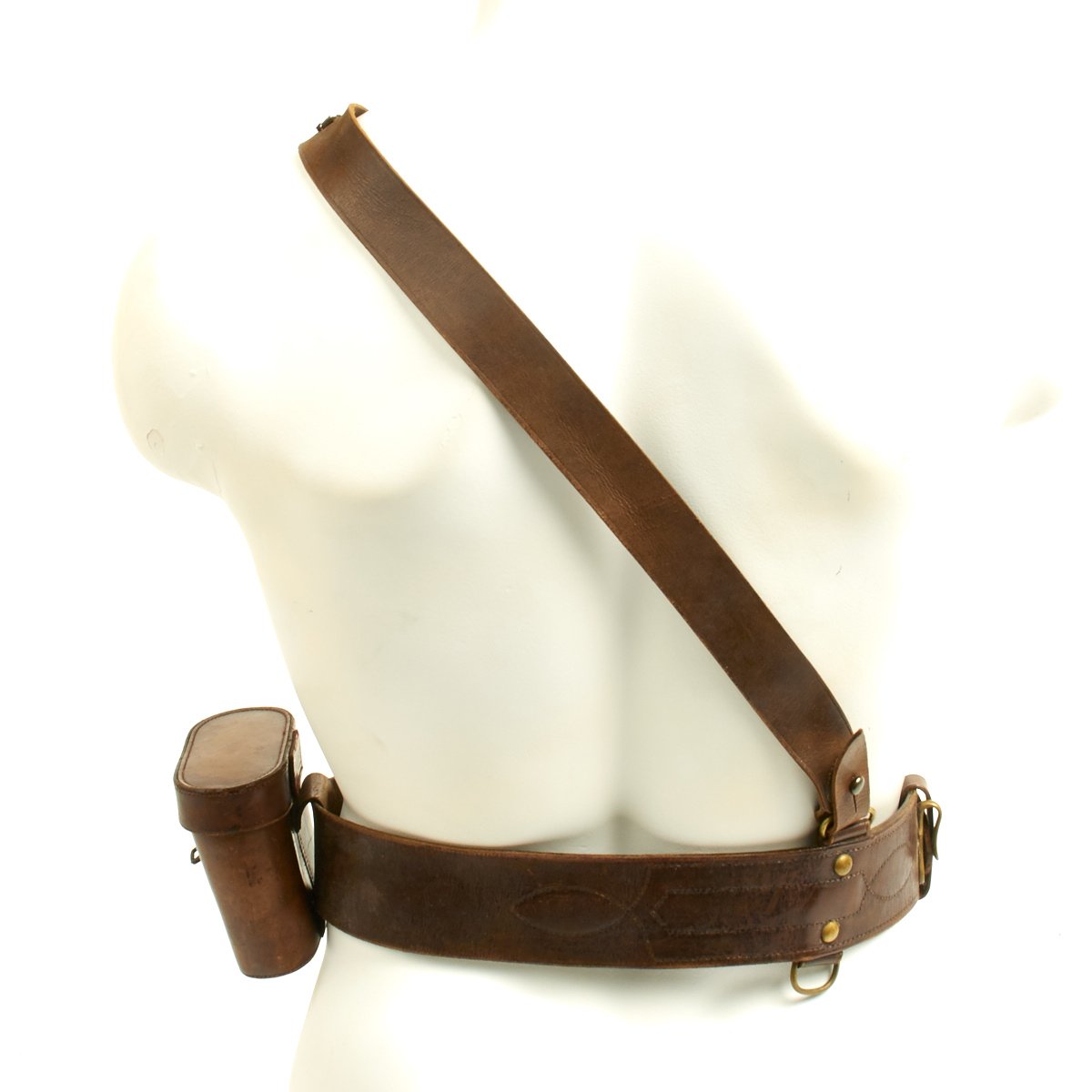 Original Items: One Set Only. This really is something that seldom comes up as complete as this is. High quality rich Brown leather Sam Browne Belt assembly complete with cross strap, with dedicated pocket for whistle. The whistle is present permanently attached to a leather strap and housed in its own tubular pocket. The whistle is marked:- THE CITY POLICE OR FIRE WHISTLE / PATENT. The Set is completed with its matching brown leather binocular case with unreadable maker's name on the under side, which contains a period pair of leather covered Field Glasses. The field glasses are in excellent condition, with clear optics and smooth focus.