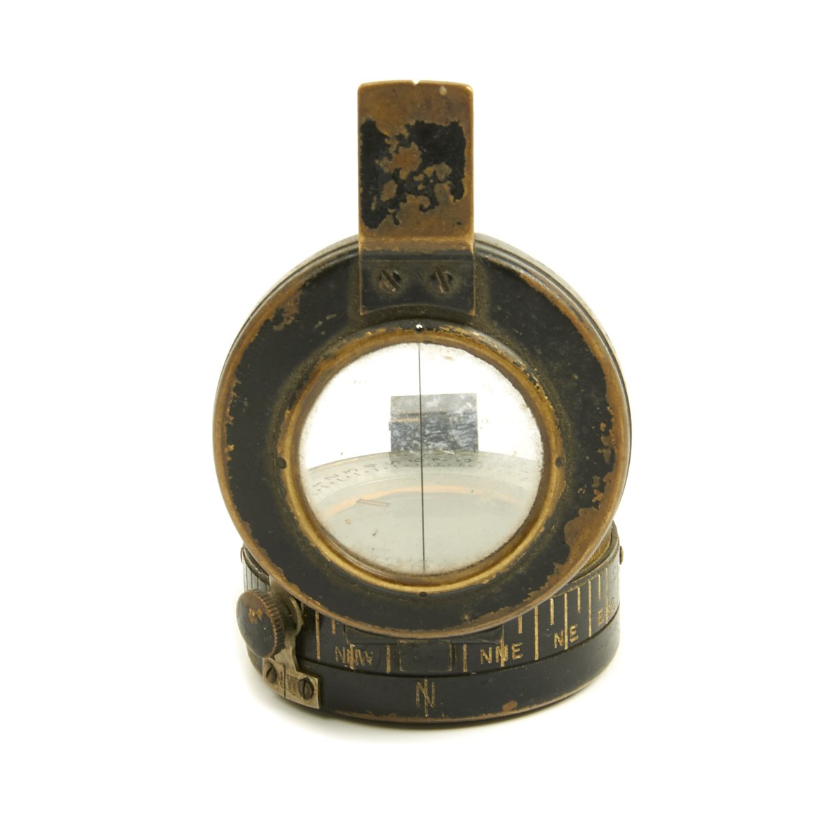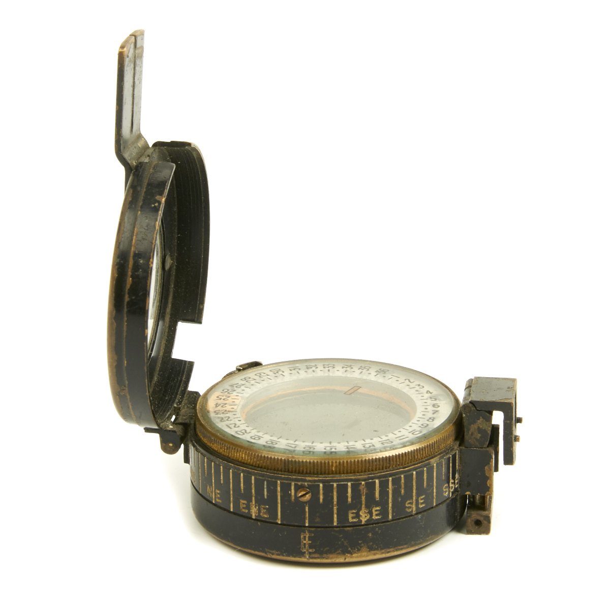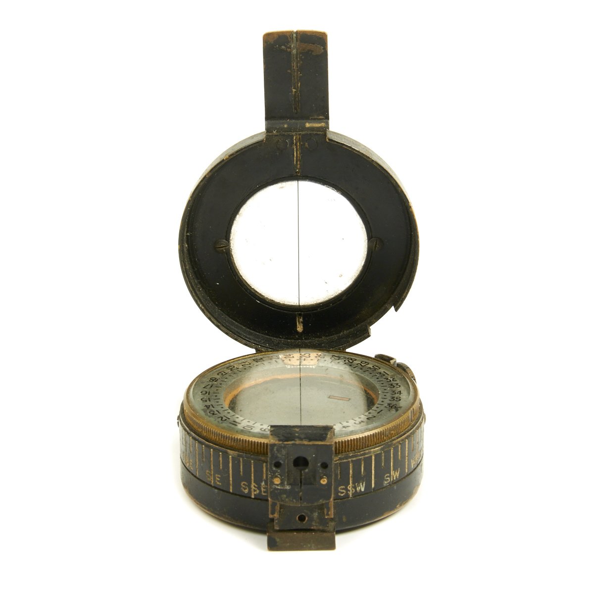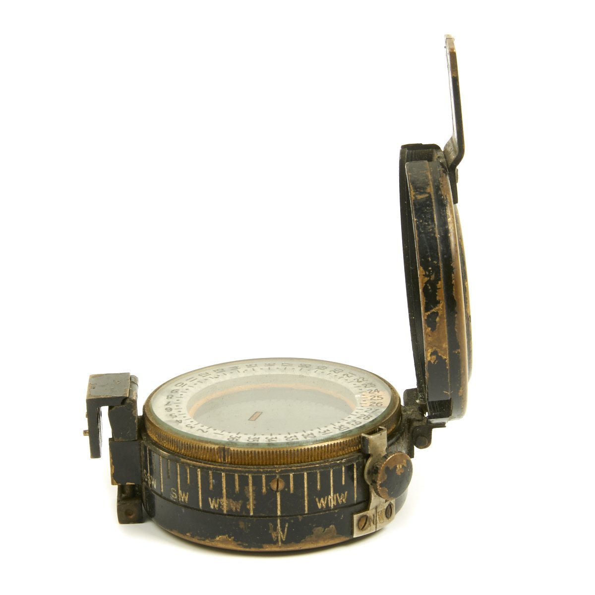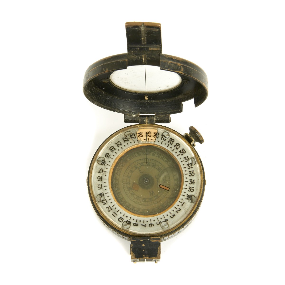 This compass is offered in uncleaned, as found in the attic condition. It is said to have been brought back by the retreating British Army during the evacuation highlighted by the Recent Movies, "DUNKIRK" and "THEIR FINEST HOUR"., however we unfortunately have no way to verify this. Also, the compass is unfortunately missing the carrying ring and prism, which are often missing and sourced off of later prismatic compasses.