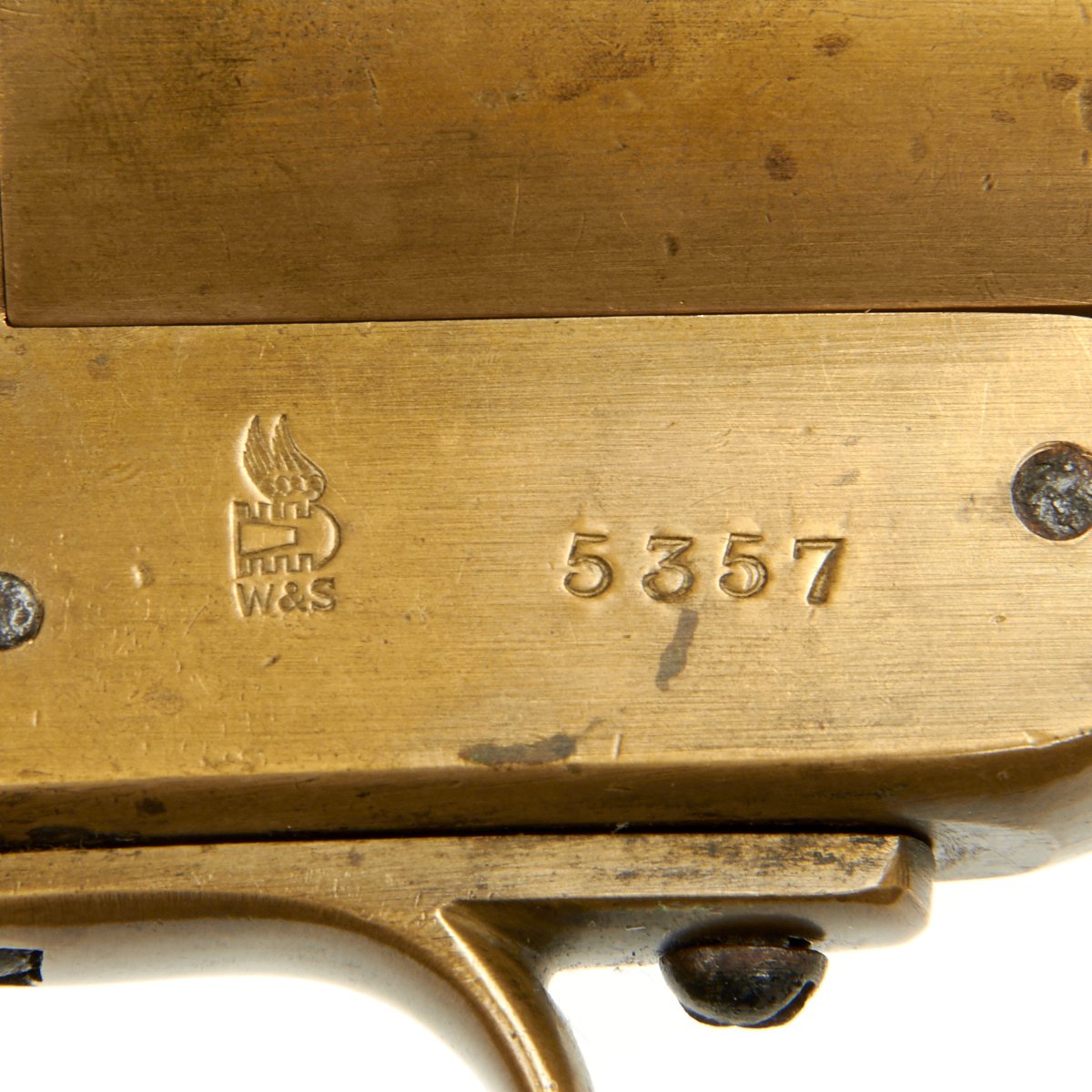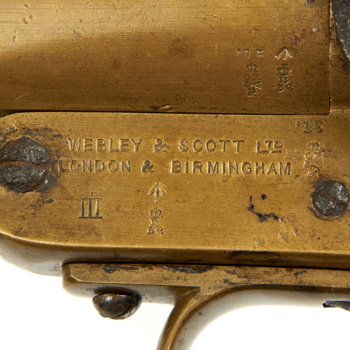 This particular Mark III signal pistol was produced by Webley & Scott for the British military. The flare pistol is clearly marked with the (WINGED BULLET) / W & S trademark of the firm on the right side of the frame. The frame is also marked with the serial number 5357 forward of the trademark. The left side of the frame is marked in three lines: WEBLEY & SCOTT LTD / LONDON & BIRMINGHAM / III. The frame and barrel are both marked with British Ordnance Department proof and inspection marks, the Broad Arrow of the Ordnance Department and the number 15 indicating inspection and acceptance in 1915.