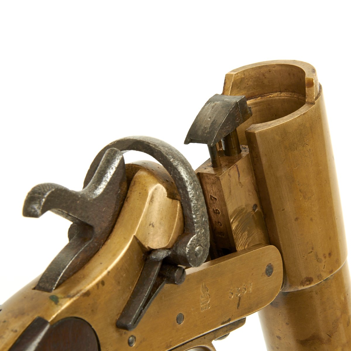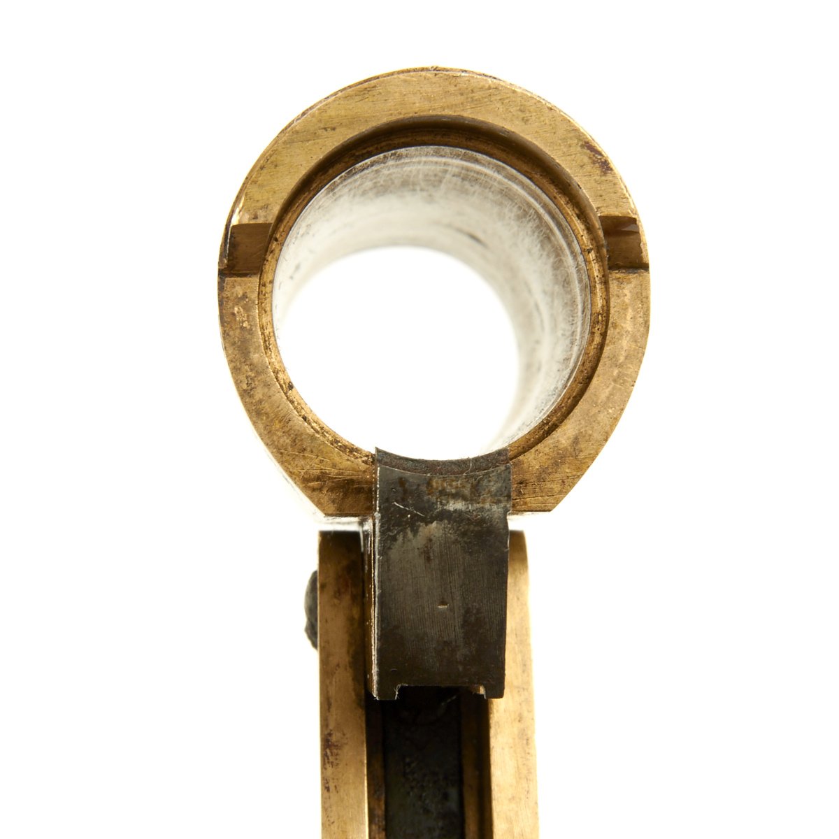 The signal pistol is in very good condition. All of the markings on the frame and barrel remain crisp and clear. The brass frame and barrel have a gorgeous, untouched dark mustard patina with a greenish-brown hue to it. The balance of the brass is crisp and sharp with fine edges and only some light handling marks.