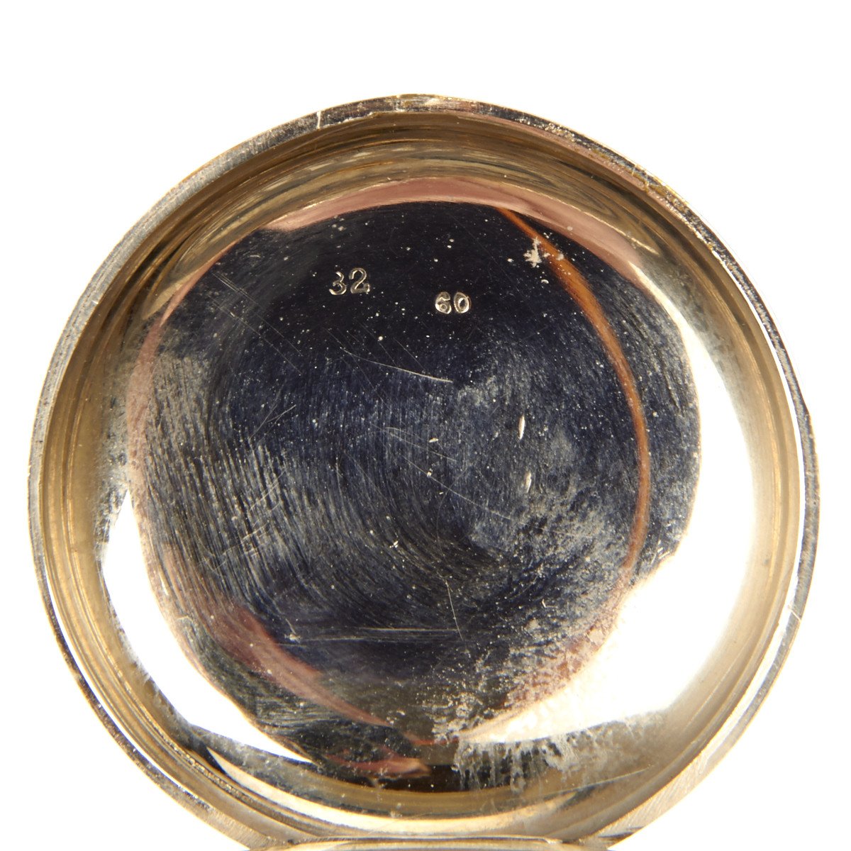 The engraving is on the base of the compass and bears a broad arrow denoting it was War Department issue. The full hunter case is in very good condition, and has been polished leaving a trace of the brassy finish on the outside that contrasts nicely with the nickel-plating on the inside. The beveled glass crystal covers an attractive jeweled dry card Singers Patent style black and white dial.