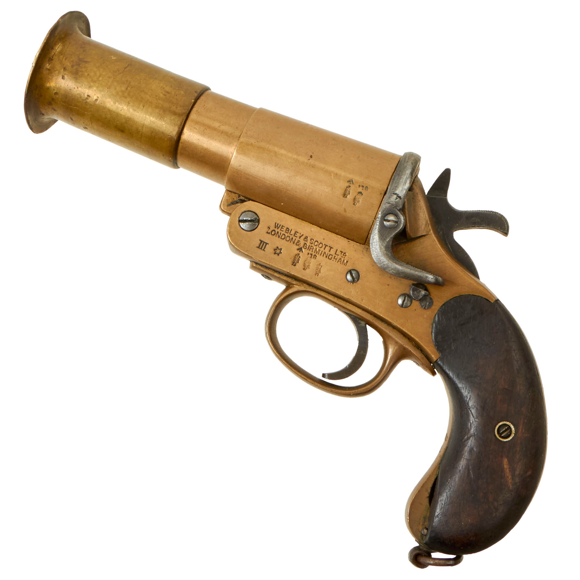 Original Item: Only one available. This is a very nice Great War-produced example of the English military Mark III* flare pistol, as issued and used during the last part of World War I. This particular pistol was upgraded to III* during the interwar period, when it was still in service, and was probably still in use during WWII. Not Available for Export.