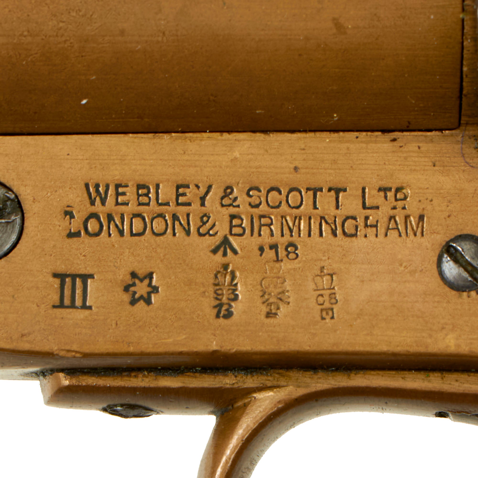 The left side of the frame is marked in three lines: WEBLEY & SCOTT LTD / LONDON & BIRMINGHAM / III *., indicating the manufacturer and version of the pistol. The frame and barrel are both marked with British Ordnance Department proof and inspection marks, including the Broad Arrow of the Ordnance Department and the number 18 indicating inspection and acceptance in 1918.