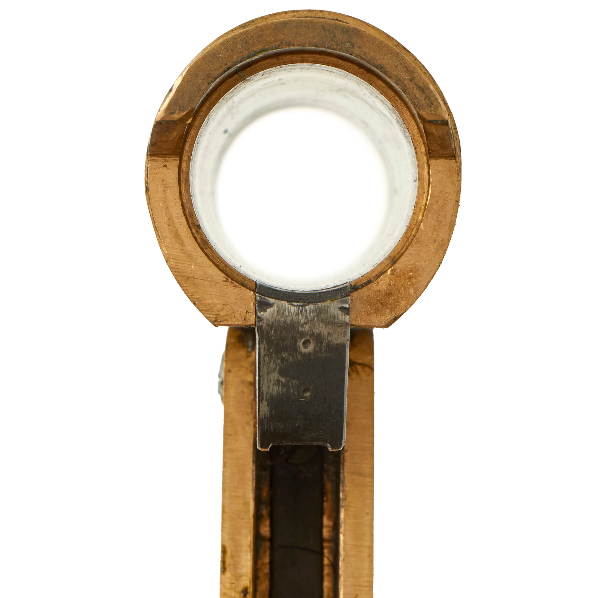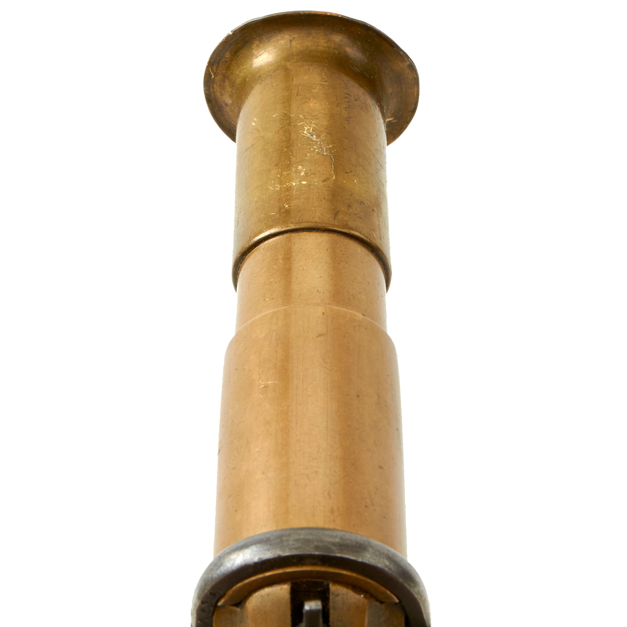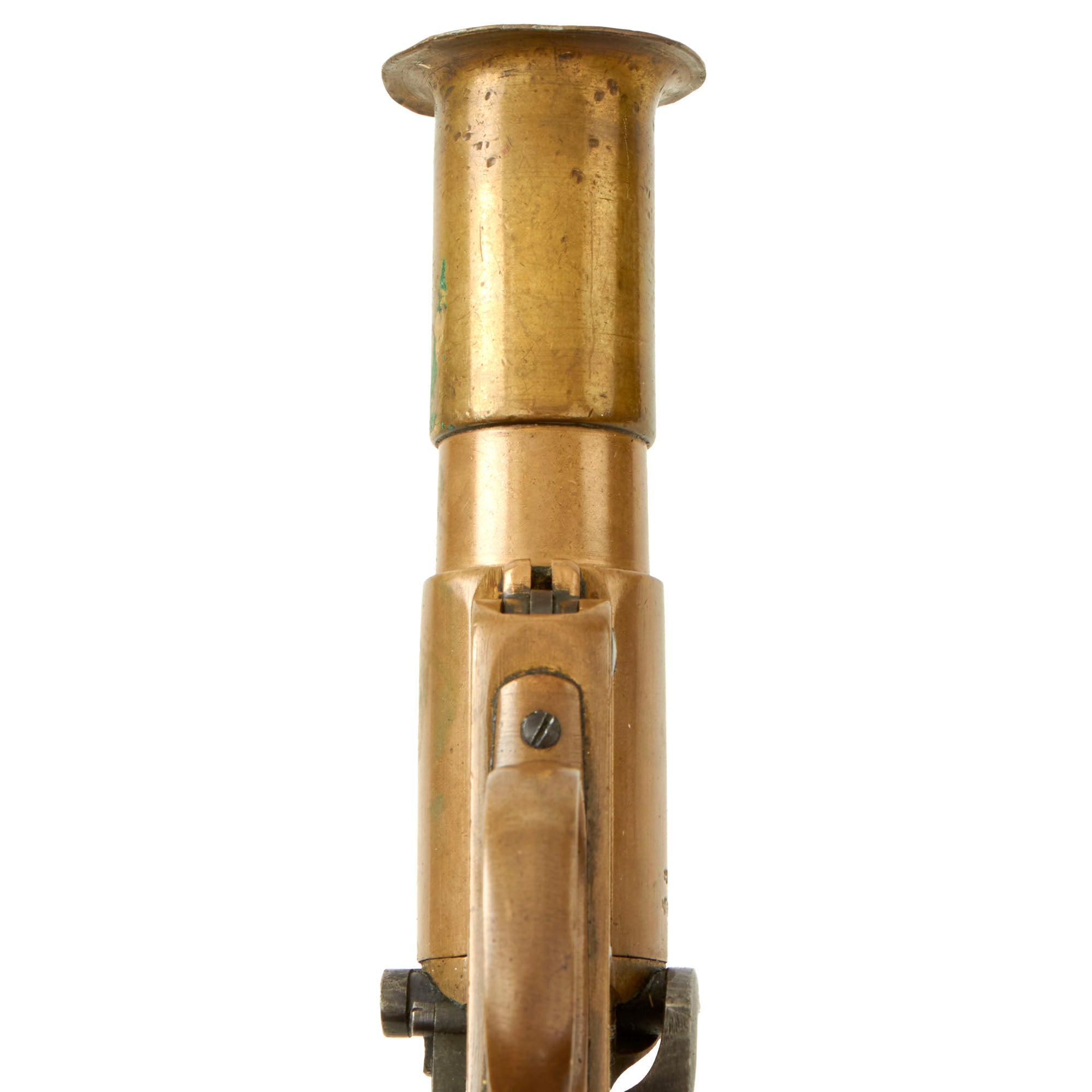 The signal pistol is in good, used condition. All of the markings on the frame and barrel remain mostly crisp and clear. The brass frame components have a nice used look, but the wooden grips have pieces broken off at the same end on both sides as shown.