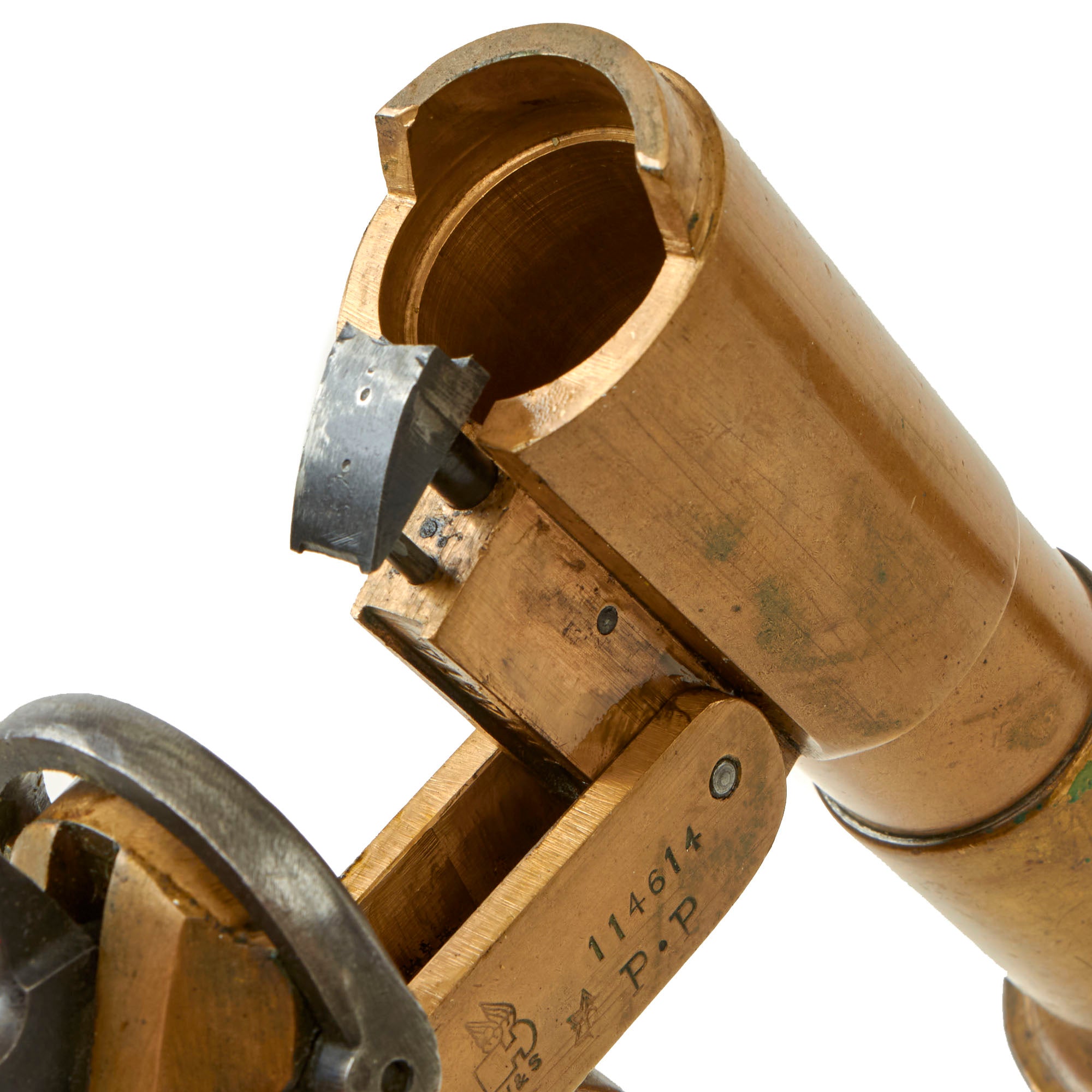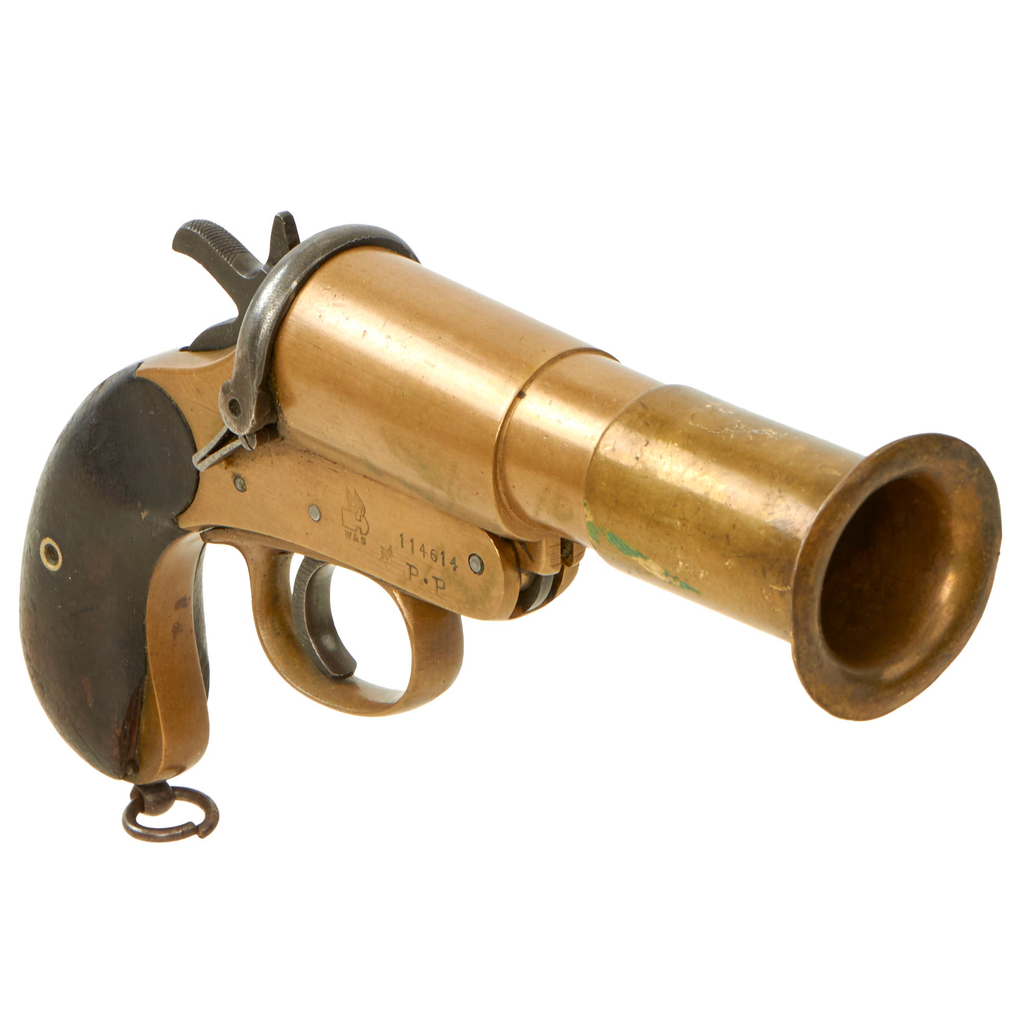 The flare pistol is clearly marked with the (WINGED BULLET) / W & S trademark of the firm on the right side of the frame. The frame is also marked with the serial number 114614 forward of the trademark. This number is also seen on the bottom of the barrel when the pistol is open for reloading. The ejector is marked 14614, so this part is original to the pistol.
