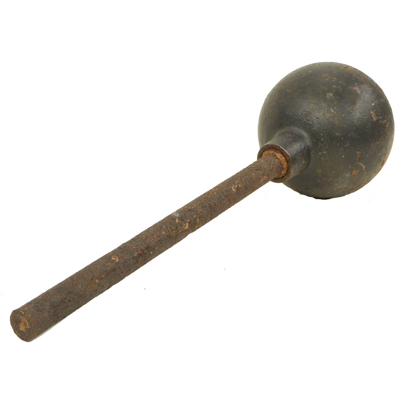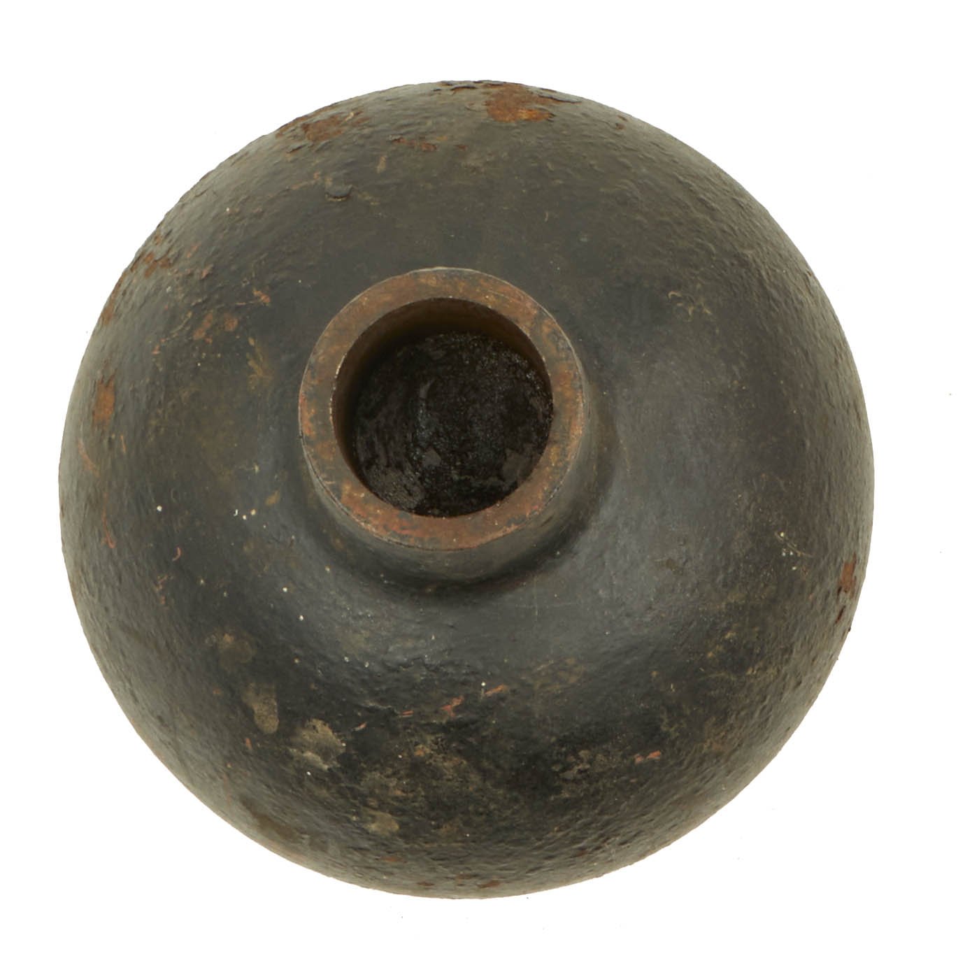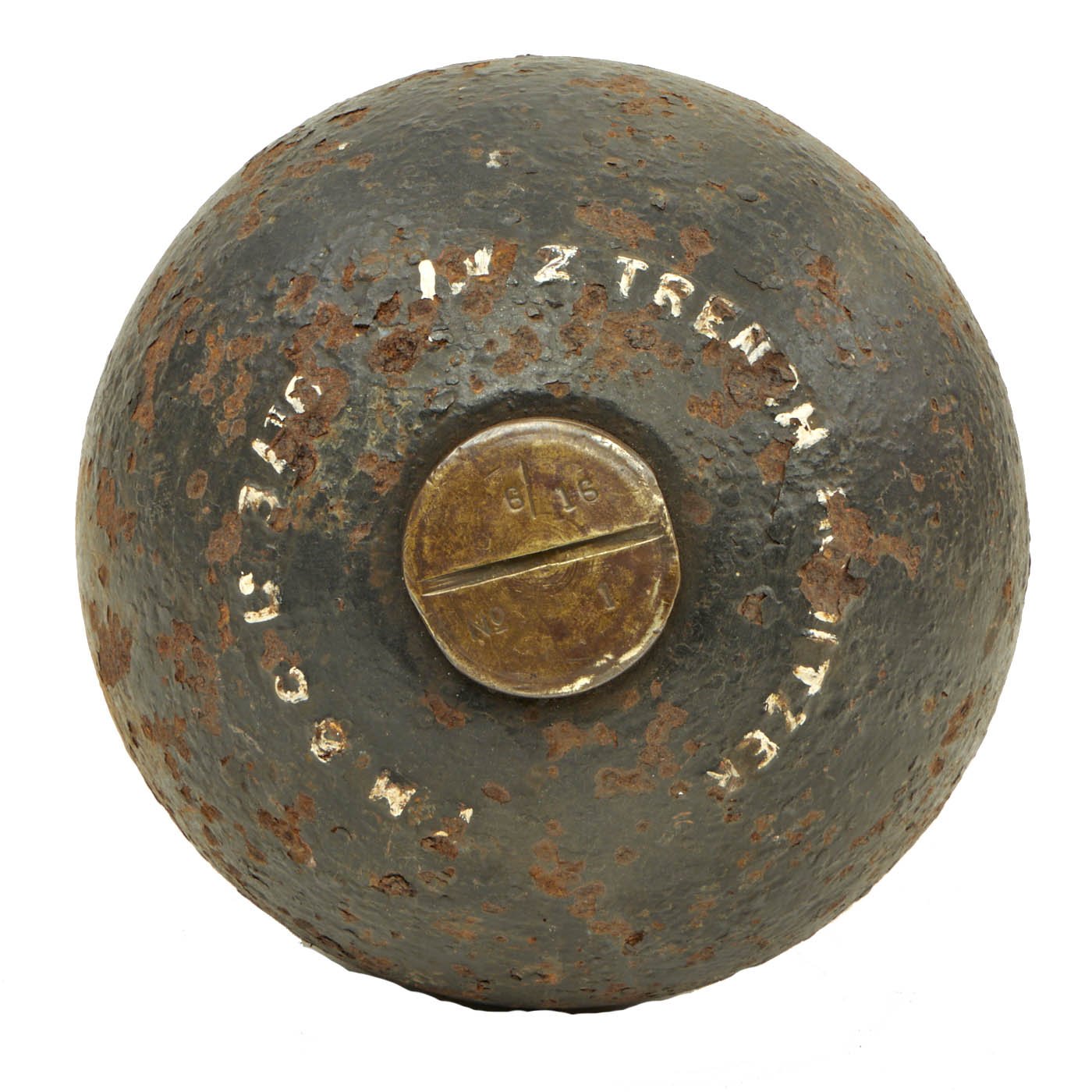 Original Item: This is an original WW1 2" Medium Trench Mortar, also known as the 2-inch Howitzer, and nicknamed the "Toffee Apple" or "Plum Pudding" mortar. This bomb has been deactivated and is totally inert. It is offered in good condition complete with brass fuse cap and cast lettering on the side. The markings are partly broken away, and the rest have been white painted, so they are somewhat legible, reading IN.? 2 TRENCH HOWITZER on one side, and what looks to be H.M. & Co ?? Ltd. on the other. The Ball is 9" in diameter, overall length 34 inches and weight of a whopping 40 pounds!