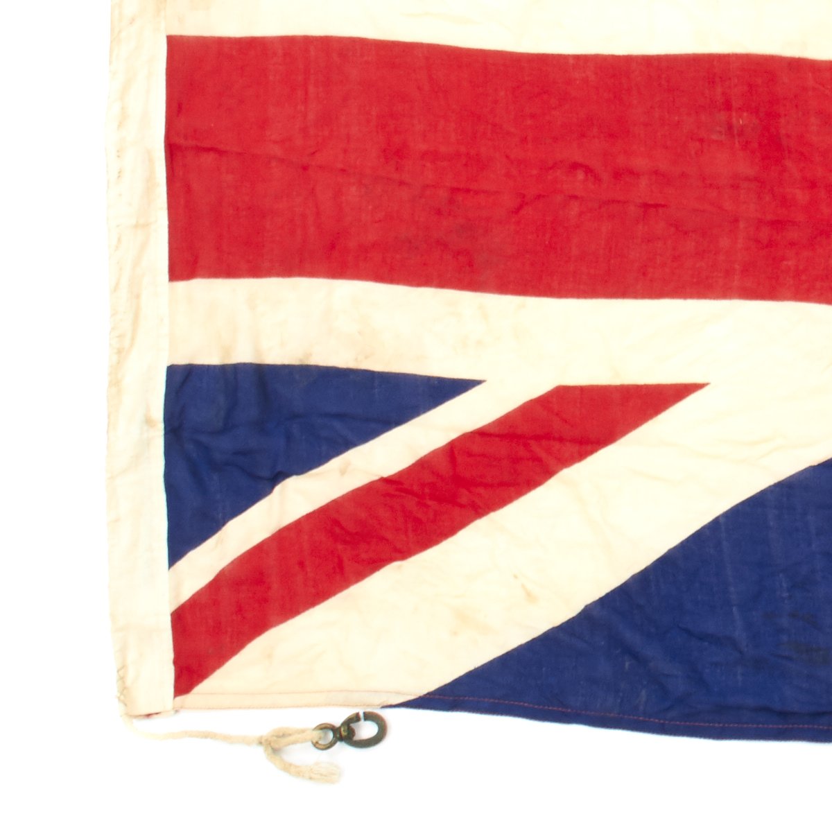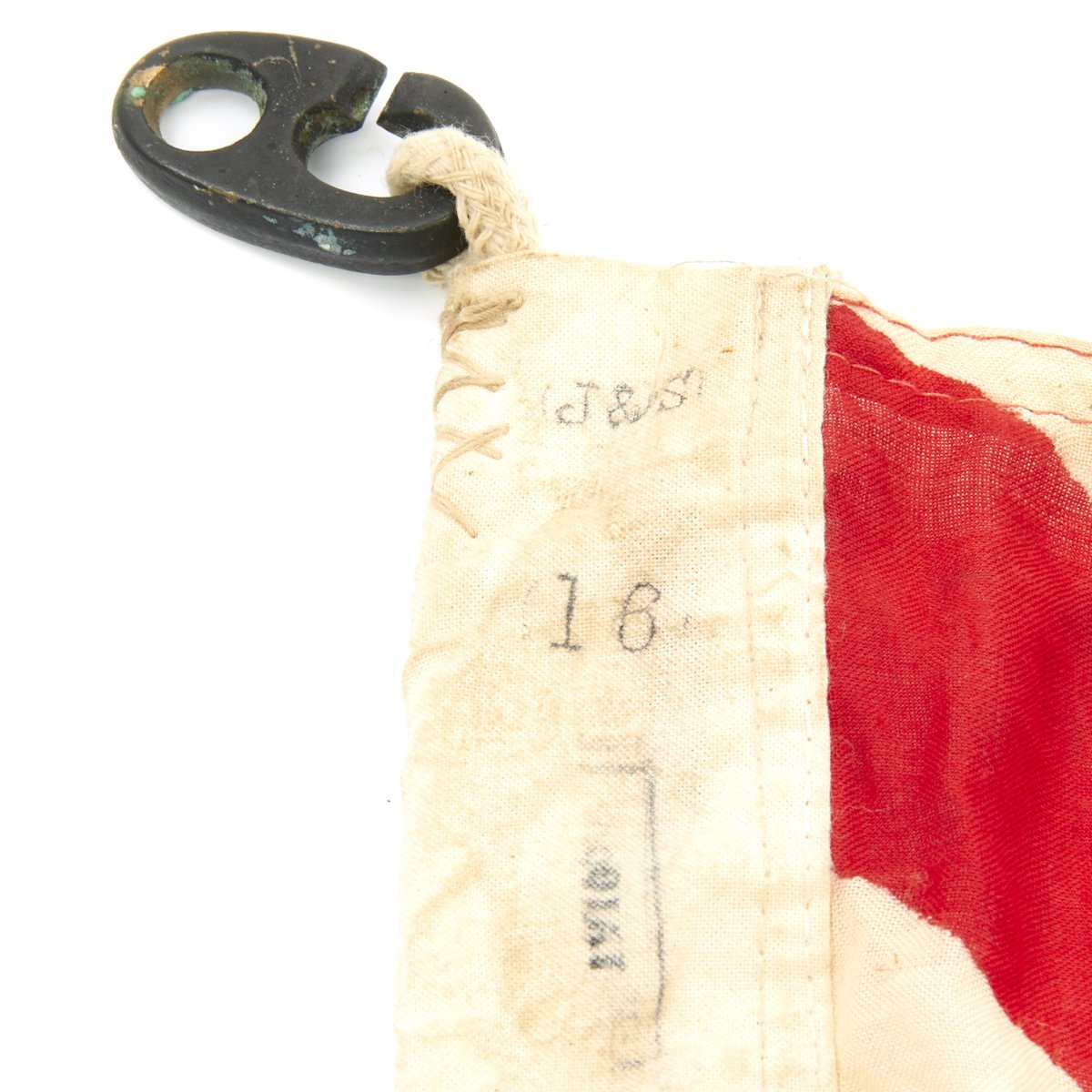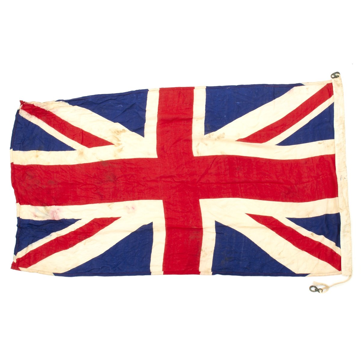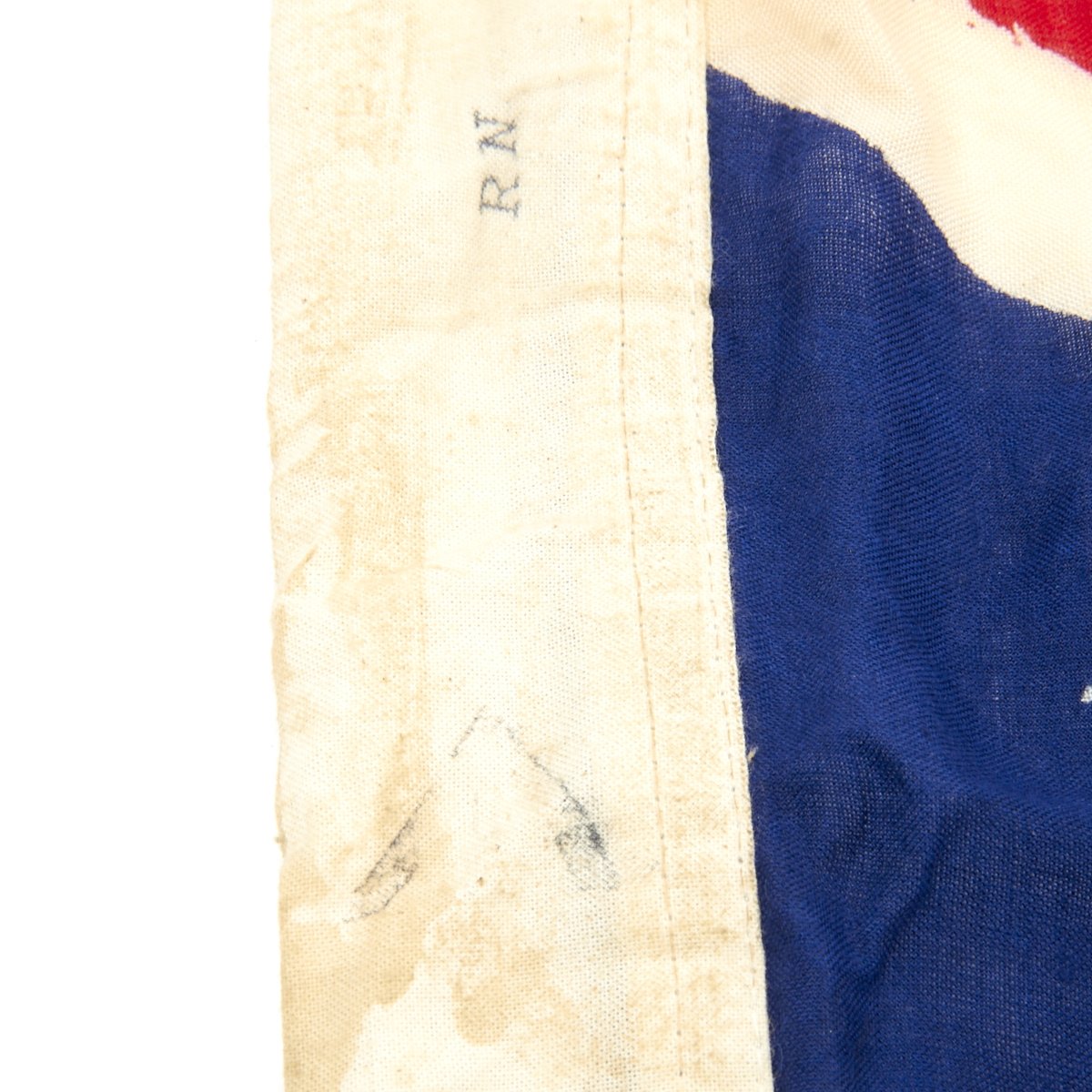 Original Item: Only One Available. This is a very nice Original British WORLD WAR ONE era Union Jack Flag, measuring approximately 60" X 34". The flag header is marked with a BROAD ARROW stamped together with a Maker's mark of J.&S. and DATED 1916. There are also the letters R N stamped on the flag, though we do not know if this represents Royal Navy use. The flag appears free of Moth or other damage, though it definitely could use a good ironing, as it is creased from poor folding. The flag still has its original top and bottom cast brass grommet hooks for attachment.