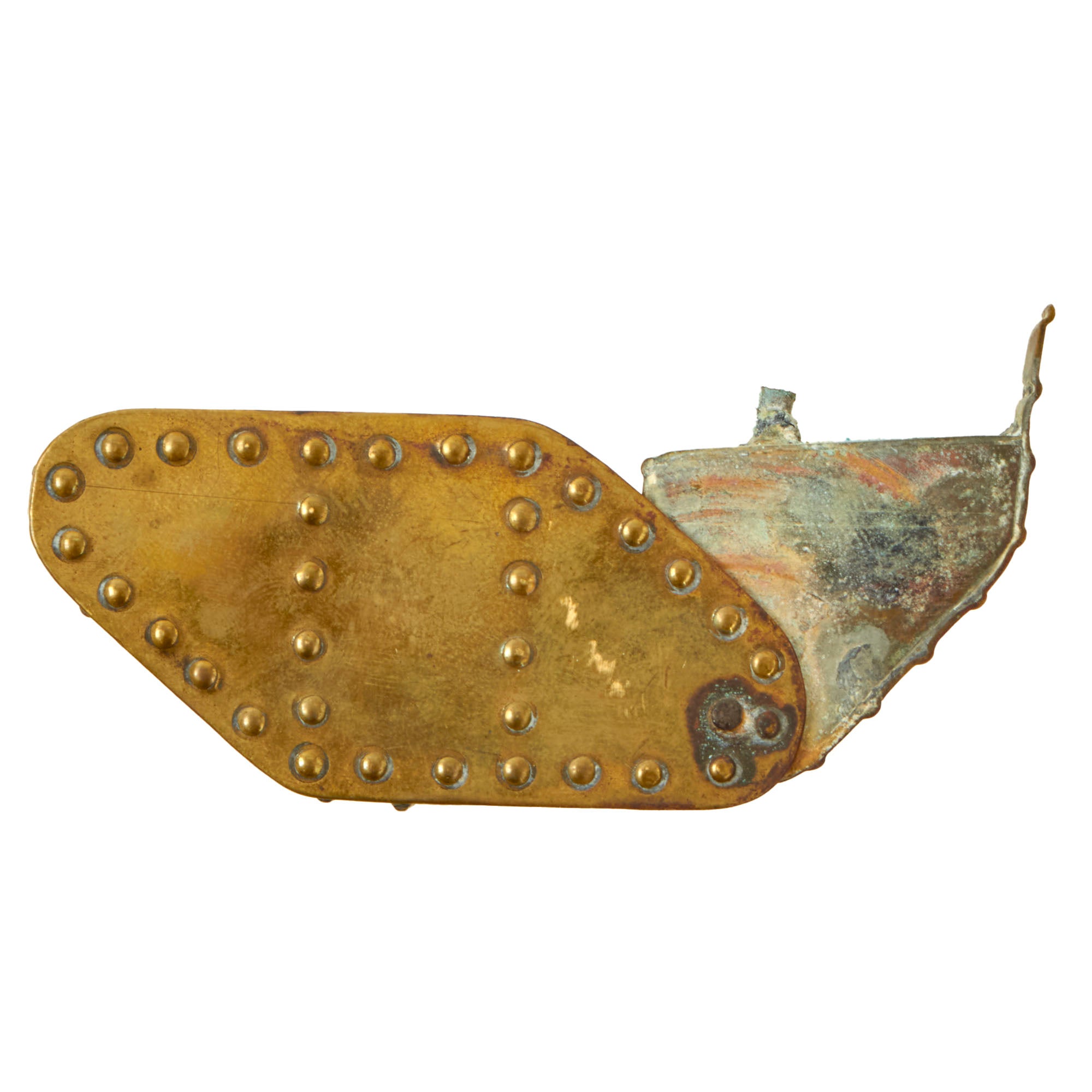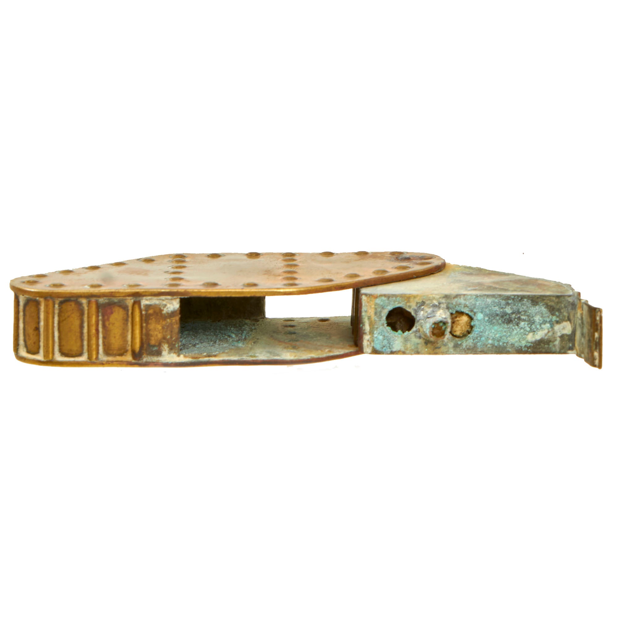 This is a darling little trench art lighter made to resemble a Mark V. British Landship tank. It measures 3 x 1½ x ½” when closed and has a small latch to pull out the lighter. Unfortunately the interior is covered in light oxidation and can not be used, but it is still a great custom soldier-done piece. The edges resemble the treads of a tank.