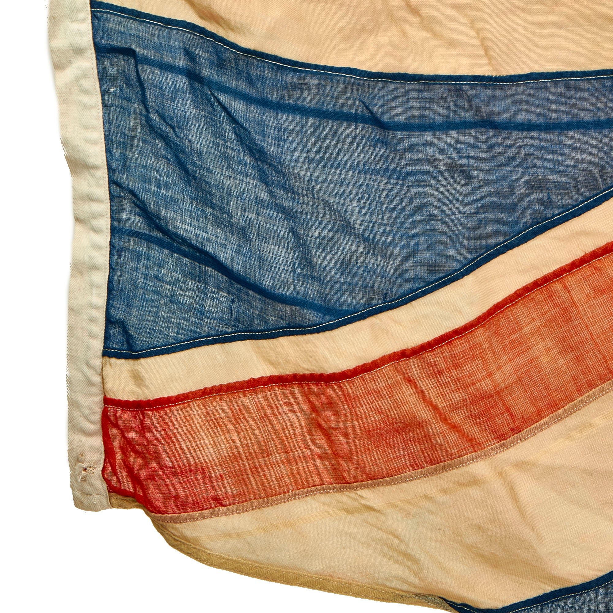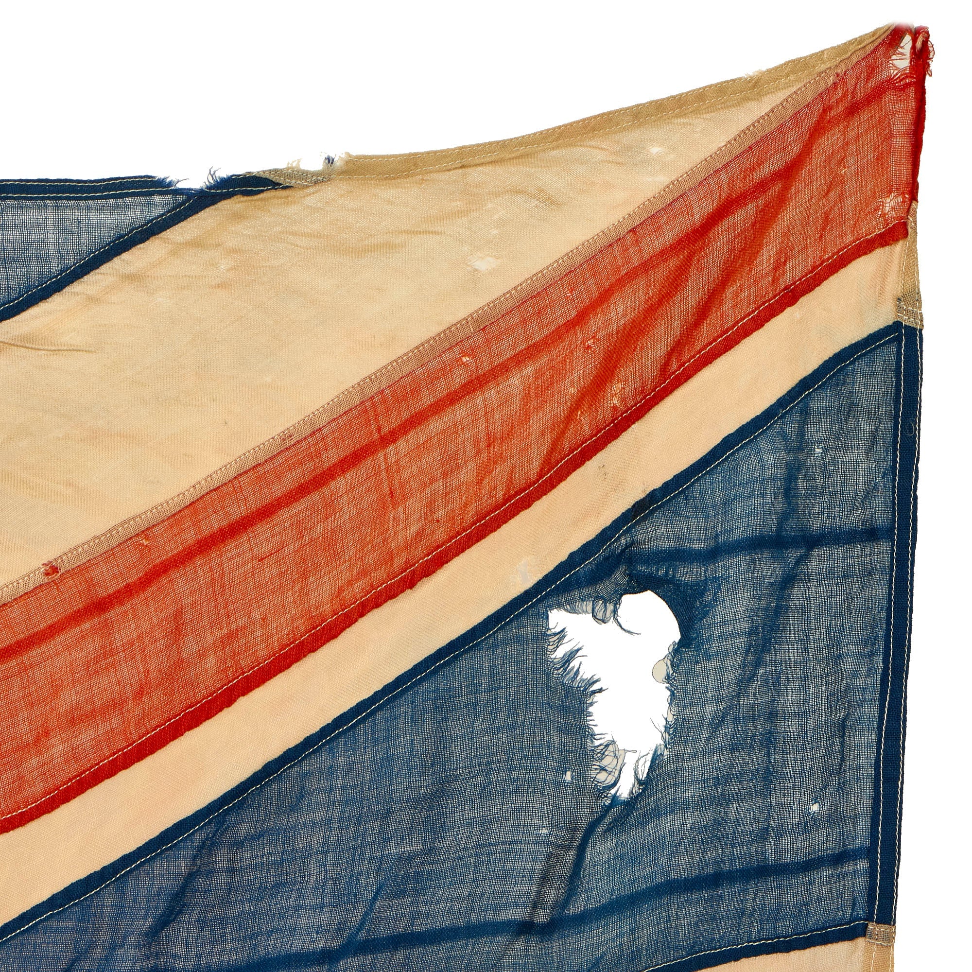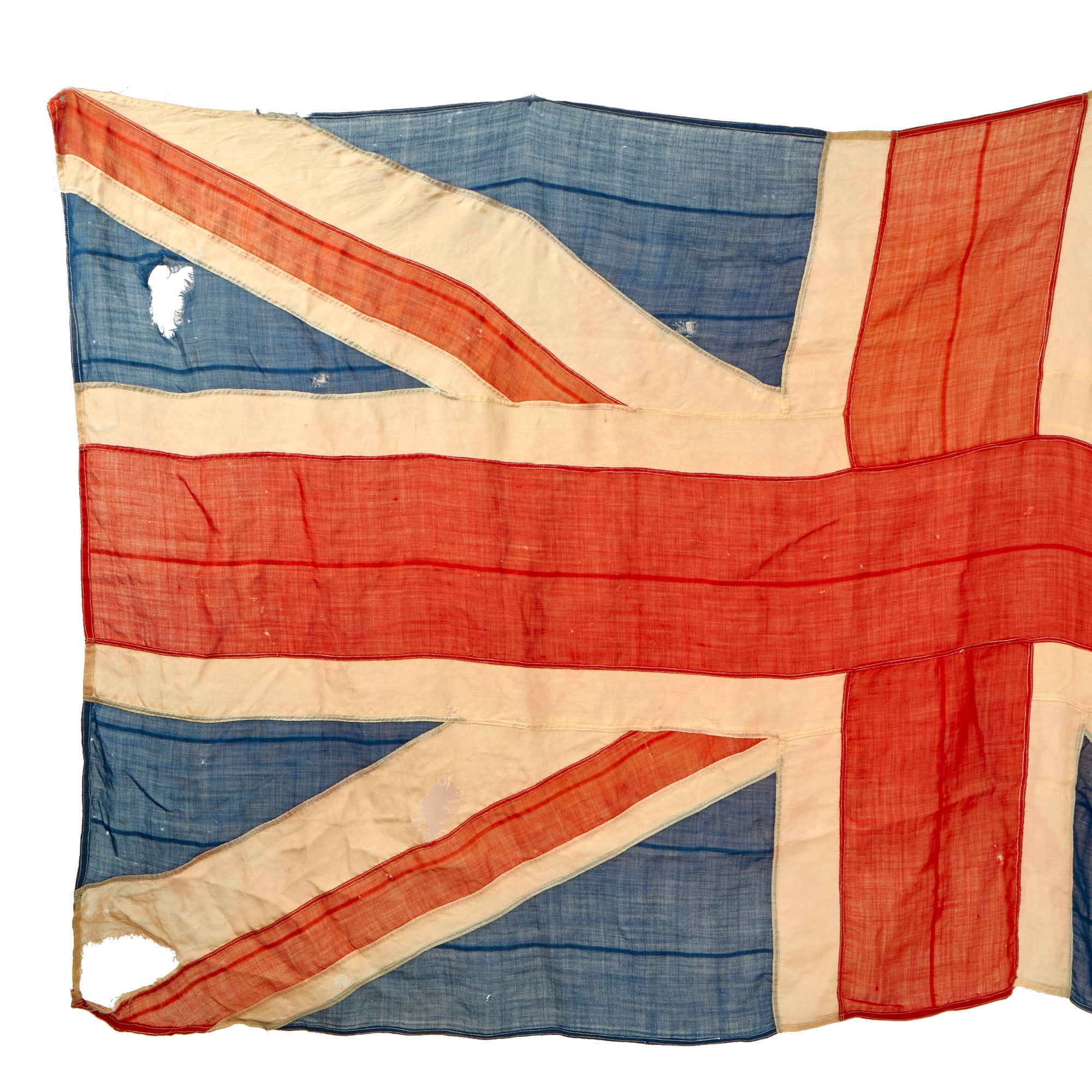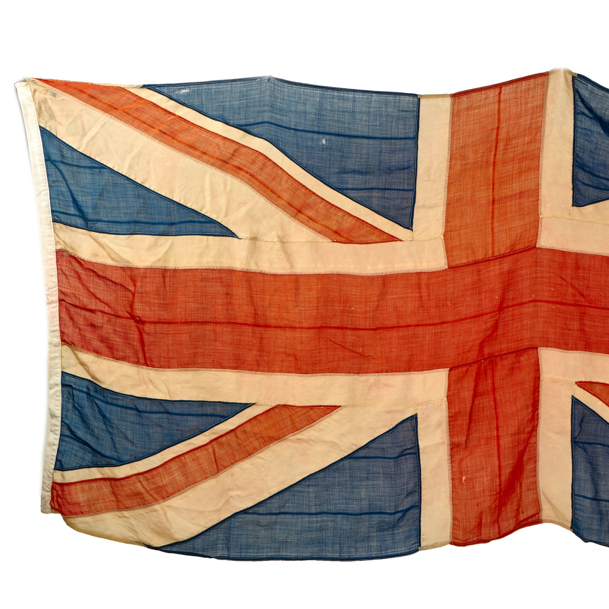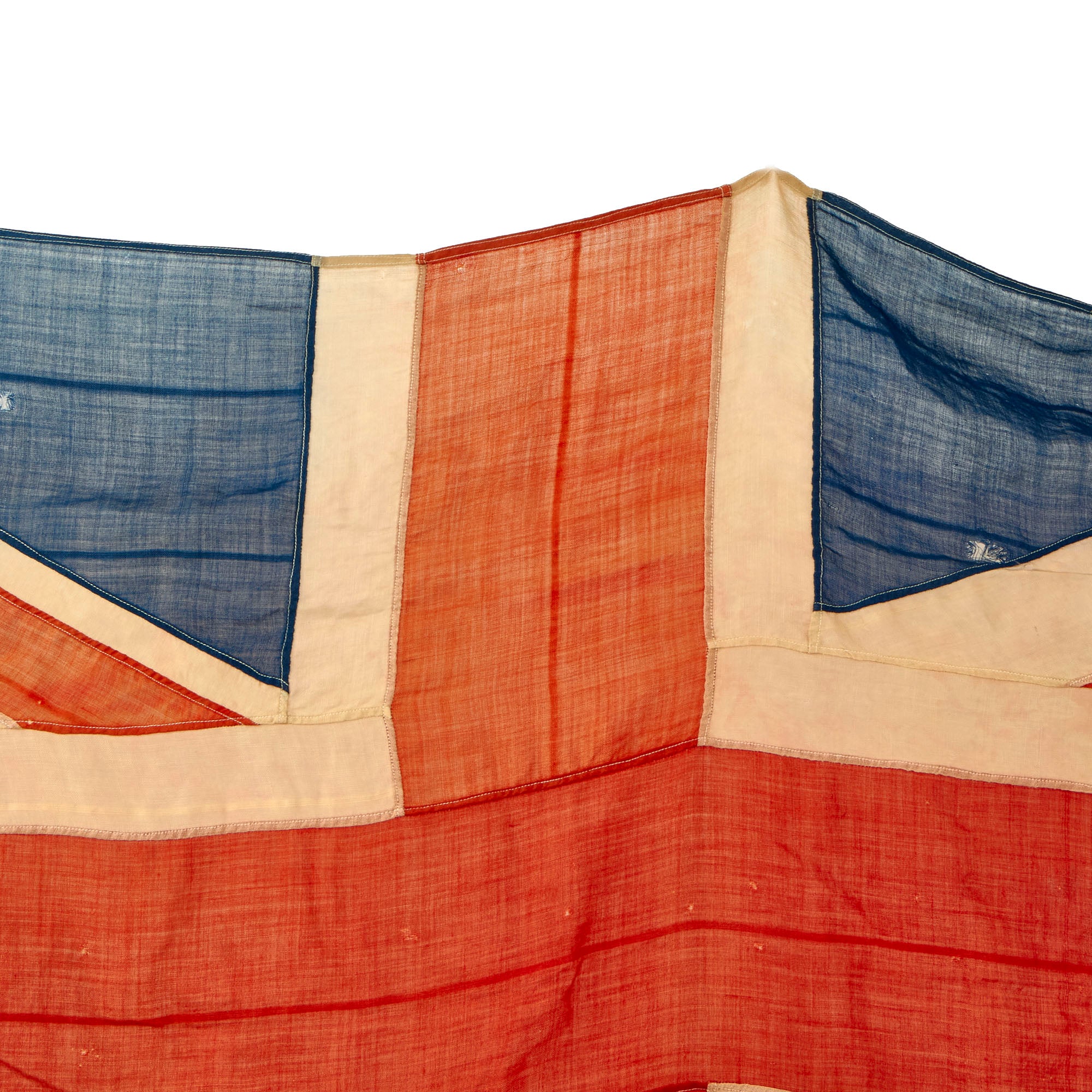 Original Item: Only One Available. This is a very nice Original British World War One era Union Jack Flag, measuring approximately 46” x 104”. The flag header is not marked, but this flag seems to have seen long service, so it was probably washed several times, which probably removed and faded the markings. This may also have caused the aspect ratio to change a bit, as it is a bit over 1:2 now.