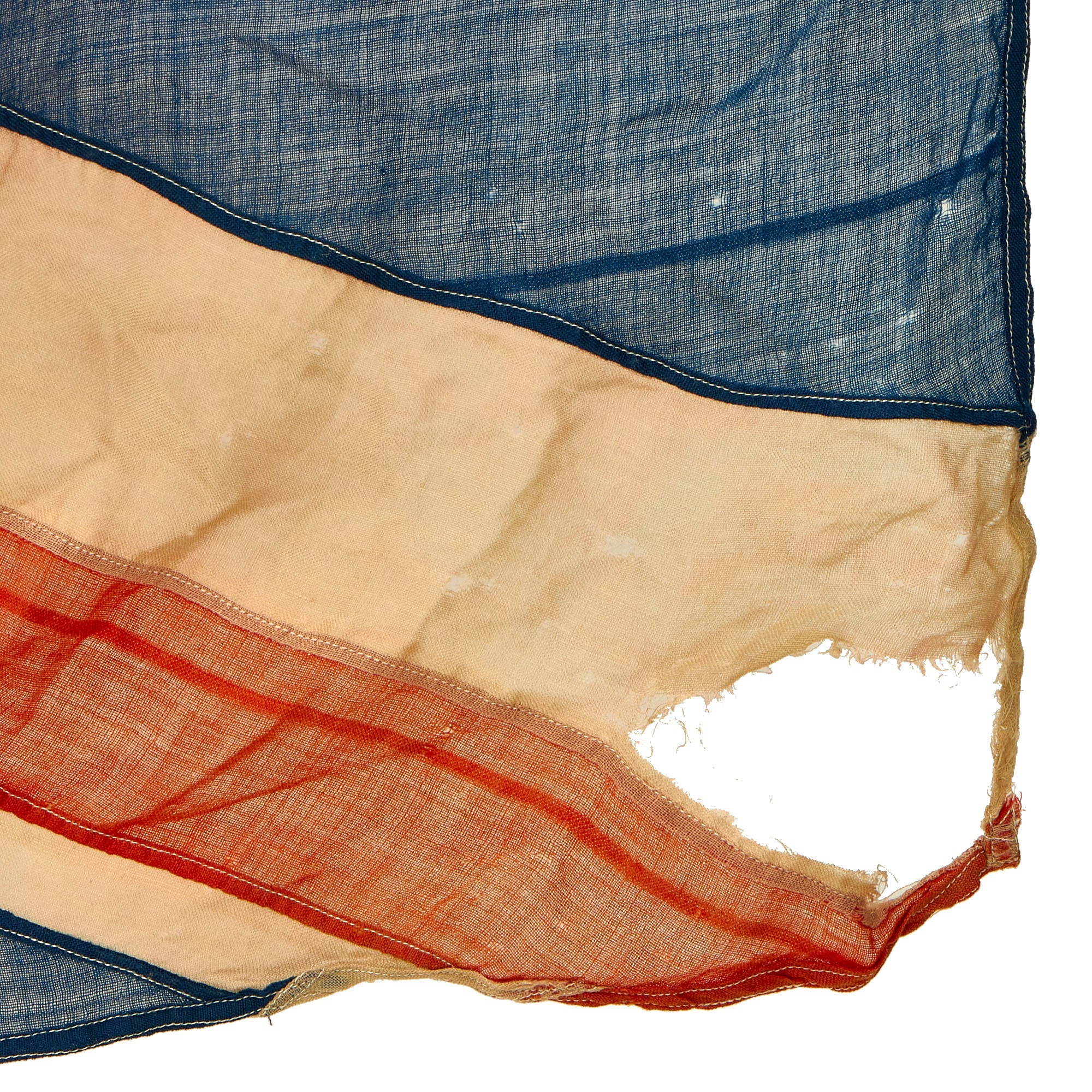 The flag does show real wear from service use, and has scattered wear holes and tearing as shown. These could be from moth, but they look much more like the flag material aging and becoming somewhat delicate. It is constructed of wool, which went out of favor quickly after WWII as superior synthetics were available.