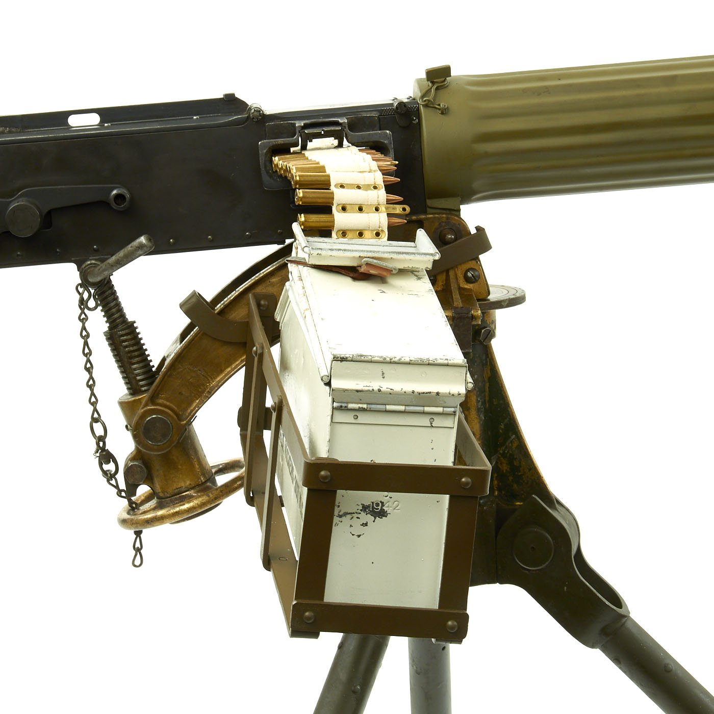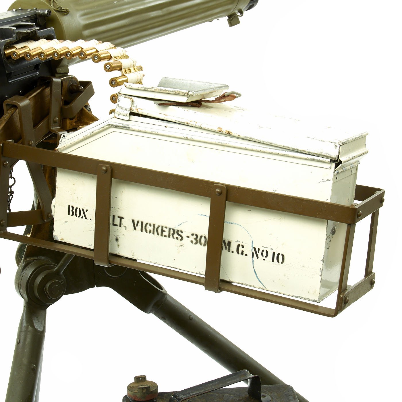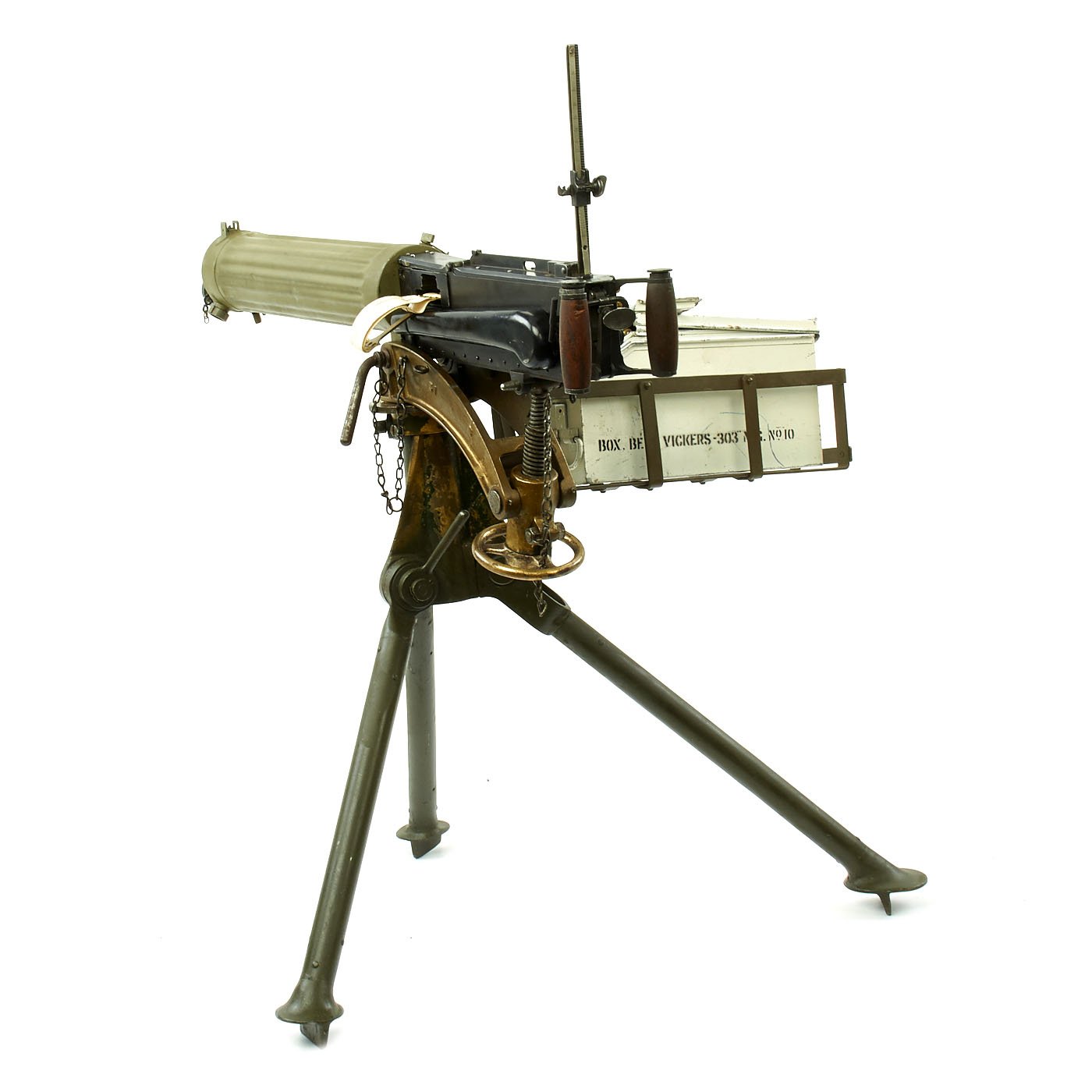 In excellent overall condition this Display Water Cooled Machine Gun comes on an original steel tripod and 1918 dated brass cross head covered in markings of the period. Display complete with white ammunition can, cloth ammunition belt, and a Shell Oil 1933 dated water can.