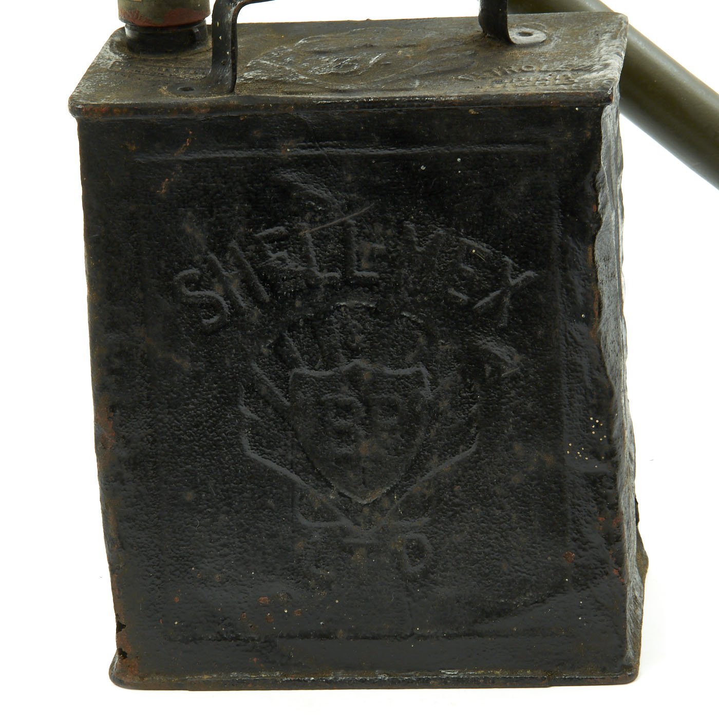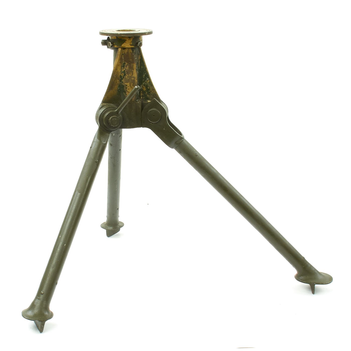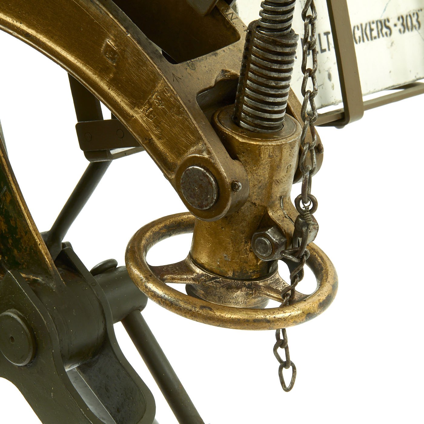 In excellent overall condition this Display Water Cooled Machine Gun comes on an original steel tripod and 1918 dated brass cross head covered in markings of the period. Display complete with white ammunition can, cloth ammunition belt, and a Shell Oil 1933 dated water can.