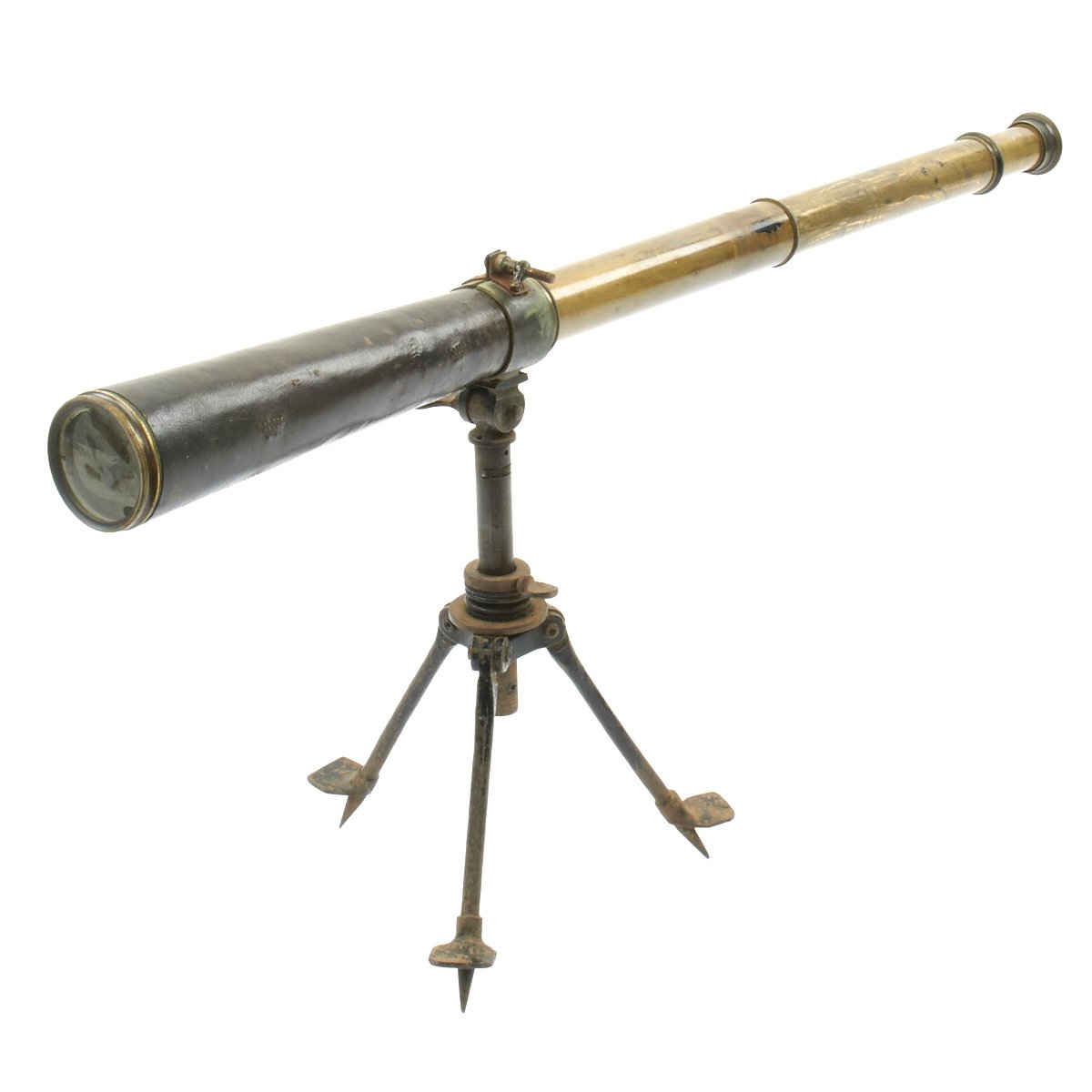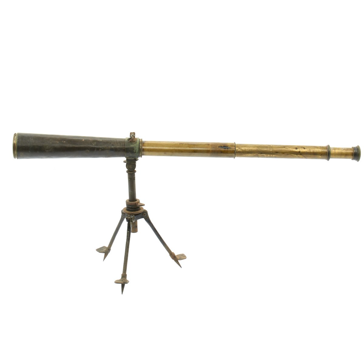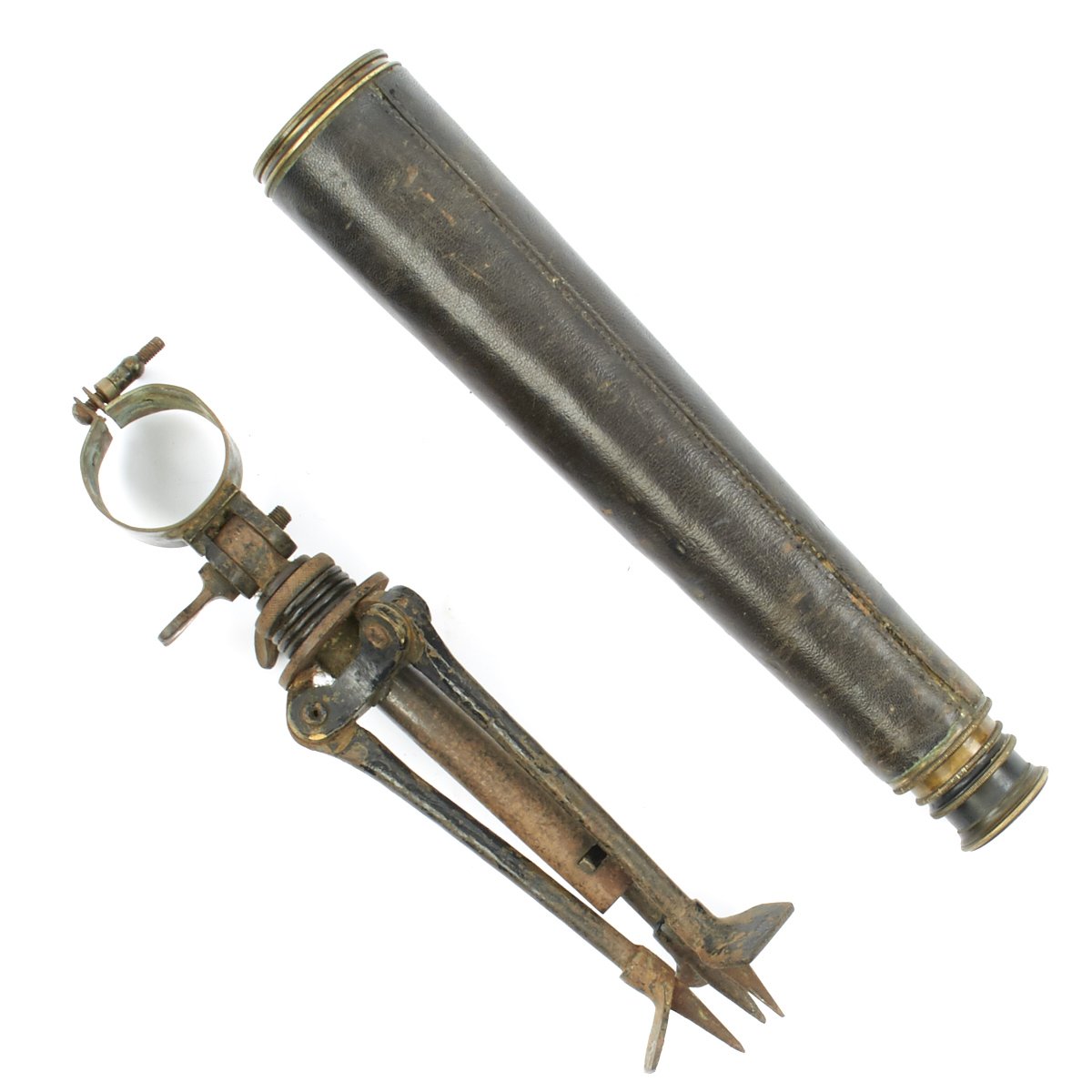 The scope comes with a "custom-made" Trench Tripod, which is made from a British Hotchkiss Portative Machine gun "crow's foot" mounting tripod. It has been trench armorer modified to mount the telescope, with a brass ring at the top.