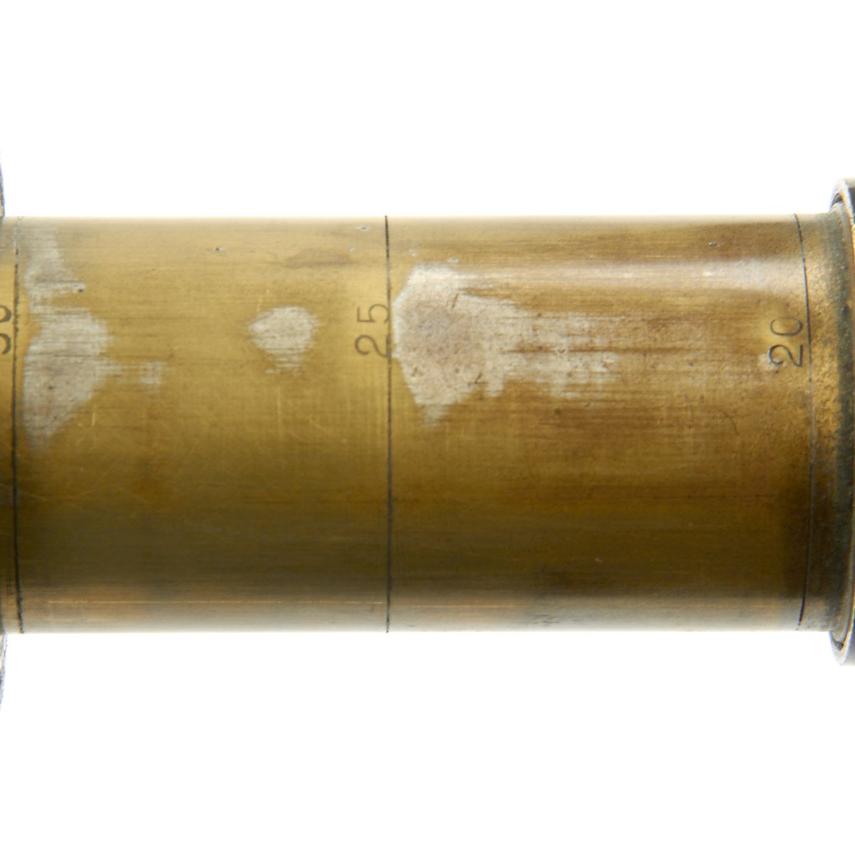 The telescope is still fully functional, with clear optics giving a good image. The tube nearest the eye piece is marked with ranging rings, which are marked 20 / 25 / 30, for 200, 250, and 300 yards. This way, the telescope could be used to set the range for the machine gunners, and was probably used as a spotting telescope.