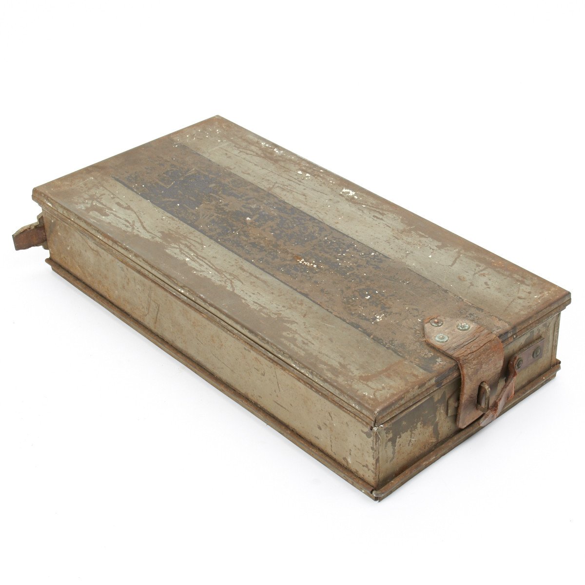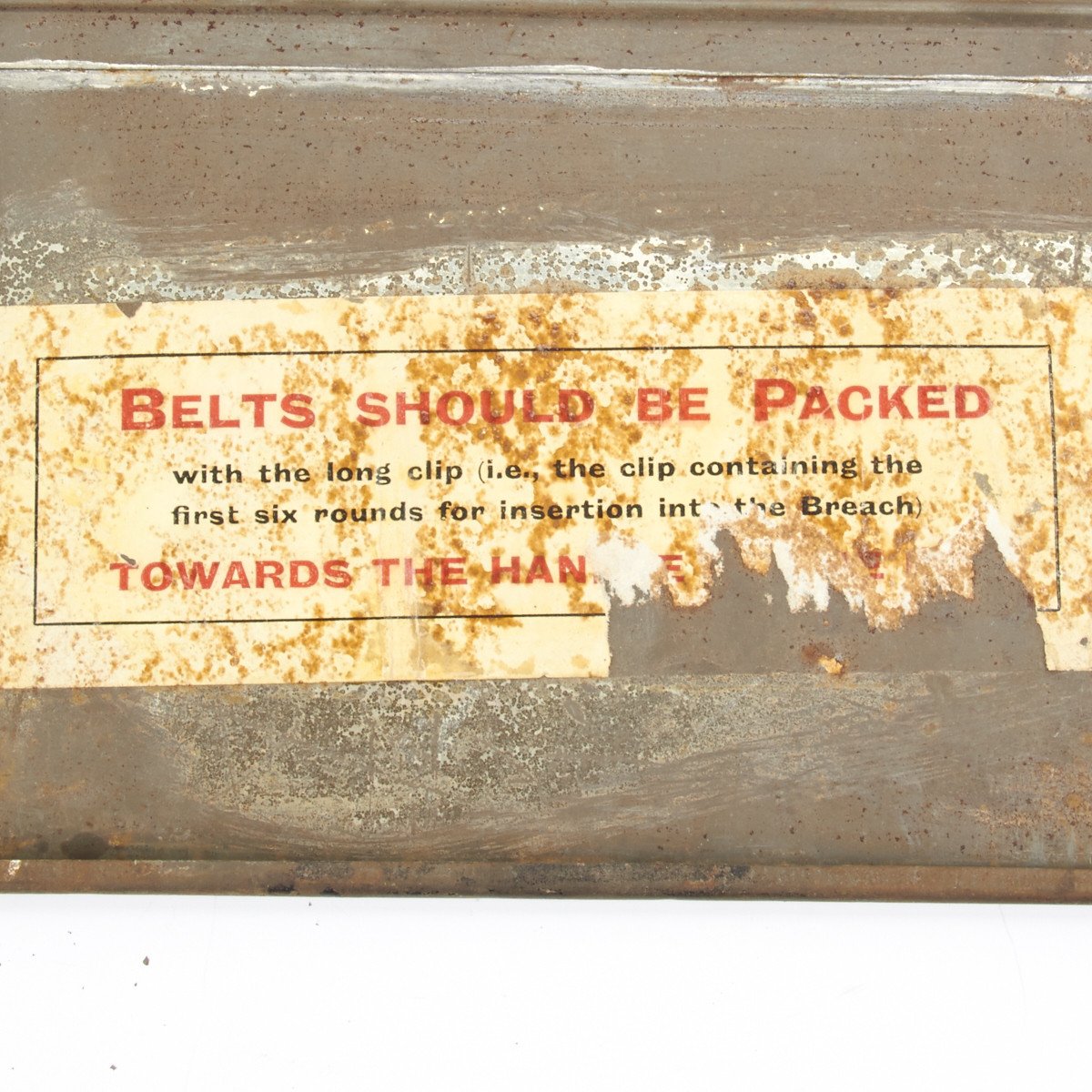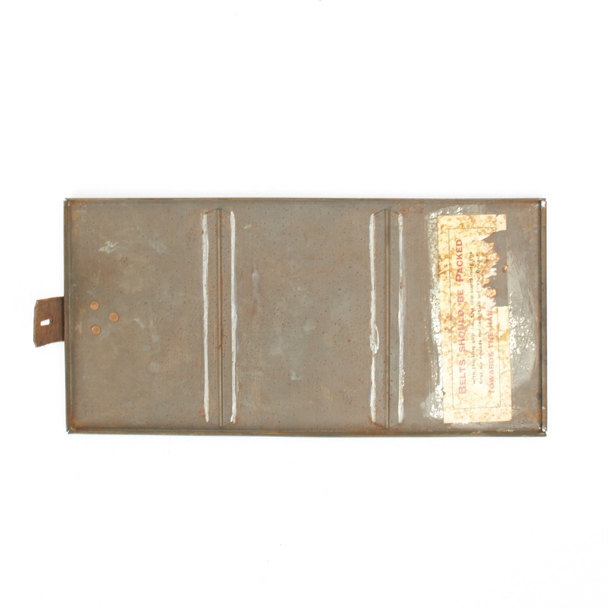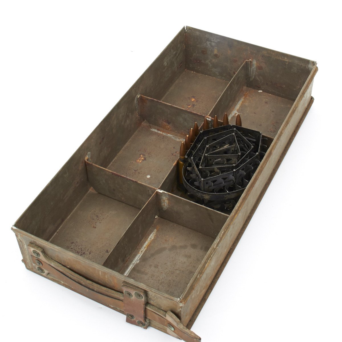 Our offering consists of a steel belt box with one jointed Hotchkiss feed strip/belt with long tab. The normal feed device for Hotchkiss guns is a flat feed strip of 24 to 30 or so rounds, but where space is at a premium, the strips are jointed every three or so rounds so the strip can fold. Our strips consist of sixteen three-round segments and one four-round segment with a long lead tab. Each segment is stamped "HOTCHKISS". The belts are in heavy grease. The boxes have heavy leather fittings in excellent condition. Each box holds six folding belts. In the tank, the boxes were stored flat in a stack behind the driver.