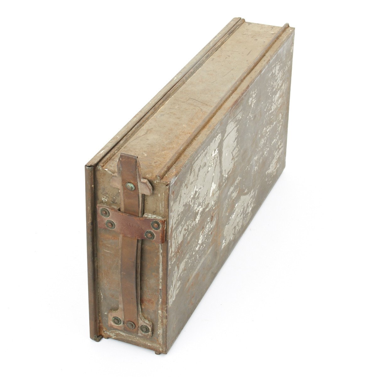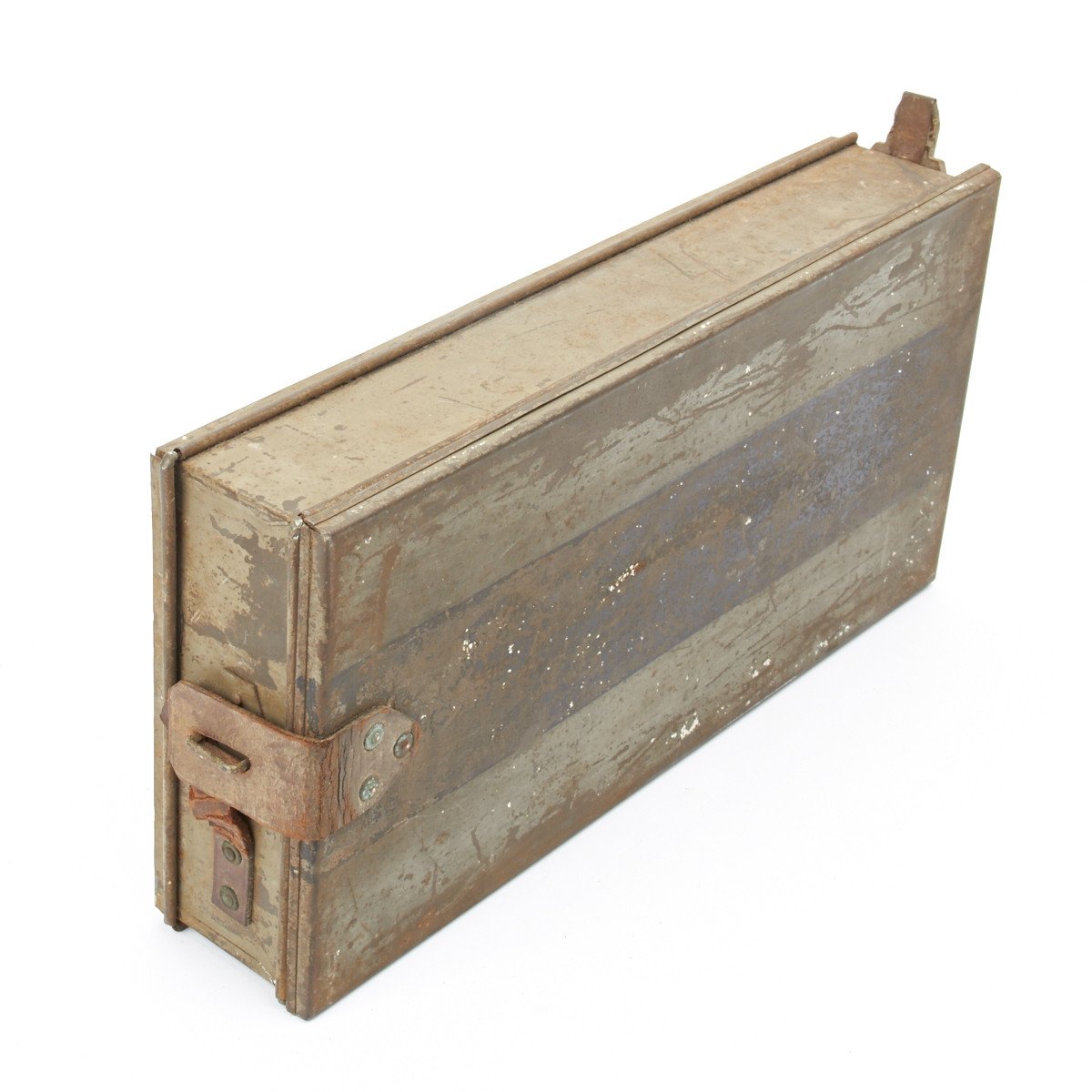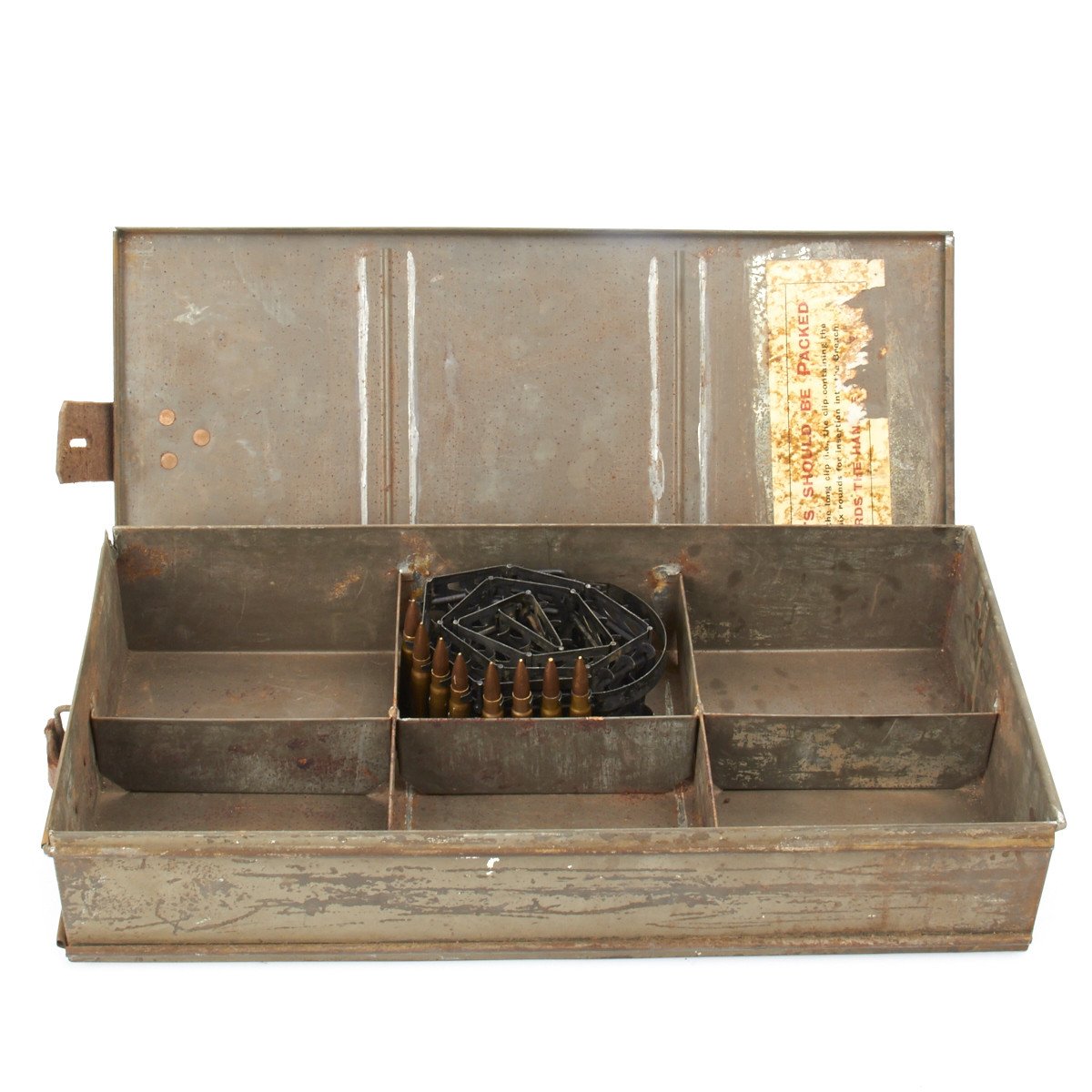 Our offering consists of a steel belt box with one jointed Hotchkiss feed strip/belt with long tab. The normal feed device for Hotchkiss guns is a flat feed strip of 24 to 30 or so rounds, but where space is at a premium, the strips are jointed every three or so rounds so the strip can fold. Our strips consist of sixteen three-round segments and one four-round segment with a long lead tab. Each segment is stamped "HOTCHKISS". The belts are in heavy grease. The boxes have heavy leather fittings in excellent condition. Each box holds six folding belts. In the tank, the boxes were stored flat in a stack behind the driver.
