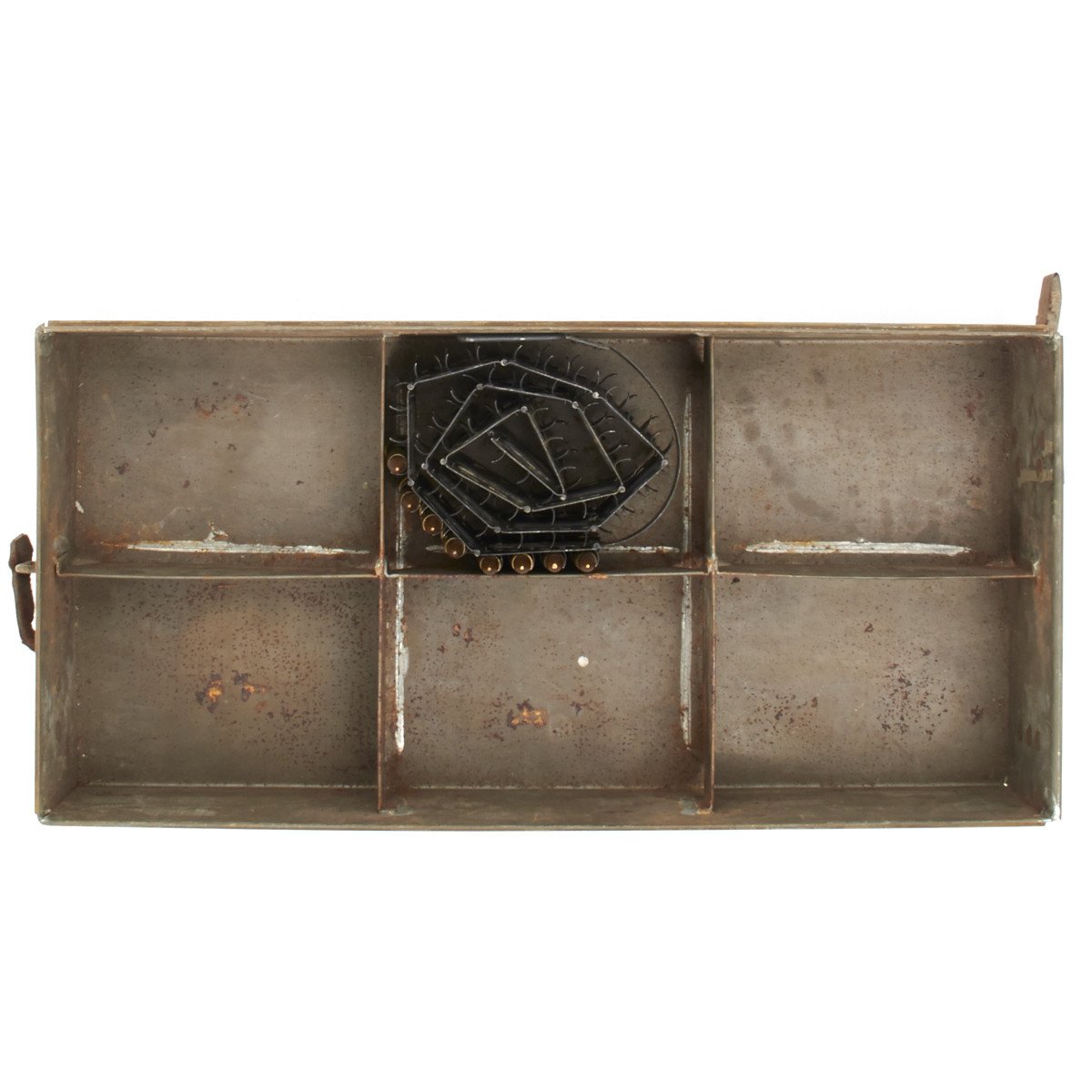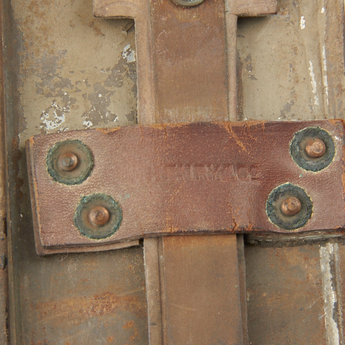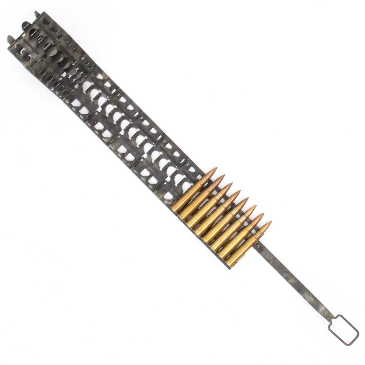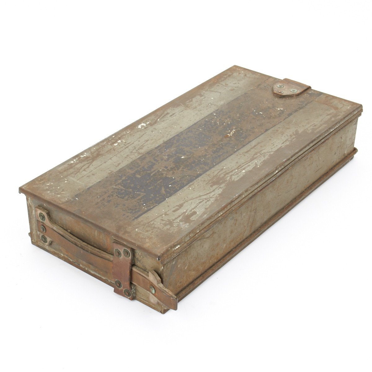 Our offering consists of a steel belt box with one jointed Hotchkiss feed strip/belt with long tab. The normal feed device for Hotchkiss guns is a flat feed strip of 24 to 30 or so rounds, but where space is at a premium, the strips are jointed every three or so rounds so the strip can fold. Our strips consist of sixteen three-round segments and one four-round segment with a long lead tab. Each segment is stamped "HOTCHKISS". The belts are in heavy grease. The boxes have heavy leather fittings in excellent condition. Each box holds six folding belts. In the tank, the boxes were stored flat in a stack behind the driver.