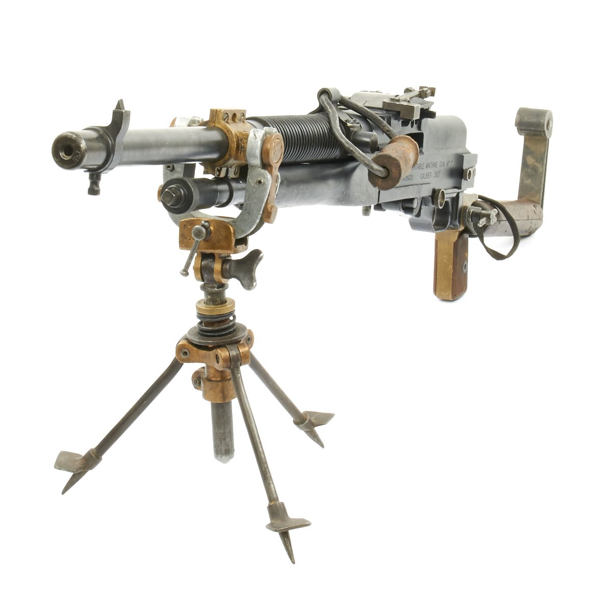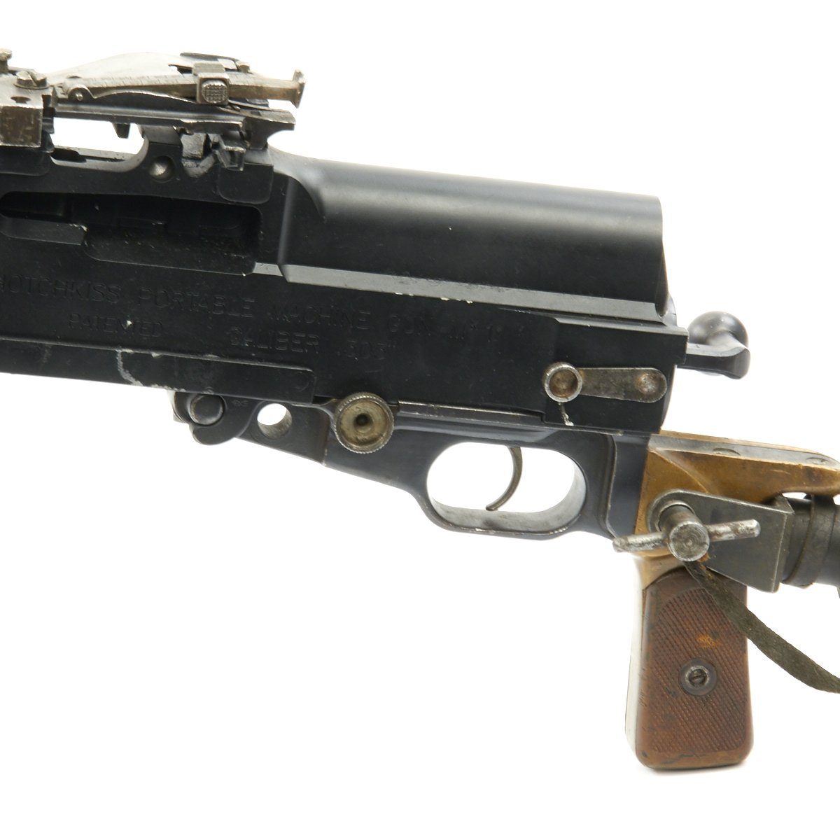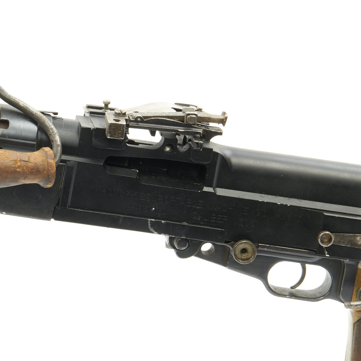 Original Item: Only One Available. This is an excellent Museum Grade Condition British WWI manufacture Hotchkiss .30 Caliber pattern Portative cavalry Display Machine Gun constructed from all original parts on a machined solid display BATF receiver. Complete with markings, Crows Foot Tripod and detachable "L" shoulder stock. These were extensively used in WWI, being the first portable machine gun. Very intricate and very rare.