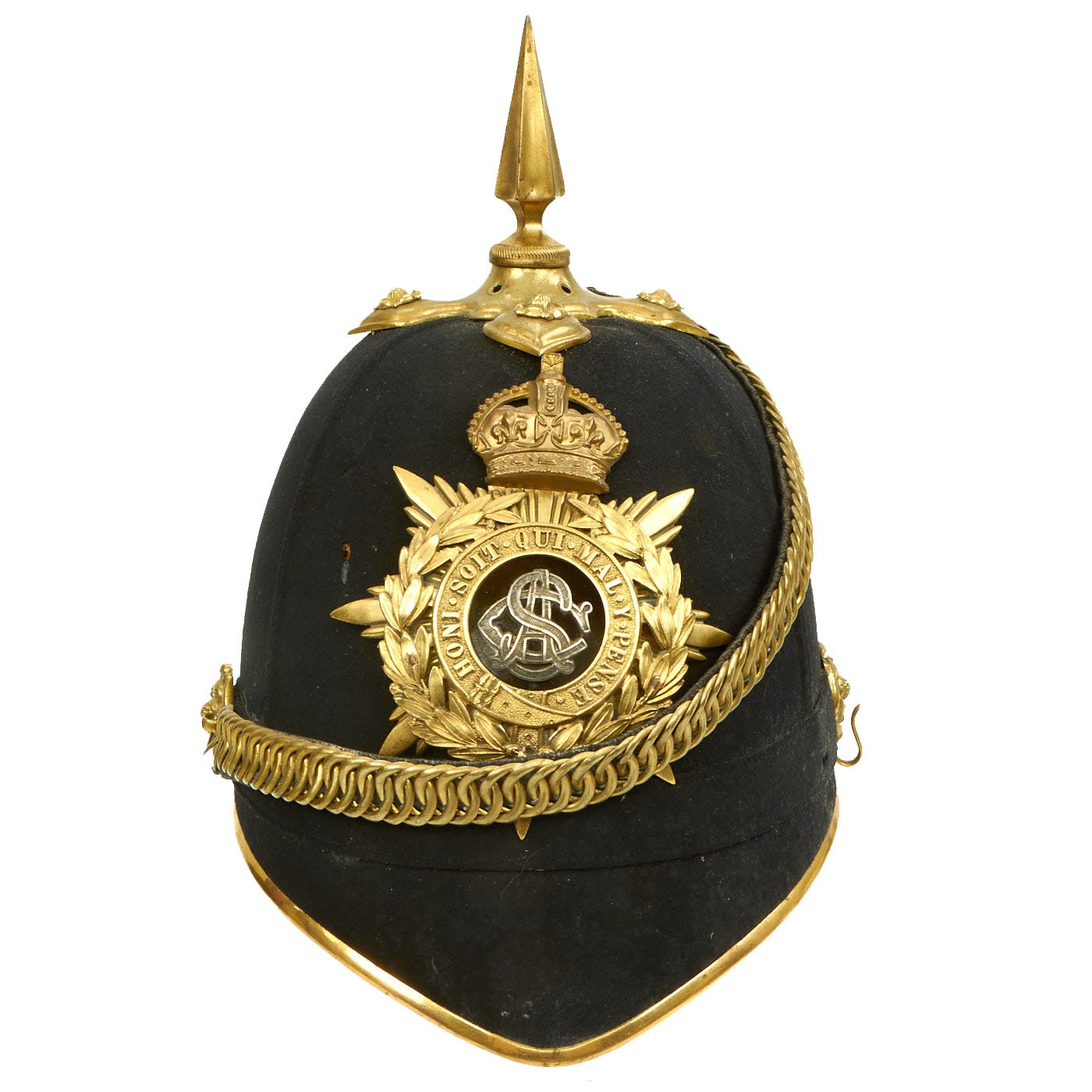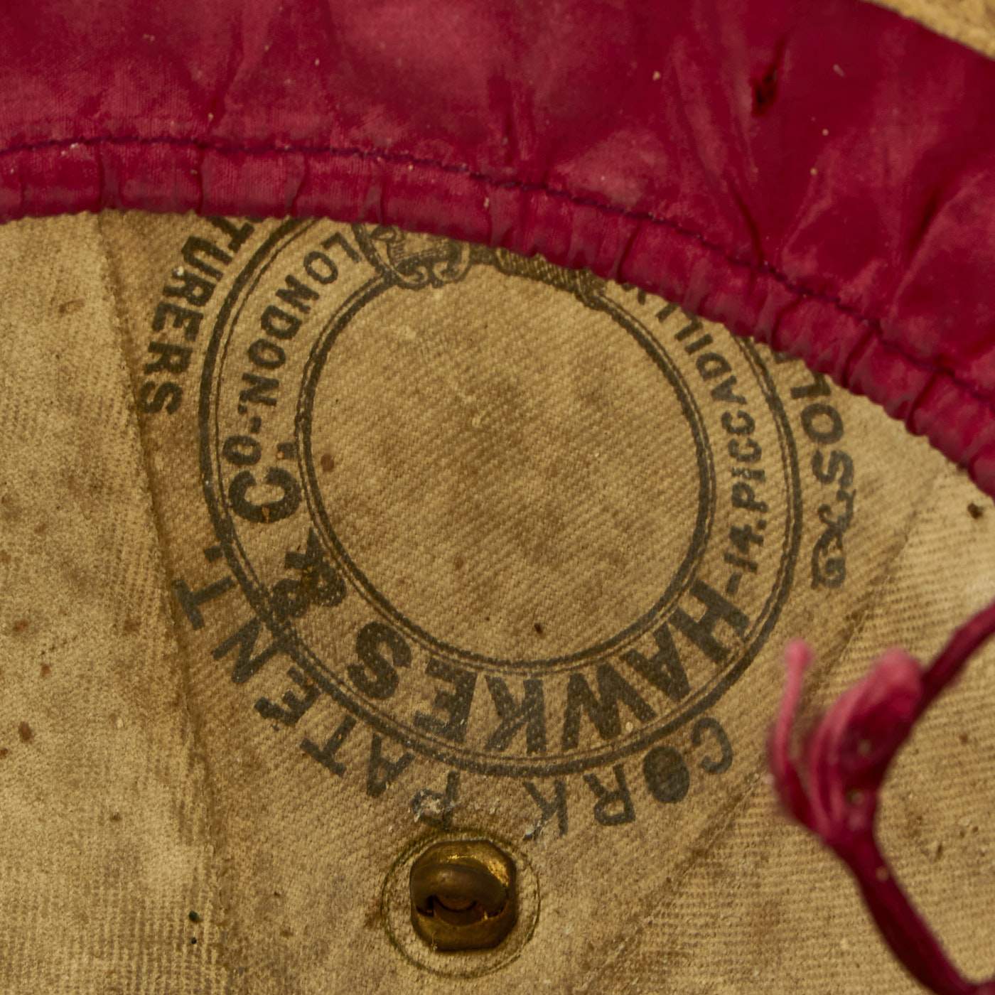 - Original WWI Era British Army Service Corps Blue Cloth Helmet by Hawkes & Co. This particular helmet bears a King's crown on the helmet plate indicating it was issued after 1901. Comes complete with ink stamped maker mark on the interior. Overall condition is very good, size is approximately US 7 1/4 (58cm).