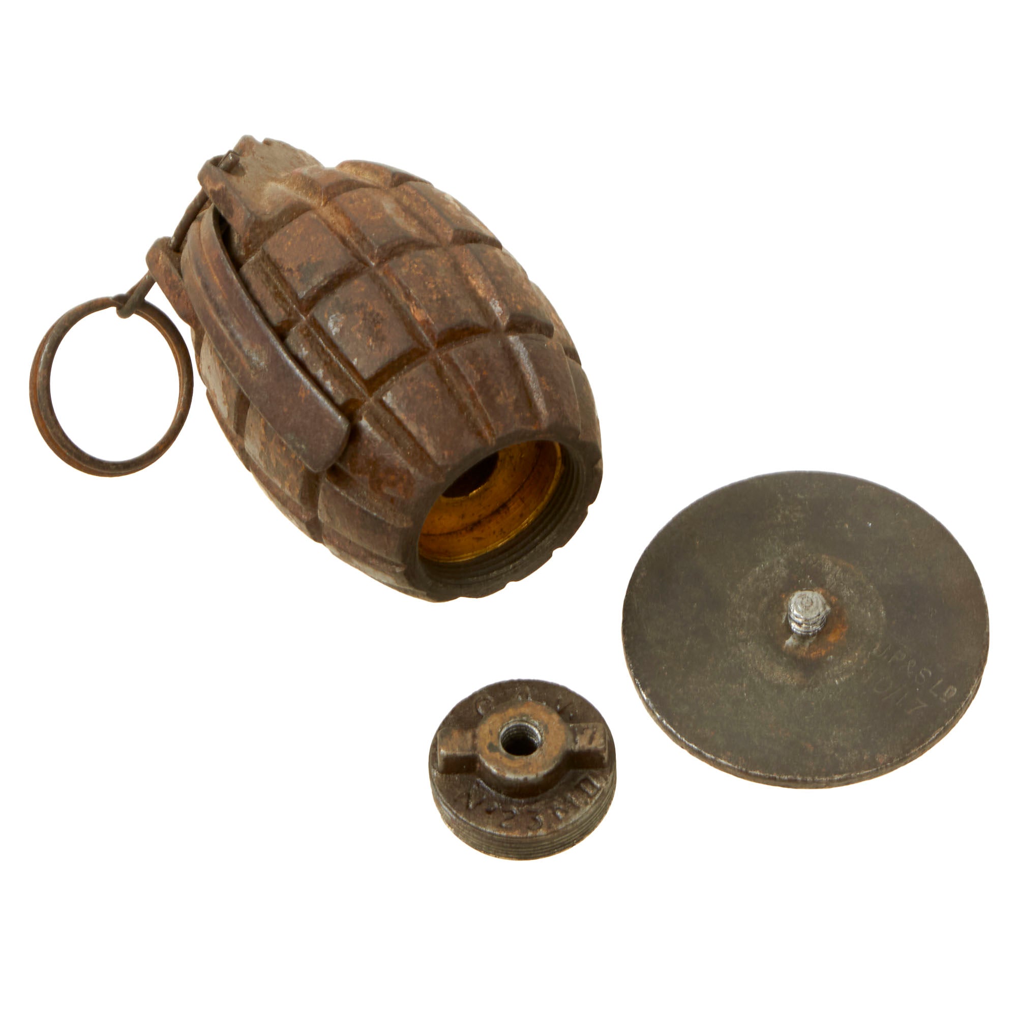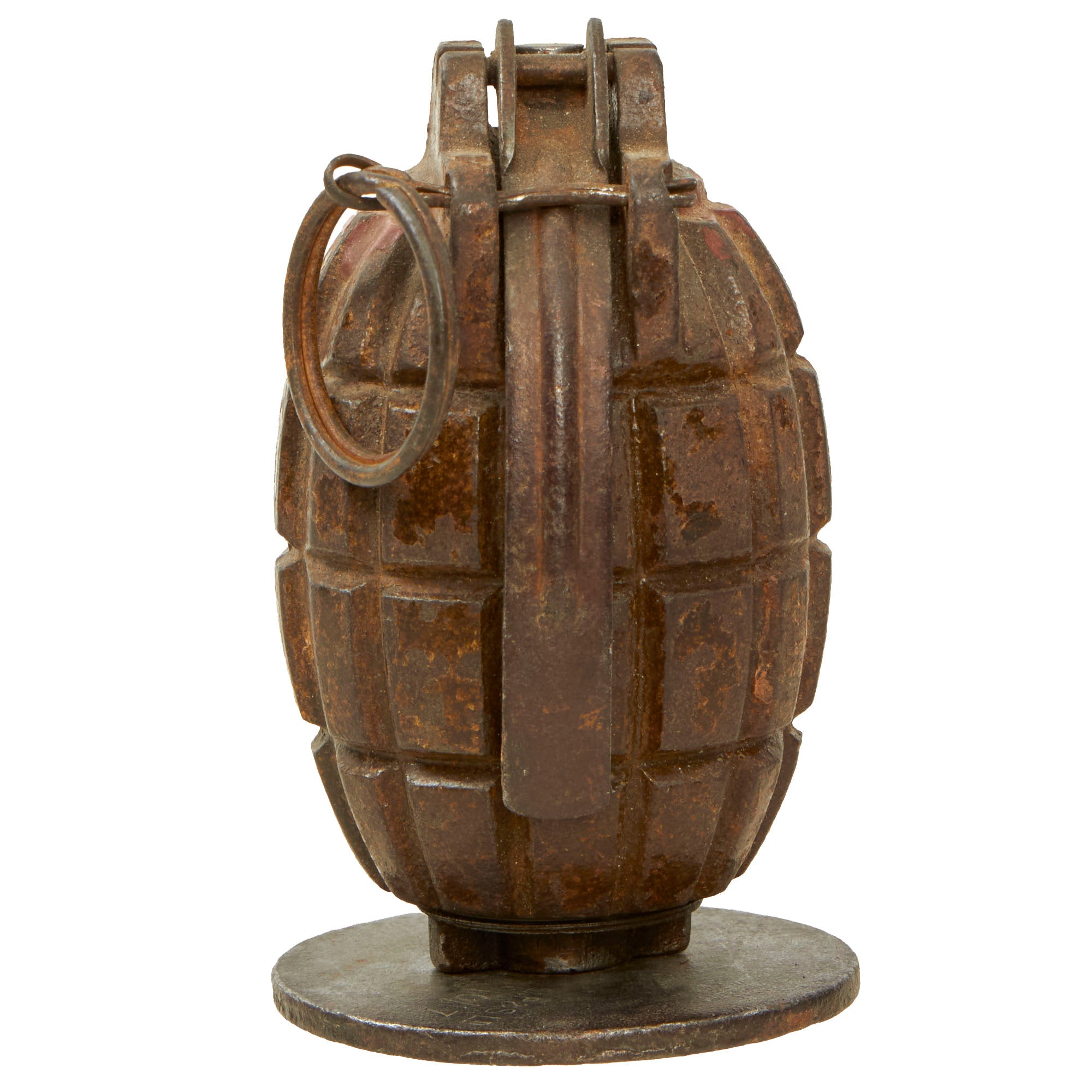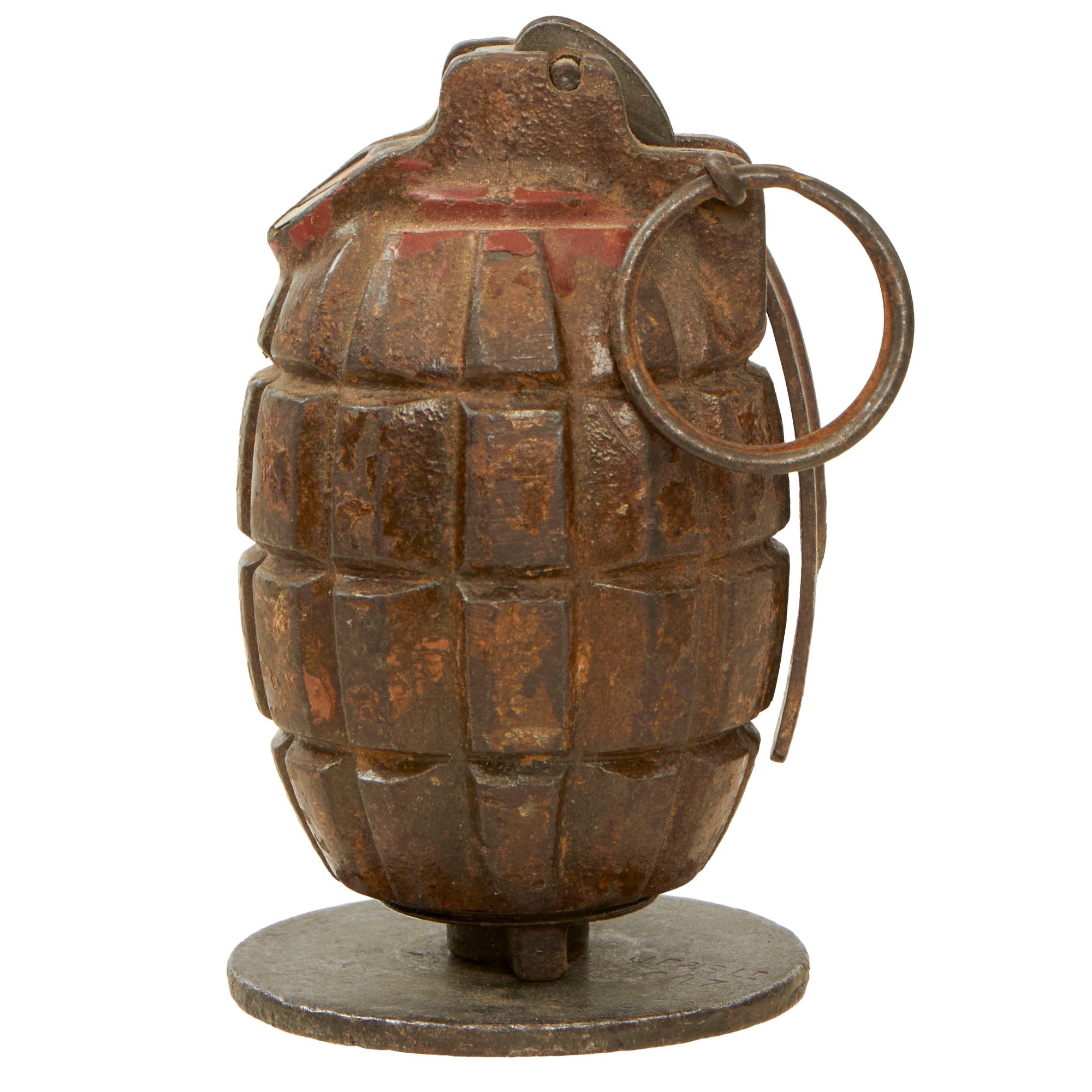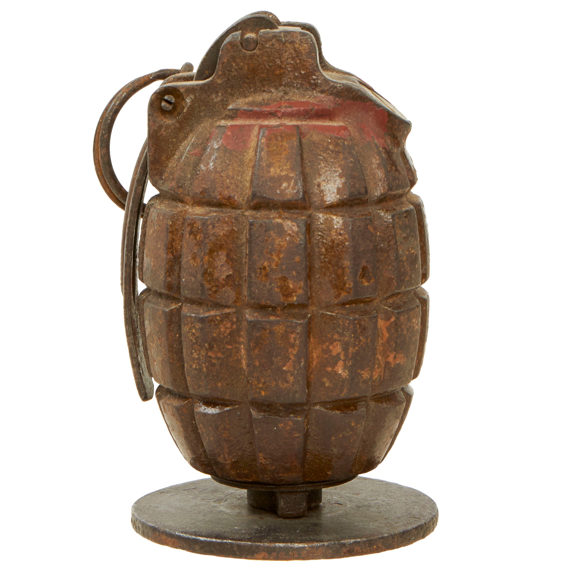 Original Item: Only One Available. This is a very nice example of a (No 5) No. 23 MkII "Mills Bomb" Grenade. This is the first version of the "Mills Bomb" produced, and was one of the standard grenades used by British forces during WWI. This wonderful example is complete with internal parts including the spring loaded ignition (no explosives!) and the original pull pin as well as the base plate which works perfect as a display stand!