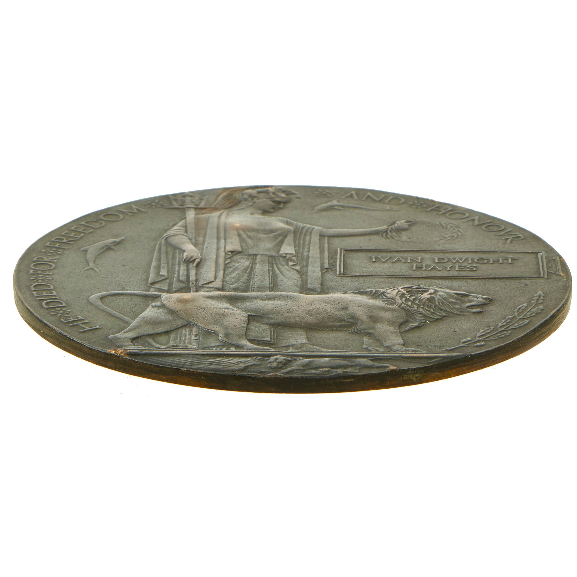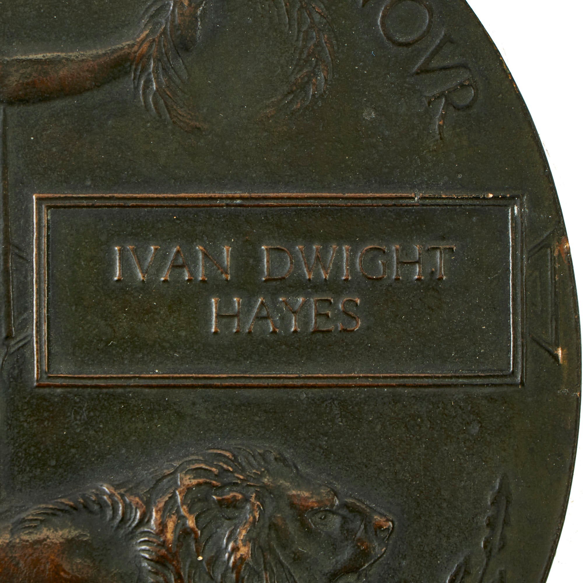 Original Item: Only One Available. This is a lovely WWI Memorial Plaque commemorating the life and service of Ivan Dwight Hayes, a British/Canadian soldier who fell on an unknown battlefield with an unknown unit. We have not been able to locate any service information on this soldier.