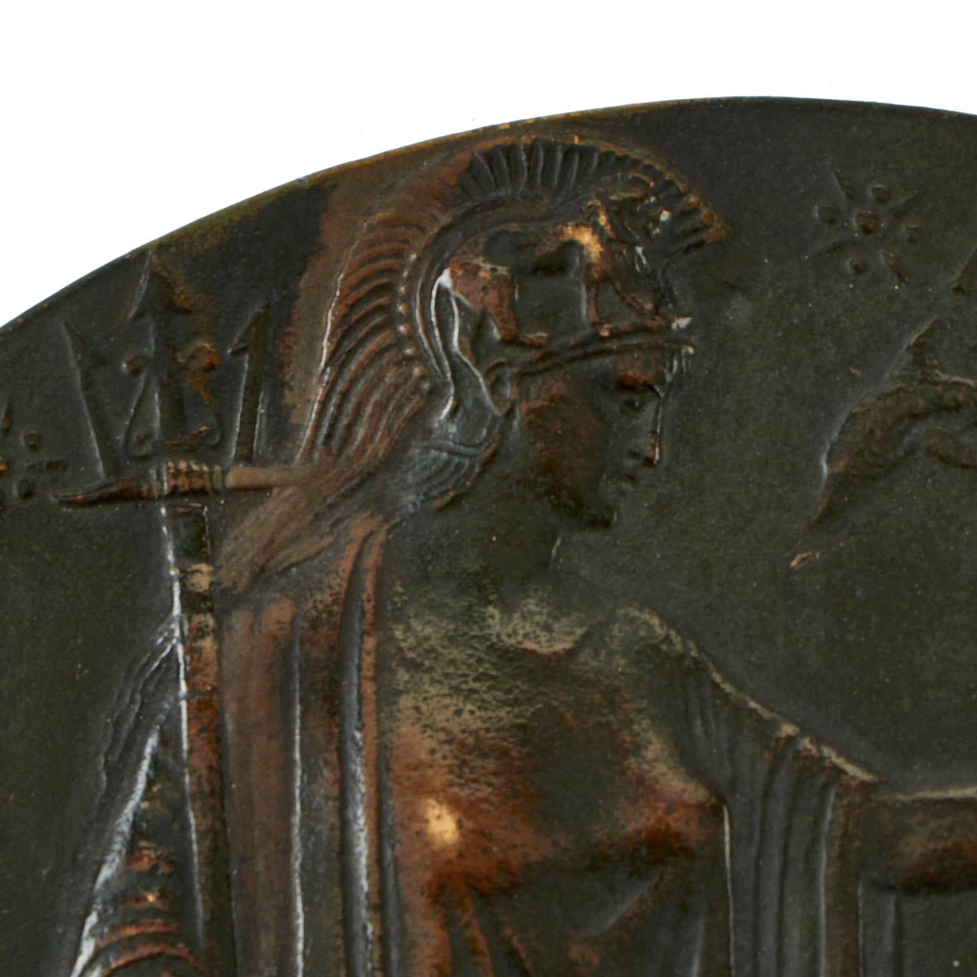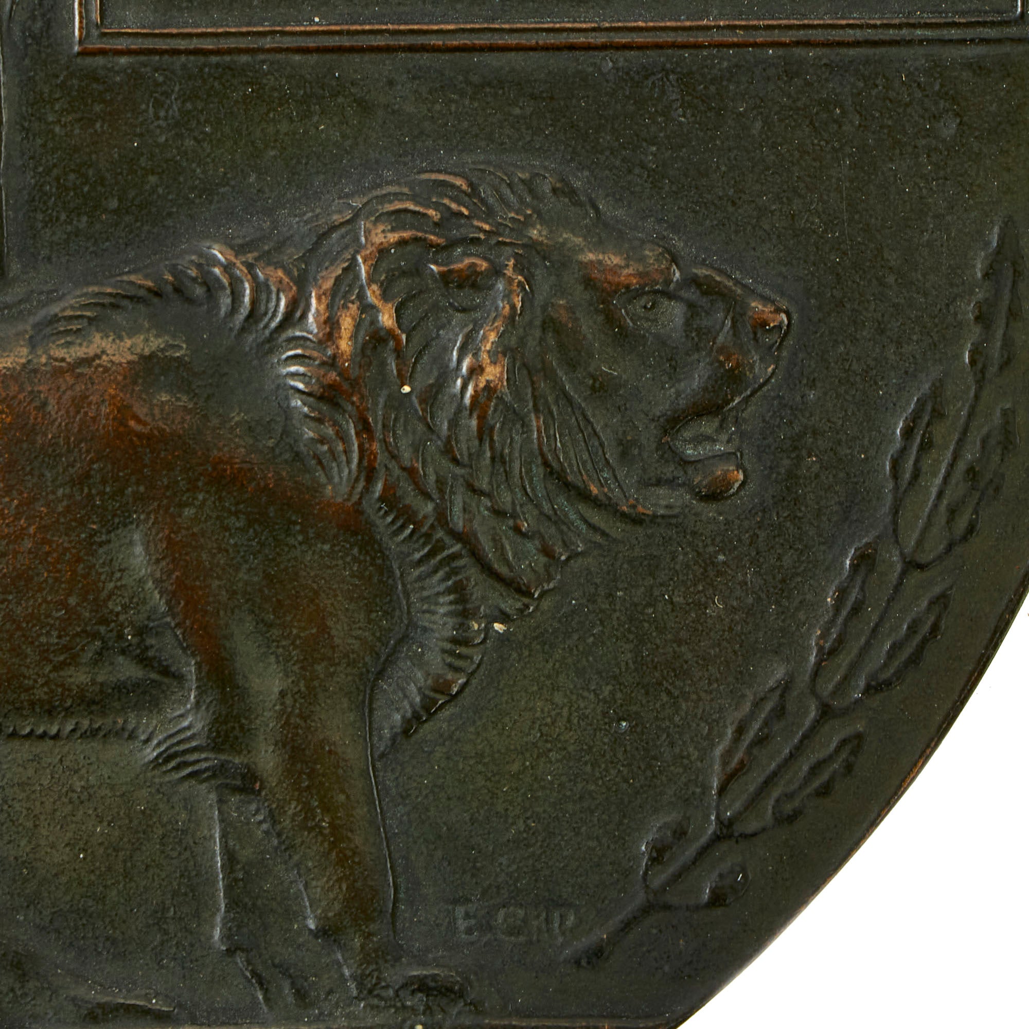 Carter Preston's winning design includes an image of Britannia holding a trident and standing with a lion. The designer's initials, E.CR.P., appear above the front paw. In her outstretched left hand Britannia holds an olive wreath above the ansate tablet bearing the deceased's name cast in raised letters. Below the name tablet, to the right of the lion, is an oak spray with acorns. The name does not include the rank since there was to be no distinction between sacrifices made by different individuals. Two dolphins swim around Britannia, symbolizing Britain's sea power, and at the bottom a second lion is tearing apart the German eagle. The reverse is blank, making it a plaquette rather than a table medal.