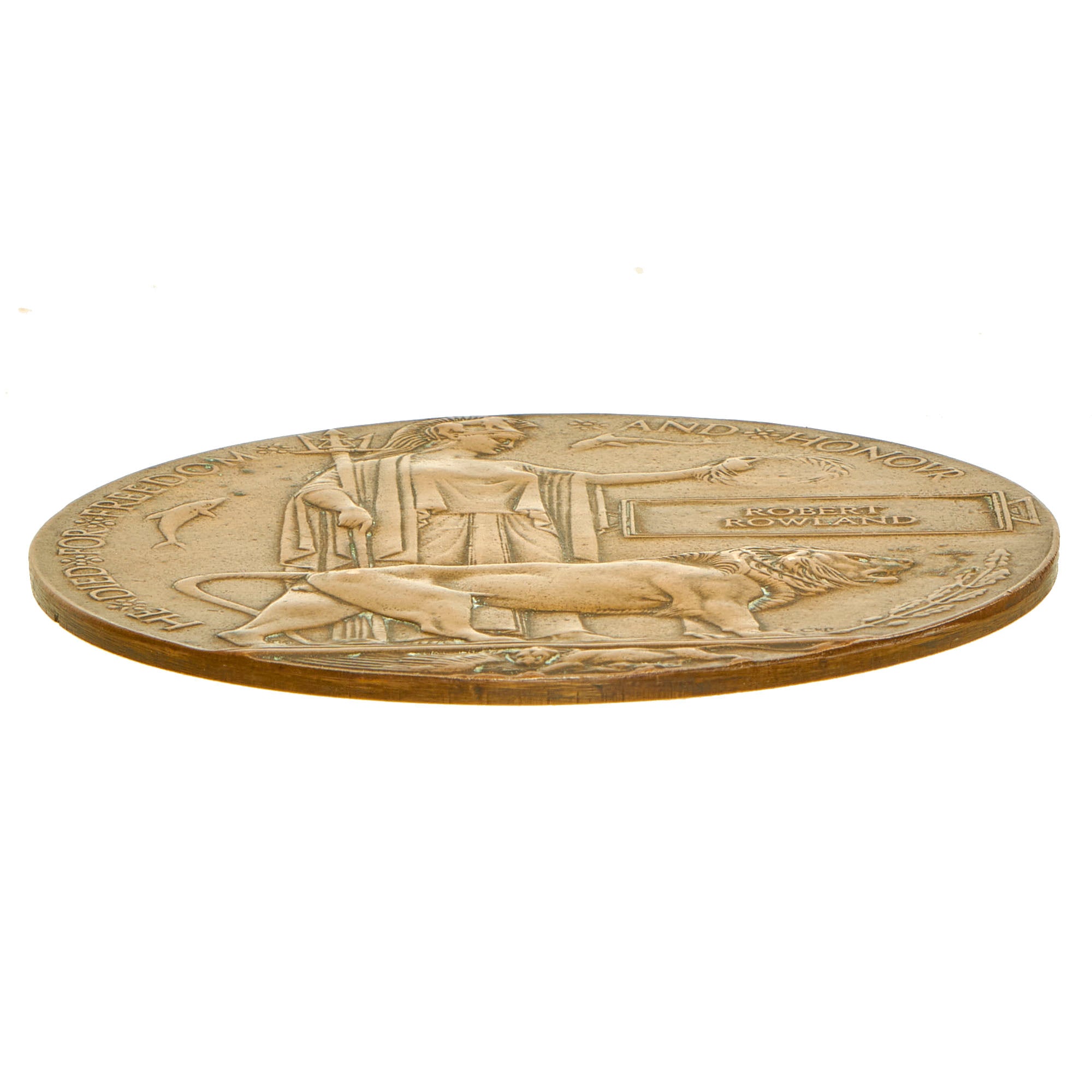 Around the picture the legend reads (in capitals) "He died for freedom and honour", or for the 1500 plaques issued to commemorate women, "She died for freedom and honour".
