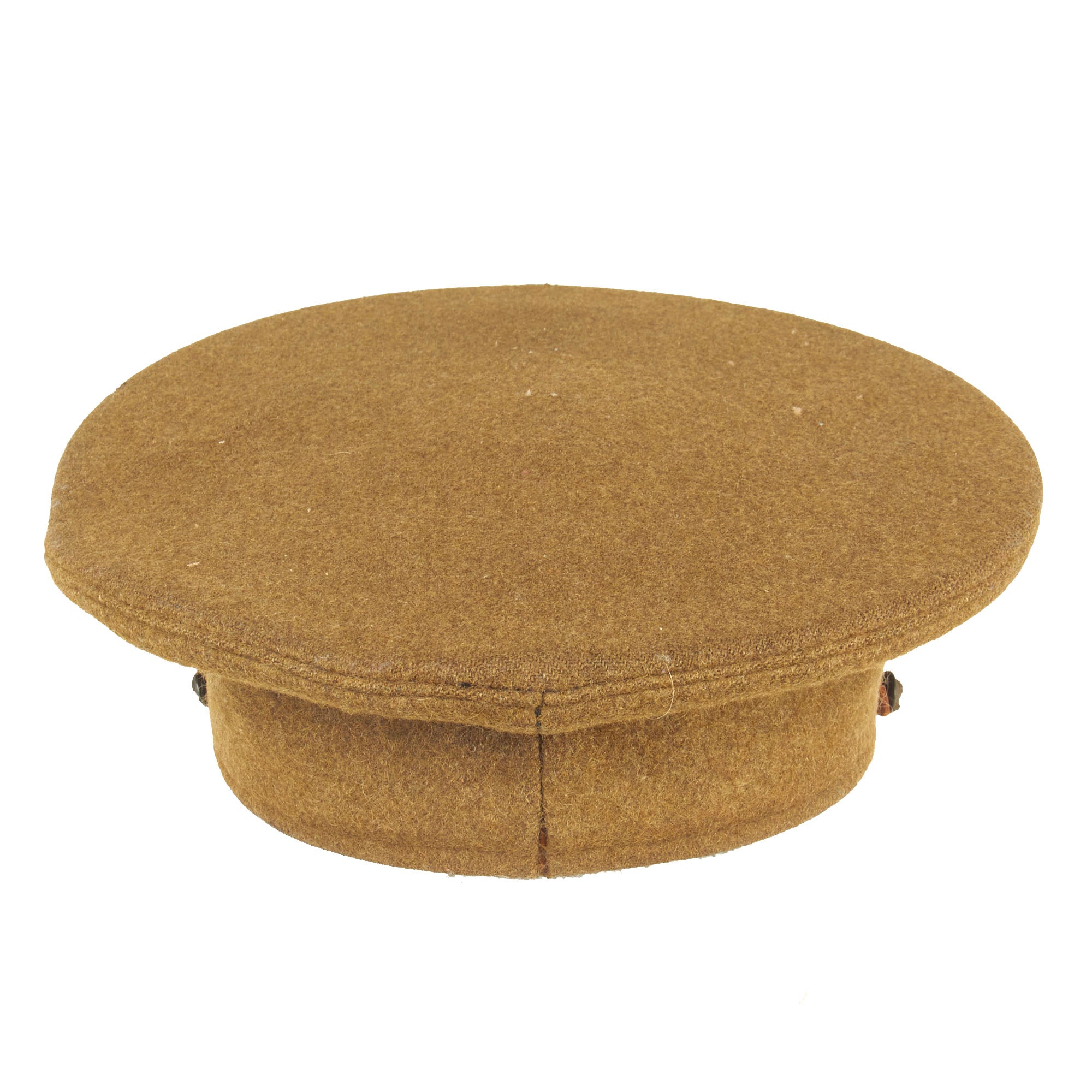 The Winter Forage Cap was made from the same drab serge wool as the SD cap but did not have rigid stiffening to the top, body, or visor. It was heavily padded and lined with quilted shirt material. It had an external neck flap that when not in use folded up onto the top of the cap and secured with a cloth slider. For this reason, there was no leather chinstrap.