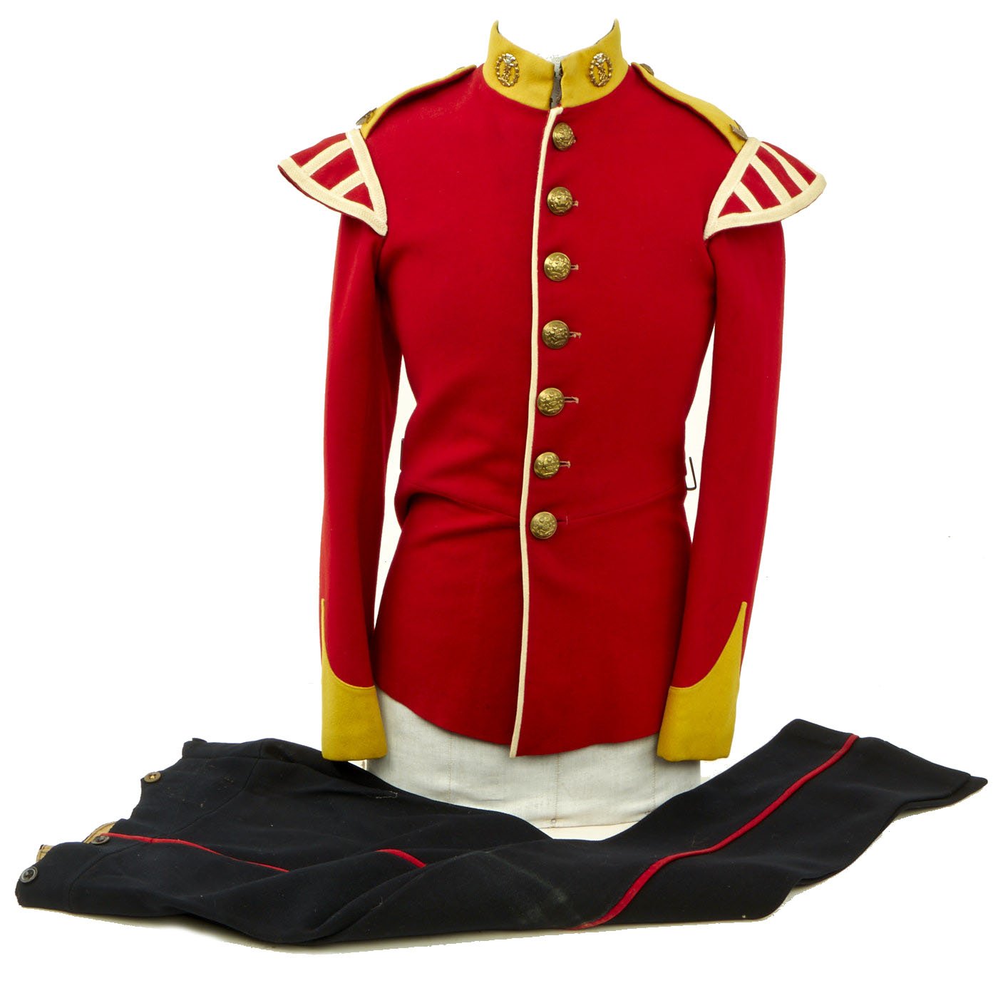 Original Item: Only One Available. Dating from the around World War One this fine uniform is in very good condition and features original gilt Middlesex Regiment collar dogs, buttons and epaulet pins. Front of tunic has 7 buttons, epaulets indicate other ranks. Blue trousers with red strap in fine shape.