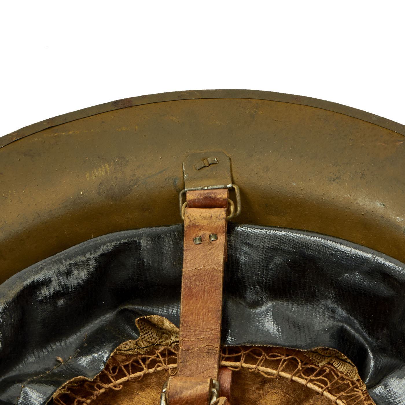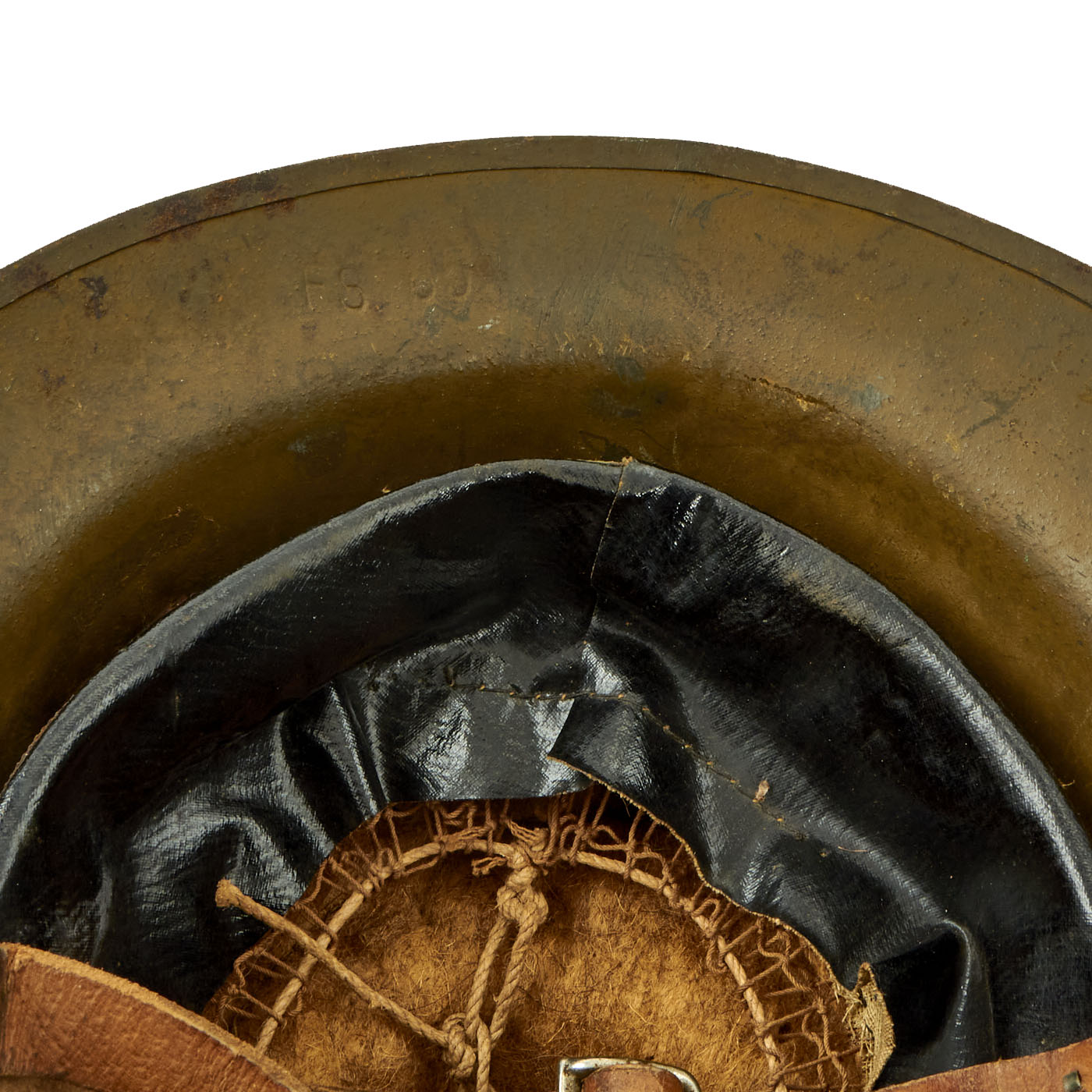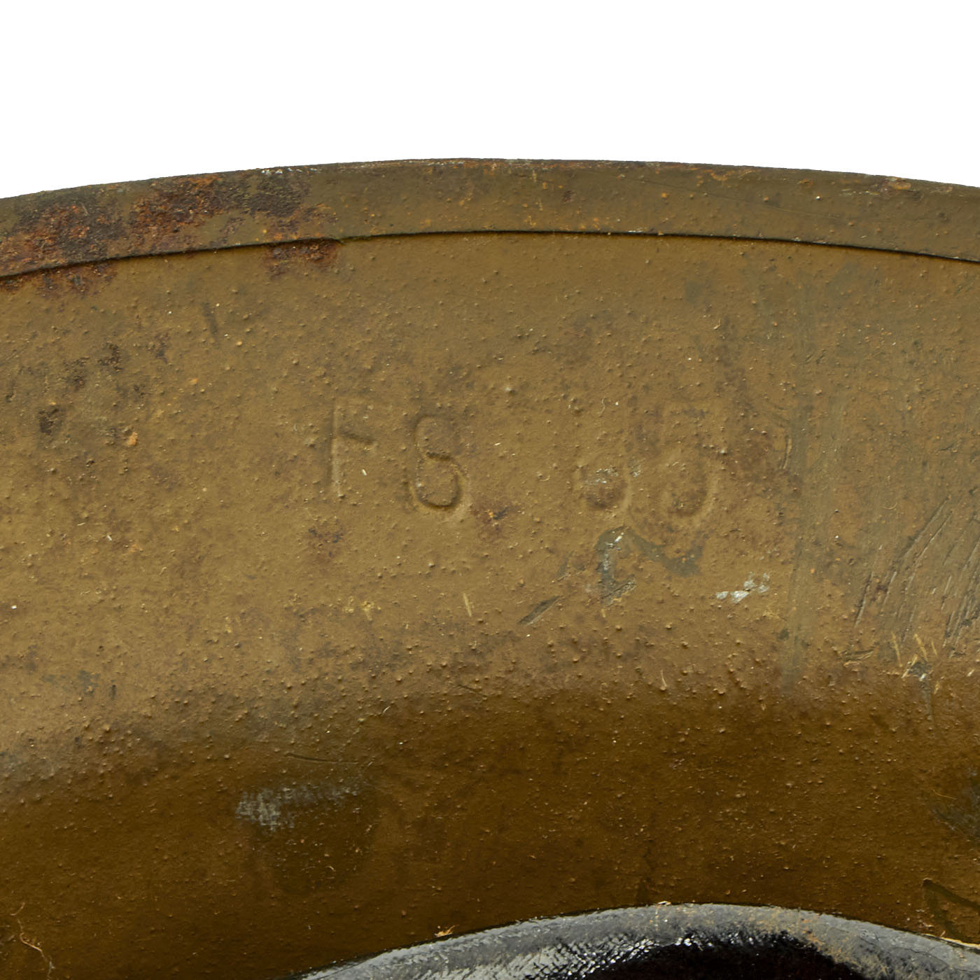 The shell is maker marked with a stamping on the underside of the rim that reads FS 85, it is partially obscured under the heavy green paint and can be difficult to read. The split rivets and heat lot number indicate that this helmet shell was produced in Britain. FS stands for Thomas Firth & Sons Ltd of Sheffield who produced helmets from 1916 to 1918.