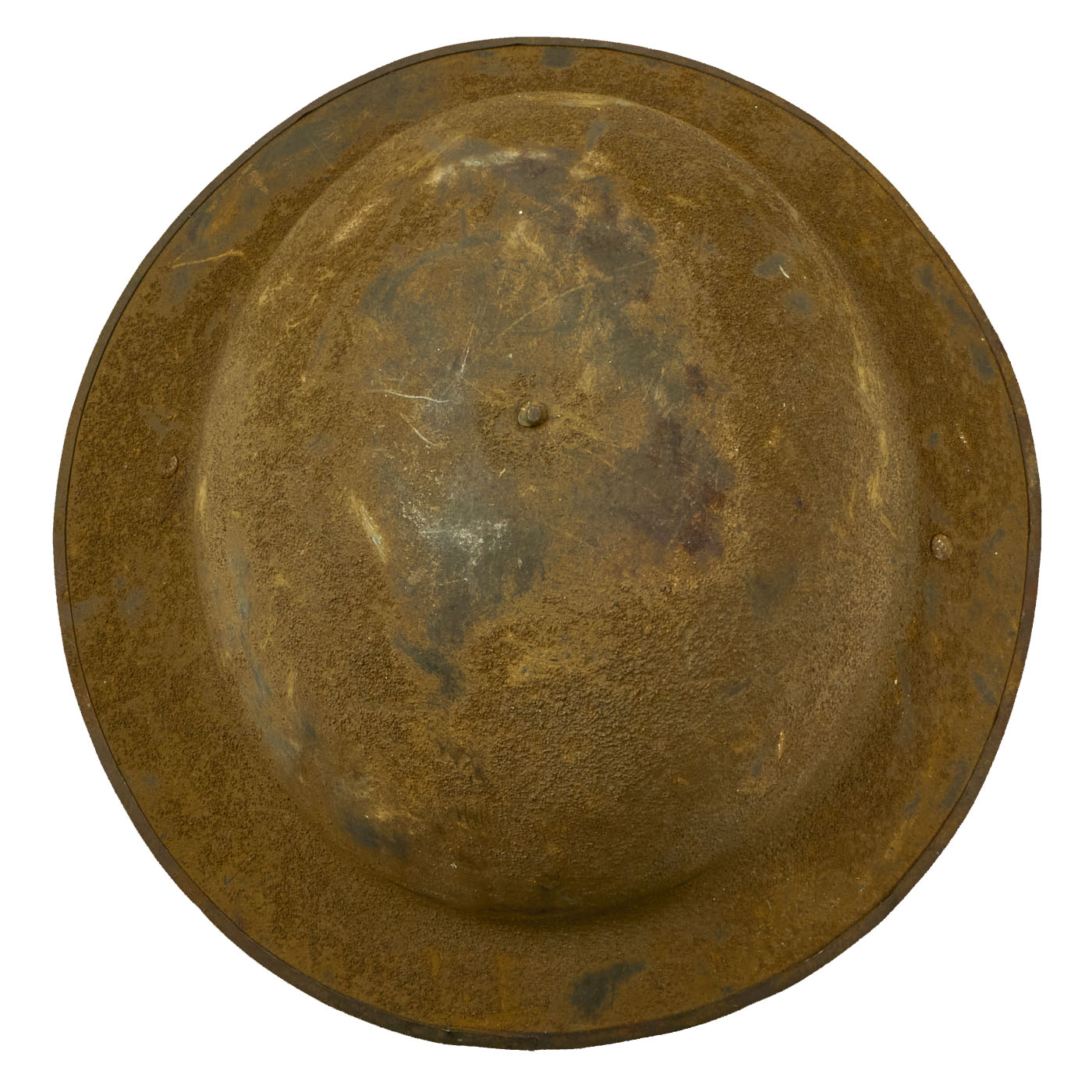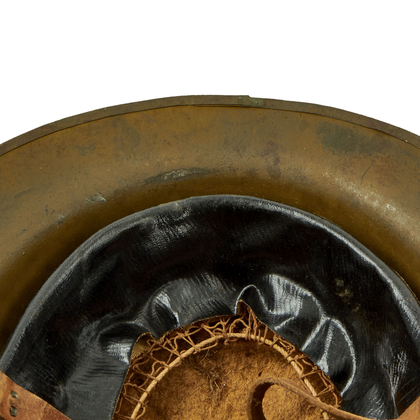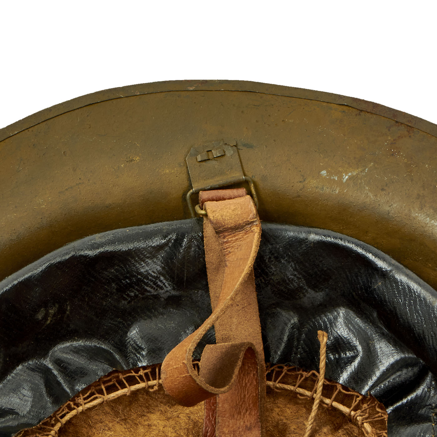 The shell is maker marked with a stamping on the underside of the rim that reads FS 85, it is partially obscured under the heavy green paint and can be difficult to read. The split rivets and heat lot number indicate that this helmet shell was produced in Britain. FS stands for Thomas Firth & Sons Ltd of Sheffield who produced helmets from 1916 to 1918.