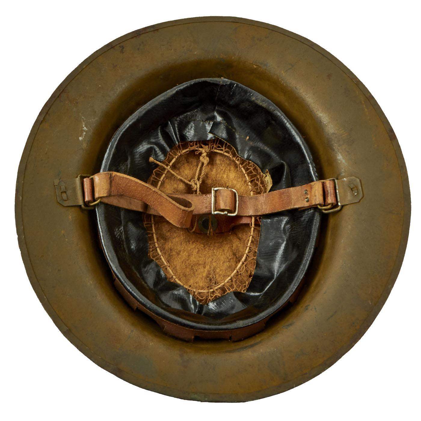 The liner is also in quite nice shape, with a very good oil cloth liner, and the top felt pad is still present, though worn and has the correct rubber “donut” underneath. The chin strap is intact and does not have any major cracks or tears. The leather is however somewhat stained and delicate, so definitely handle with care.
