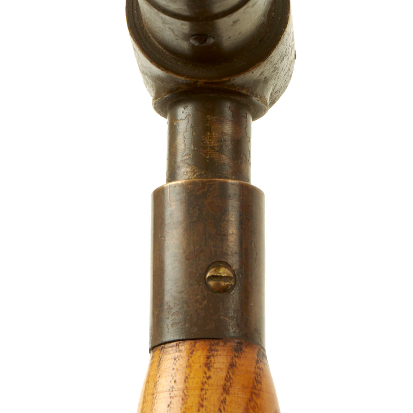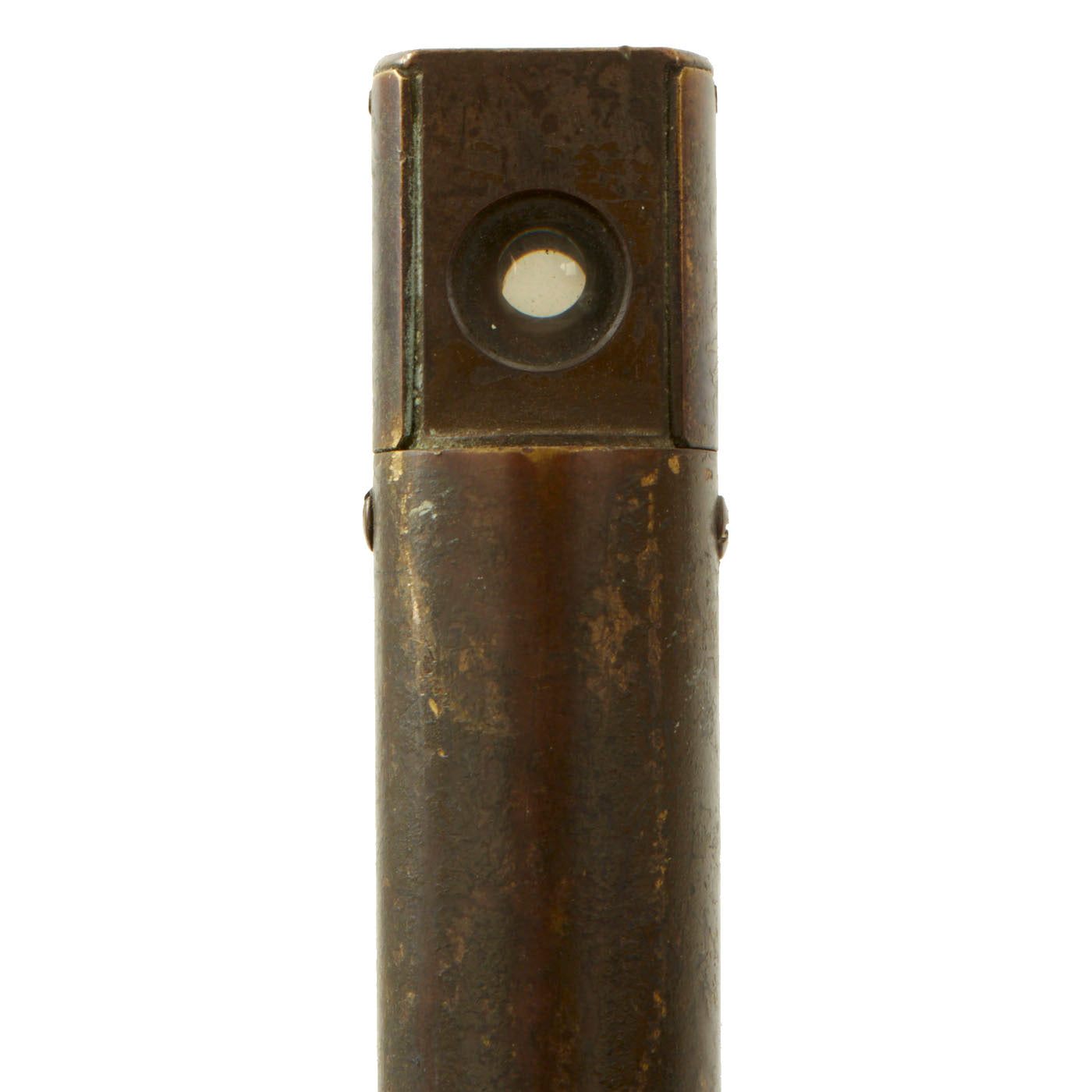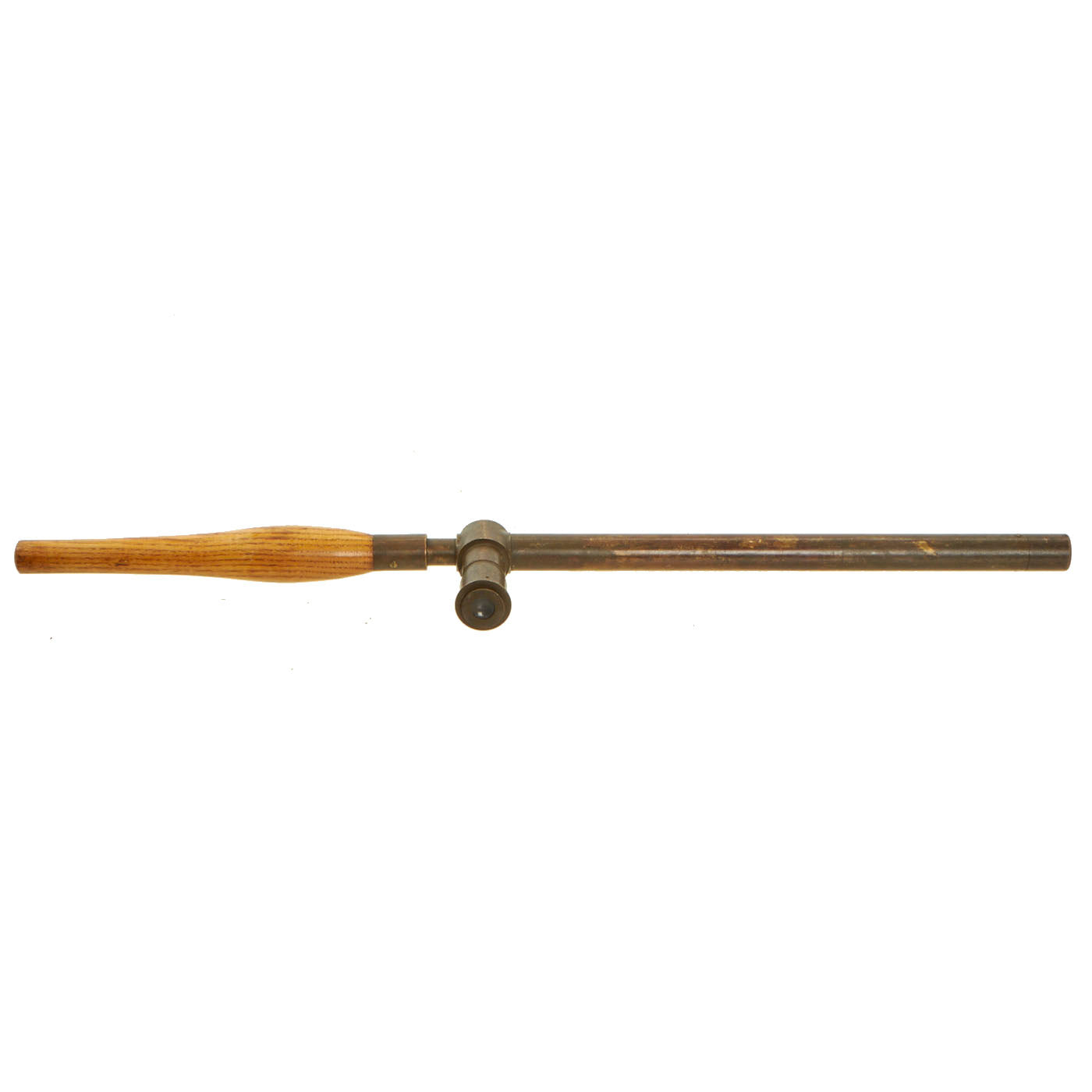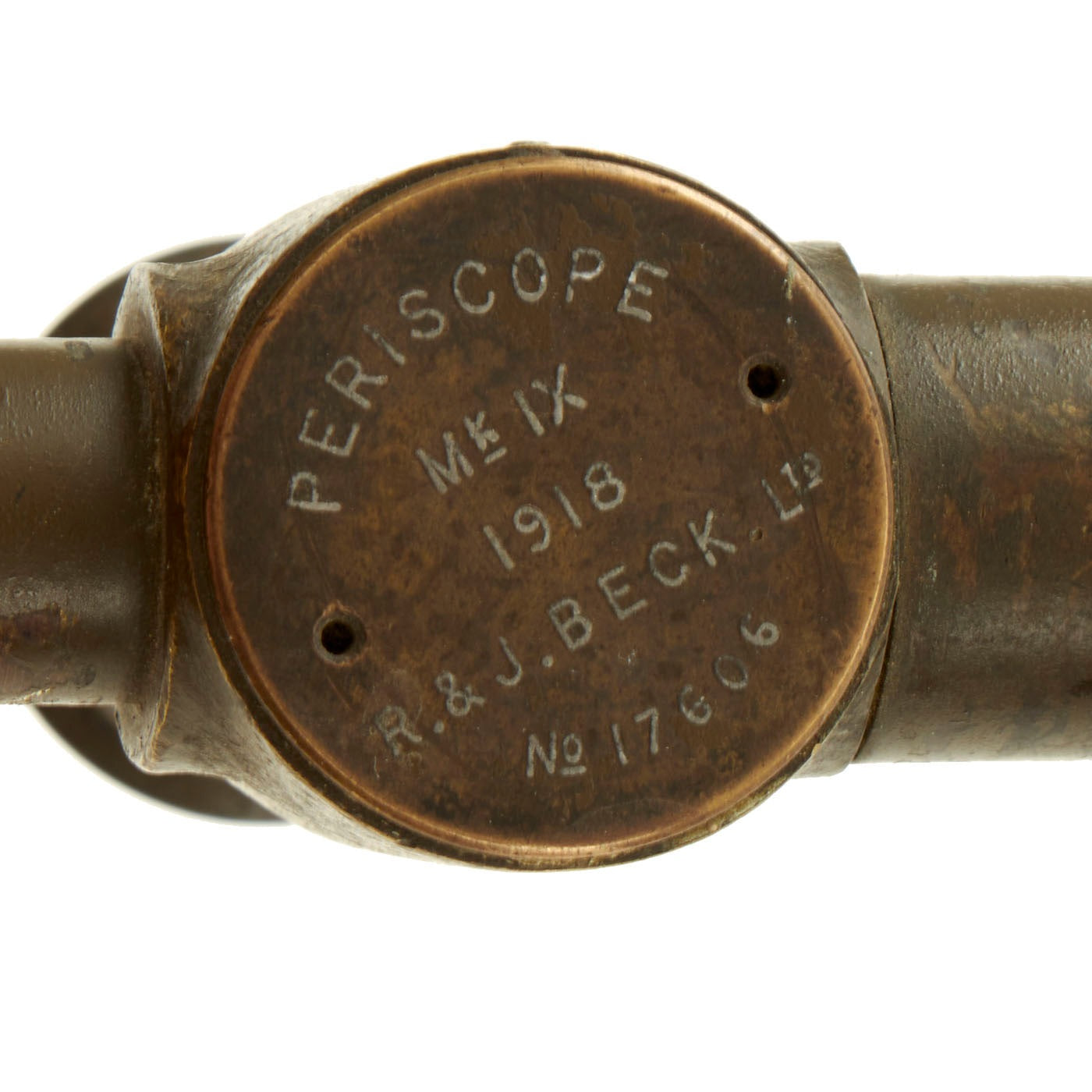 The instrument measures 23" overall and has a removable varnished turned beech wood handle with a brass screw attachment point. The brass eyepiece has a focus ring on it and the optics are in good clear condition and all function as intended. The brass body of the periscope fortunately still carries most of its original olive drab paint. These instruments are often found stripped and the brass body polished to a high shine but this one has fortunately avoided this fate. The Mk IX are generally regarded as intended for use by Officers and they provided the potentially lifesaving function by enabling a clear view over the parapet of the trench into 'no man's land' without risking life from the German sharpshooters in the opposing trench.