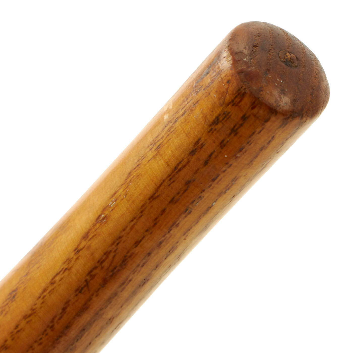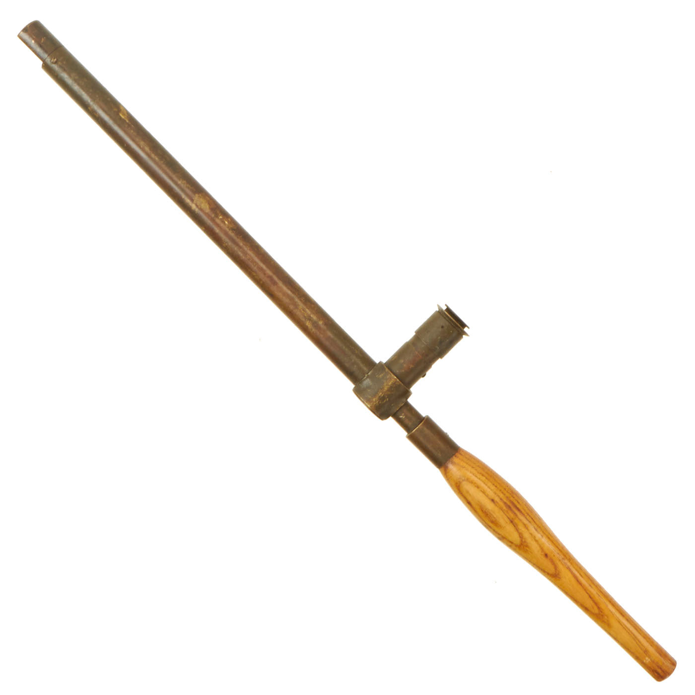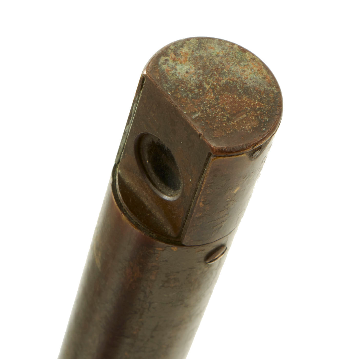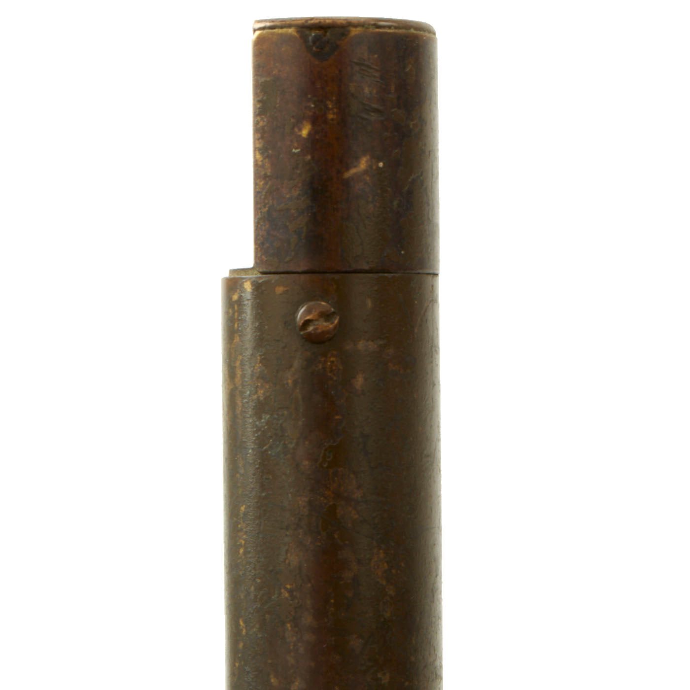 The instrument measures 23" overall and has a removable varnished turned beech wood handle with a brass screw attachment point. The brass eyepiece has a focus ring on it and the optics are in good clear condition and all function as intended. The brass body of the periscope fortunately still carries most of its original olive drab paint. These instruments are often found stripped and the brass body polished to a high shine but this one has fortunately avoided this fate. The Mk IX are generally regarded as intended for use by Officers and they provided the potentially lifesaving function by enabling a clear view over the parapet of the trench into 'no man's land' without risking life from the German sharpshooters in the opposing trench.