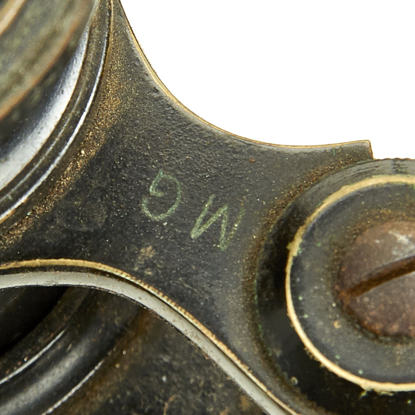 The glasses are the standard MkV version used in WWI, and feature extendable sunshields, and the barrels are covered with brown leather. Extending the barrels shows markings on the inner sleeves, with a British Broad Arrow over H* on the left side, and MkV SPL over serial number 70599 on the right. These are probably a special order, which is what the "SPL" abbreviation stands for. There is also the marking M G on the eyepiece cross support. Checking with a magnet indicates that these binoculars are entirely non-magnetic, and look to be made entirely from brass.
