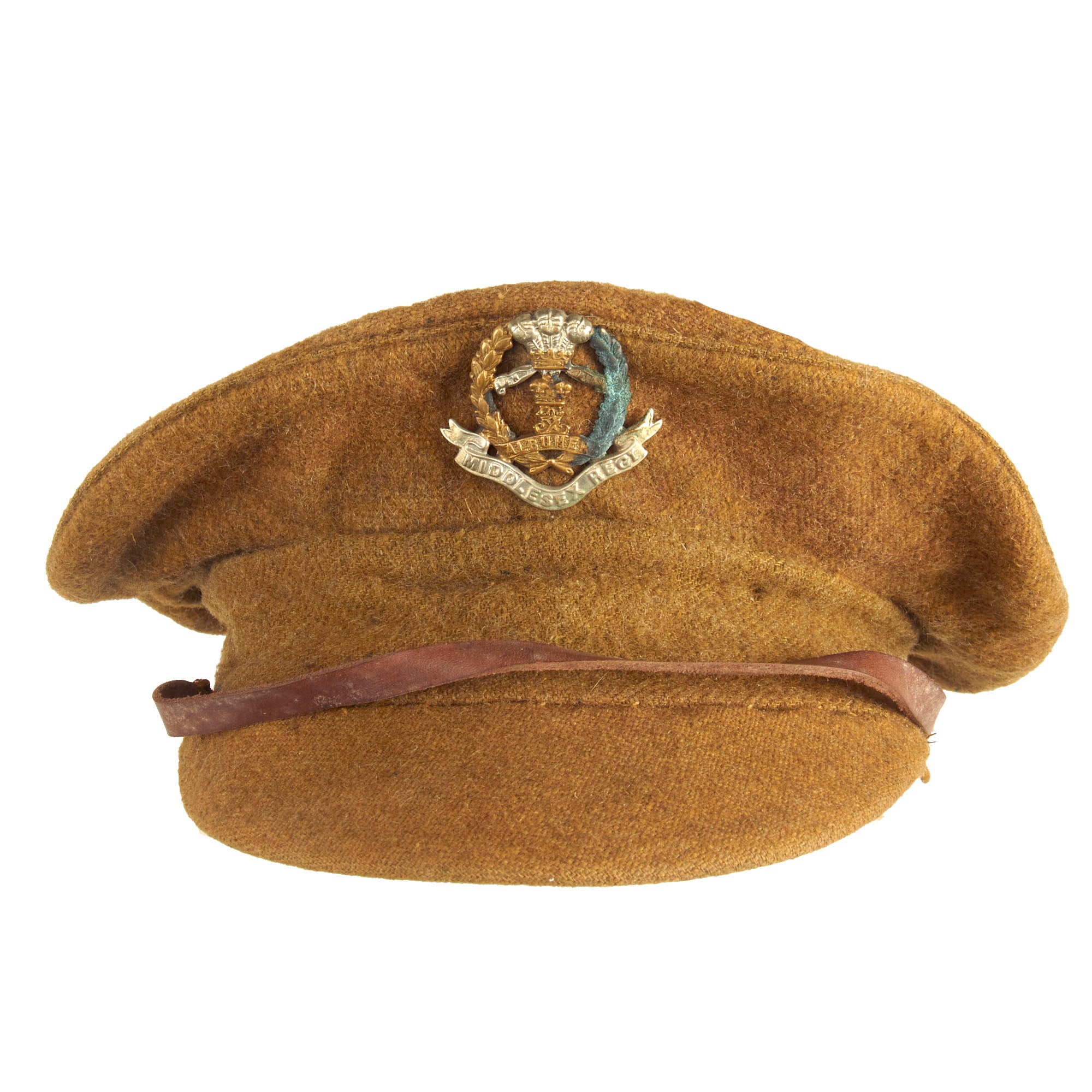 Original Item: Only One Available. This is a stunning example of an original vintage wool constructed trench cap hat as used by Great Britain in WW1. Features of note include a correct cut, shape, color, genuine wool construction, removed quilted lining with correct, as well as a fine brass regimental badge of the Middlesex Regiment.