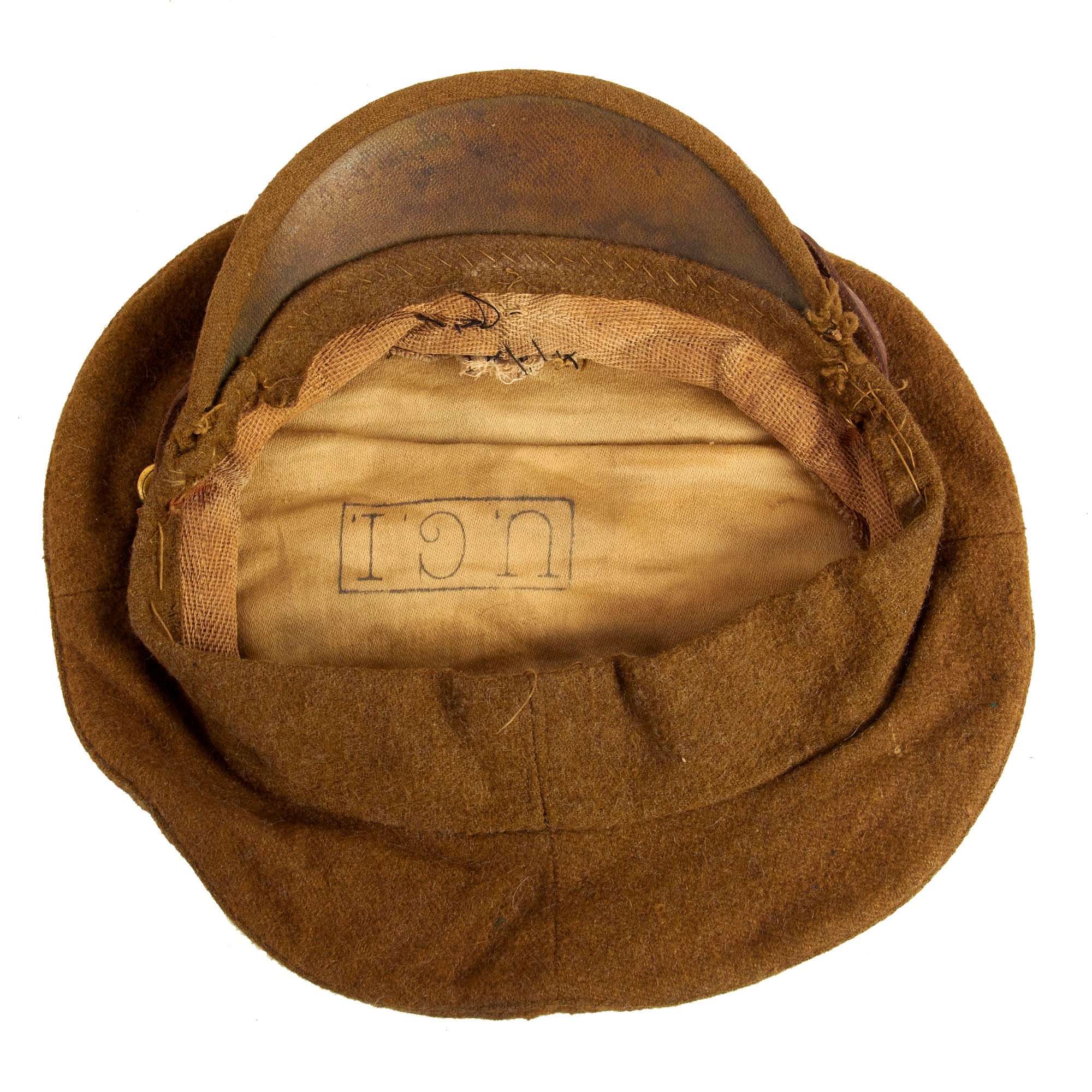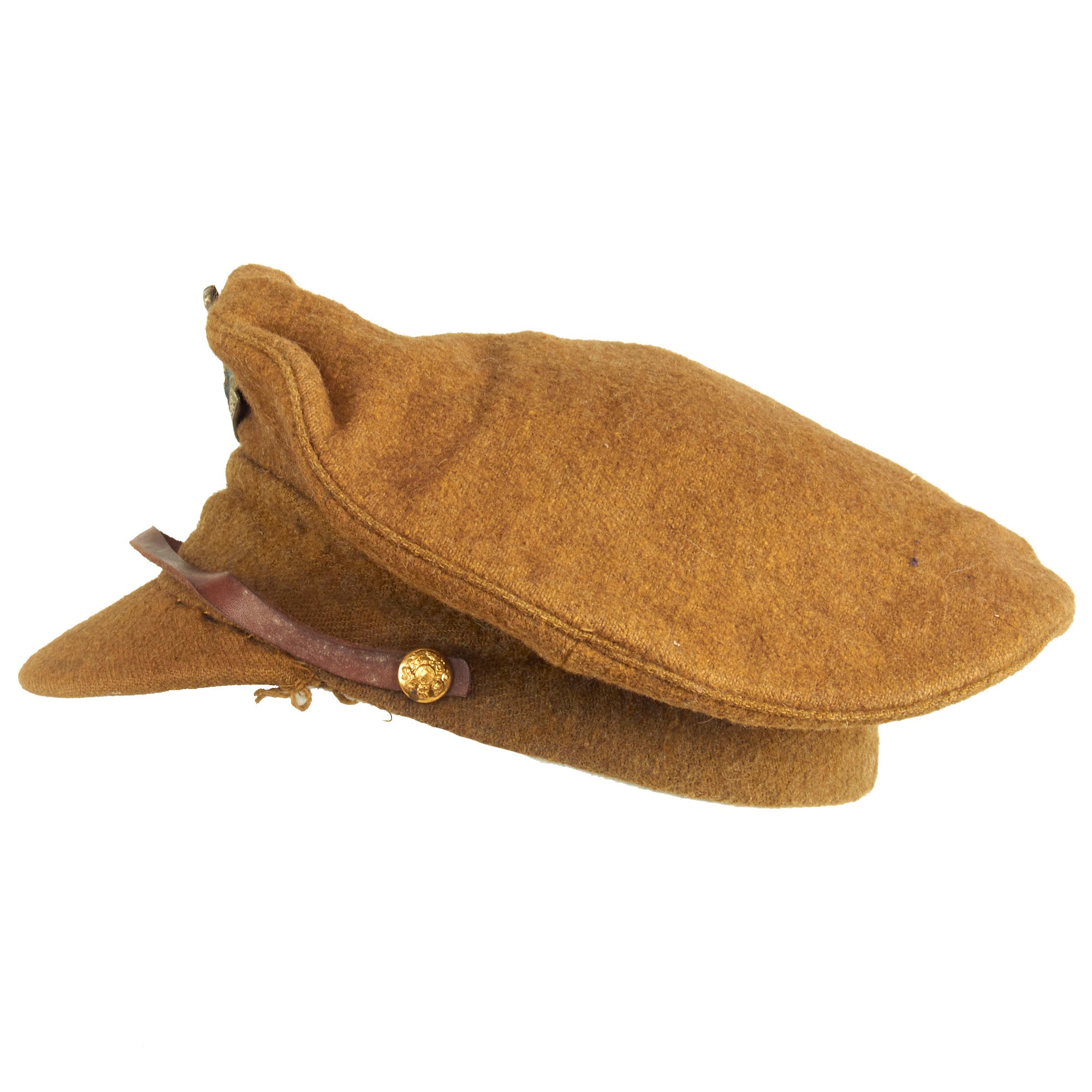 The Winter forage cap was made from the same drab wool as the SD cap but did not have rigid stiffening to the top, body, or visor. It was heavily padded and lined with quilted shirt material. It had an external neck flap that when not in use folded up onto the top of the cap and secured with a cloth slider. For this reason, there was no leather chinstrap.