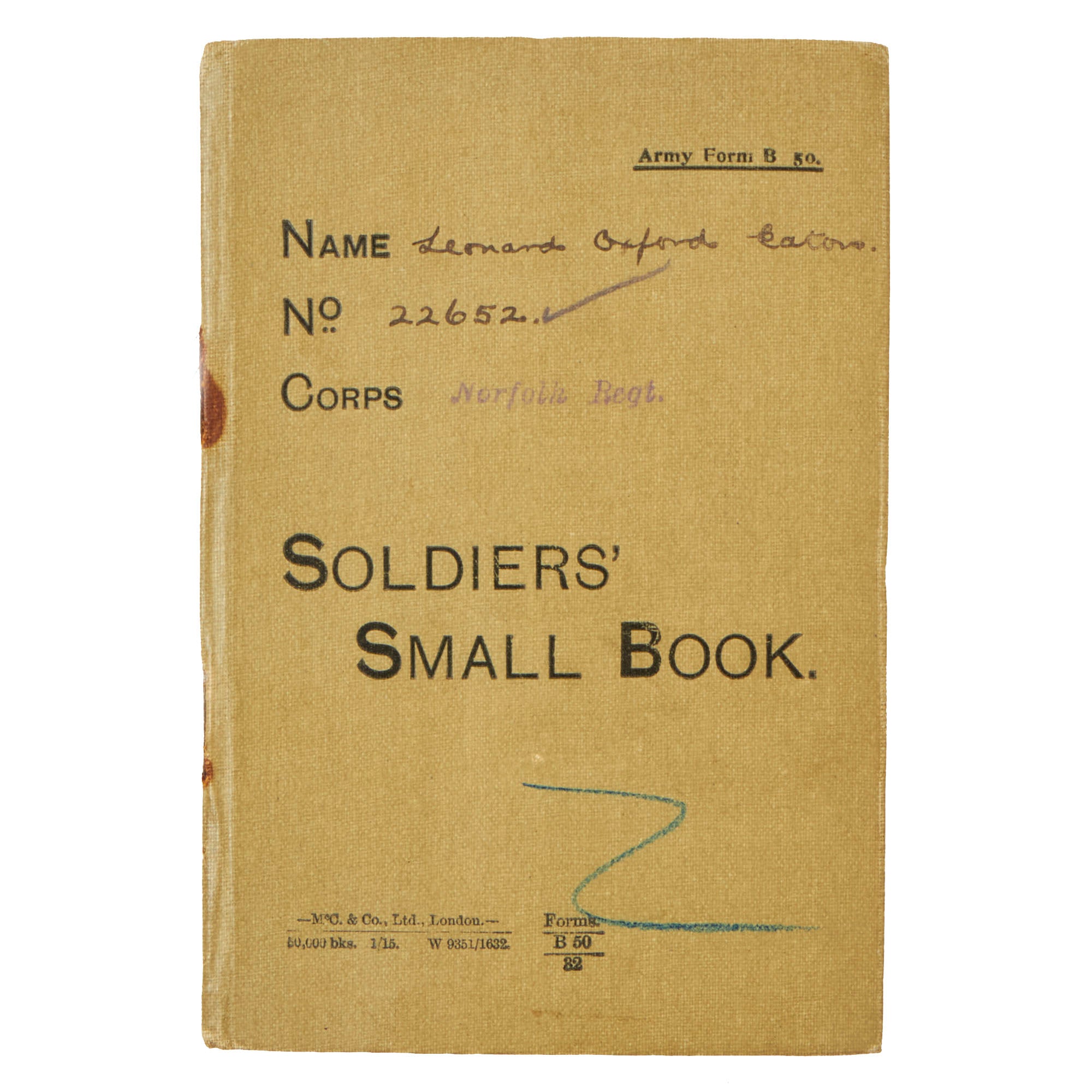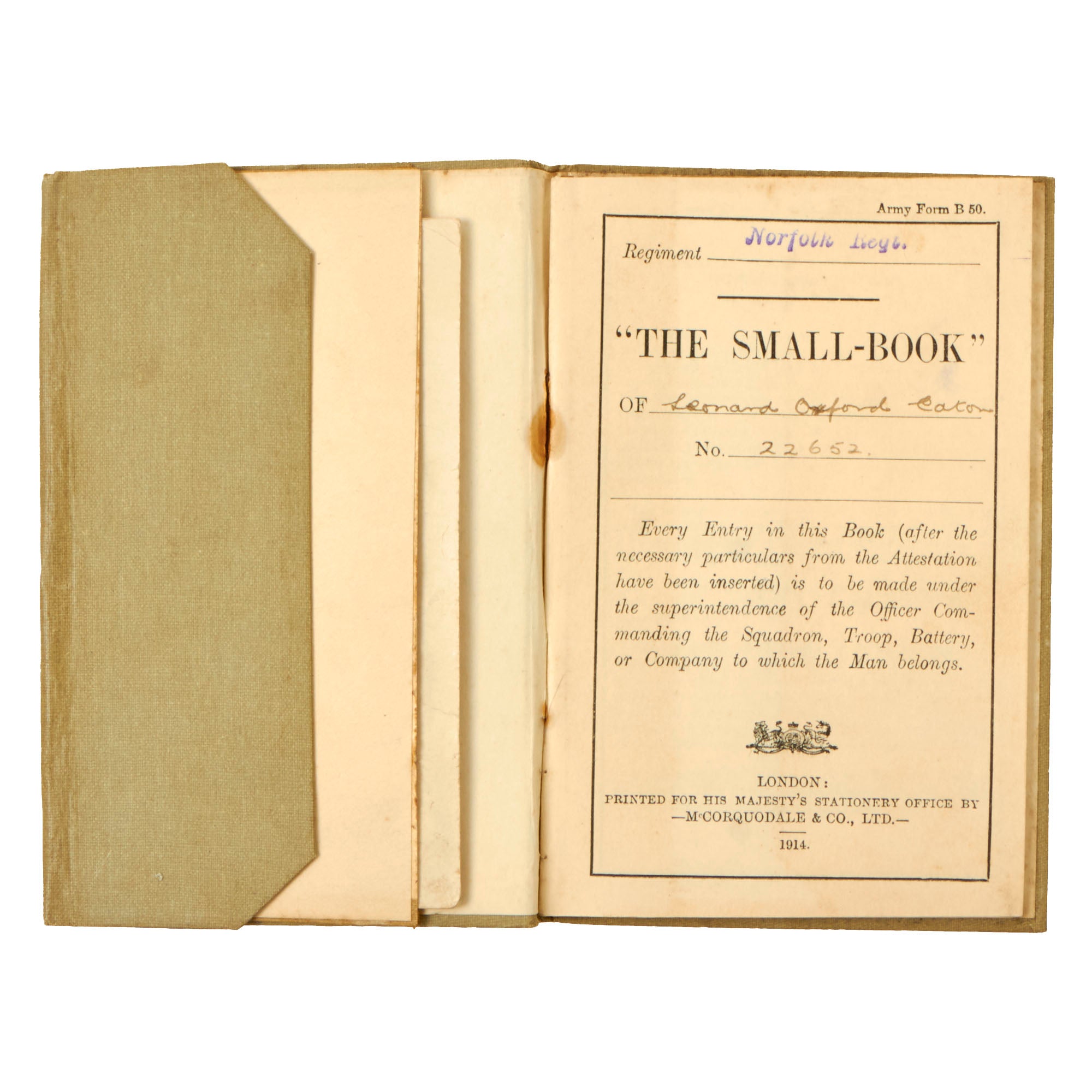 • Caton’s “Soldier’s Small Book” with his information and service number, 22652. There is a postcard photo of Caton inside with a studio stamp in Ispwich. Contains Caton’s service history and description.