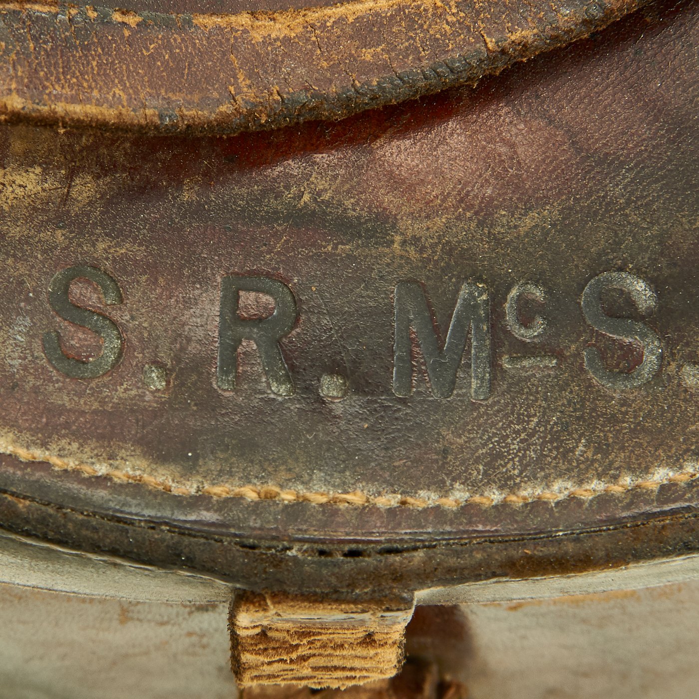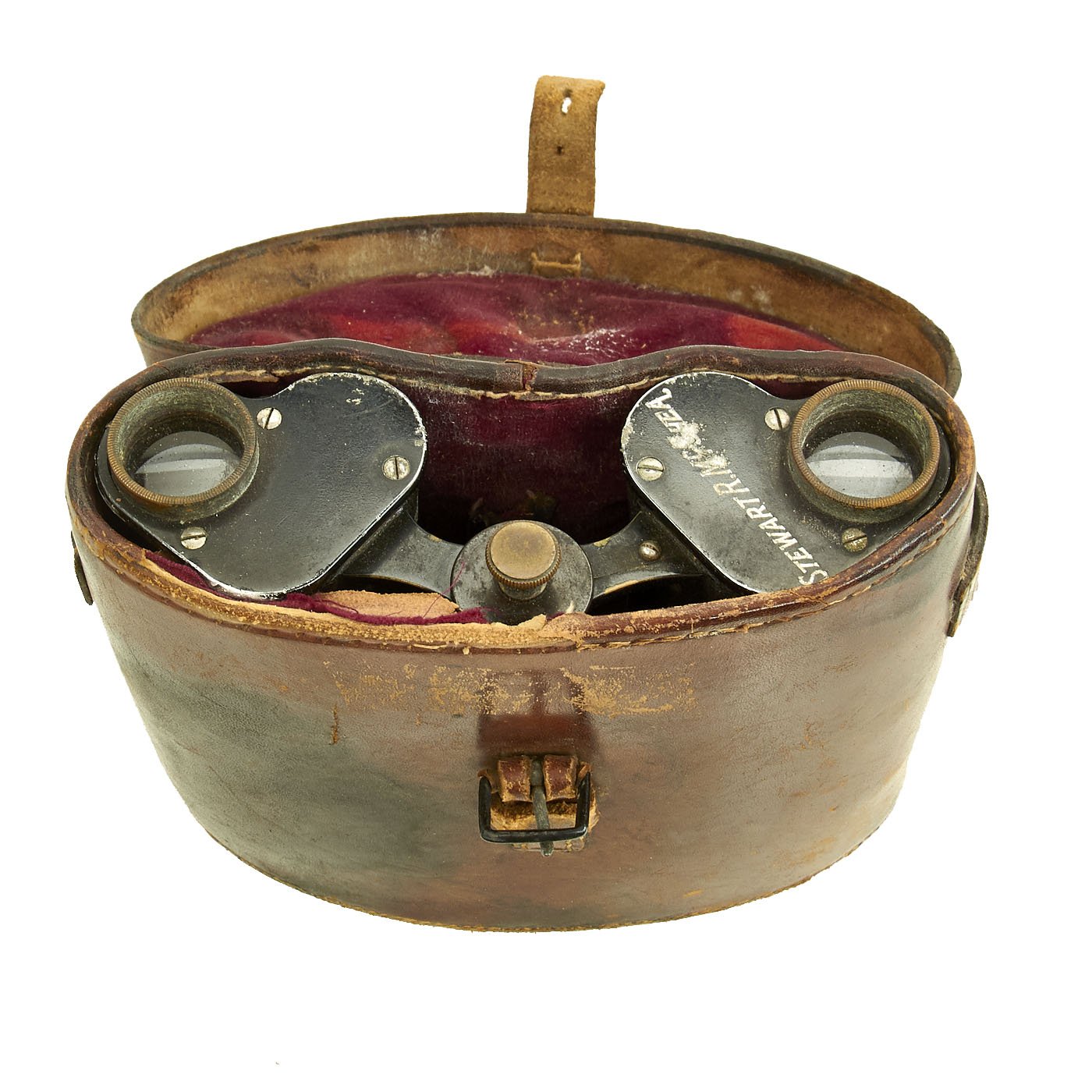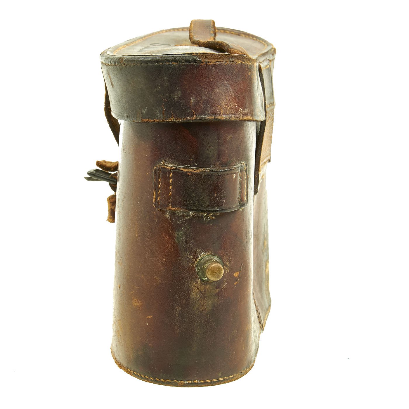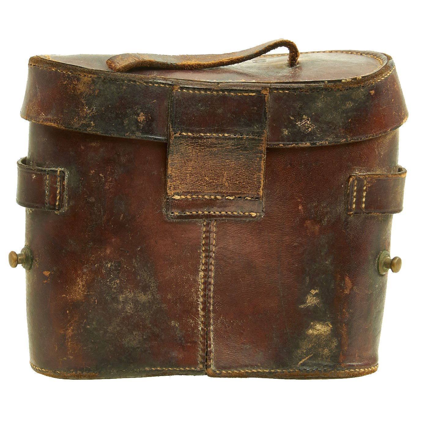 The case and binoculars are in very good condition, especially given that these items are a century old. The finish on the case is mostly present, with some splitting on the corners. The shoulder strap is unfortunately missing from the case, and the lid handle is torn. However the top is embossed nicely with S. R. McS., the initials of the soldier who owned them. The leather has shrunk a bit, and the closure strap is in delicate condition.